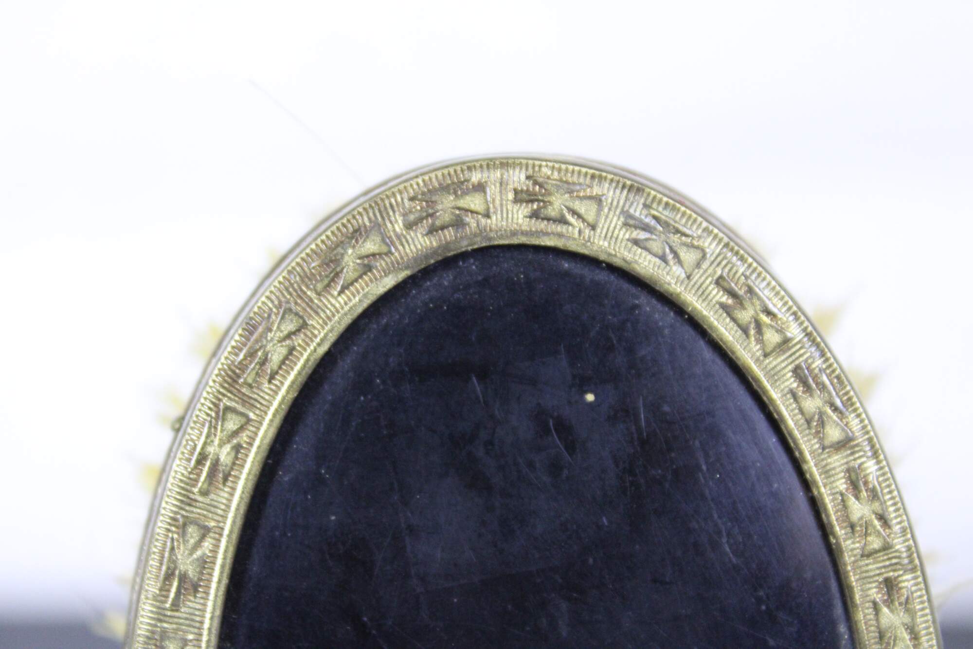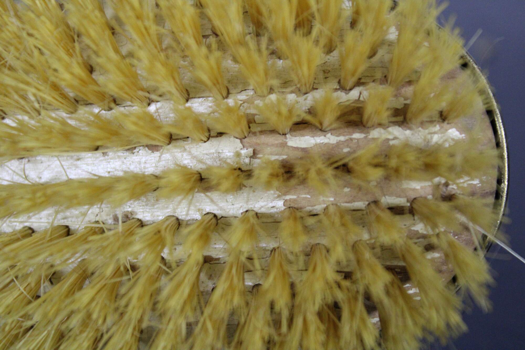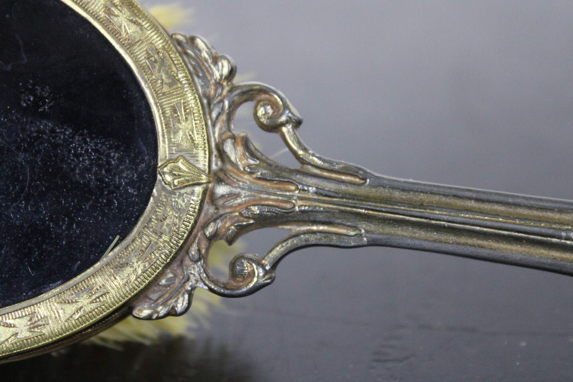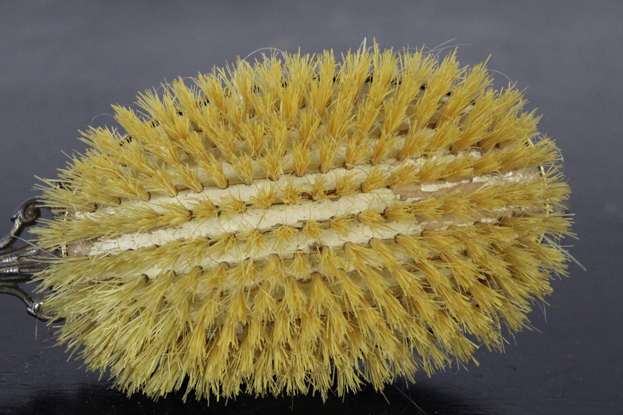 Antique brass handled hair brush with wooden bristle pad, horse hair bristles, black plastic back and guilloche enamel cameo accent.