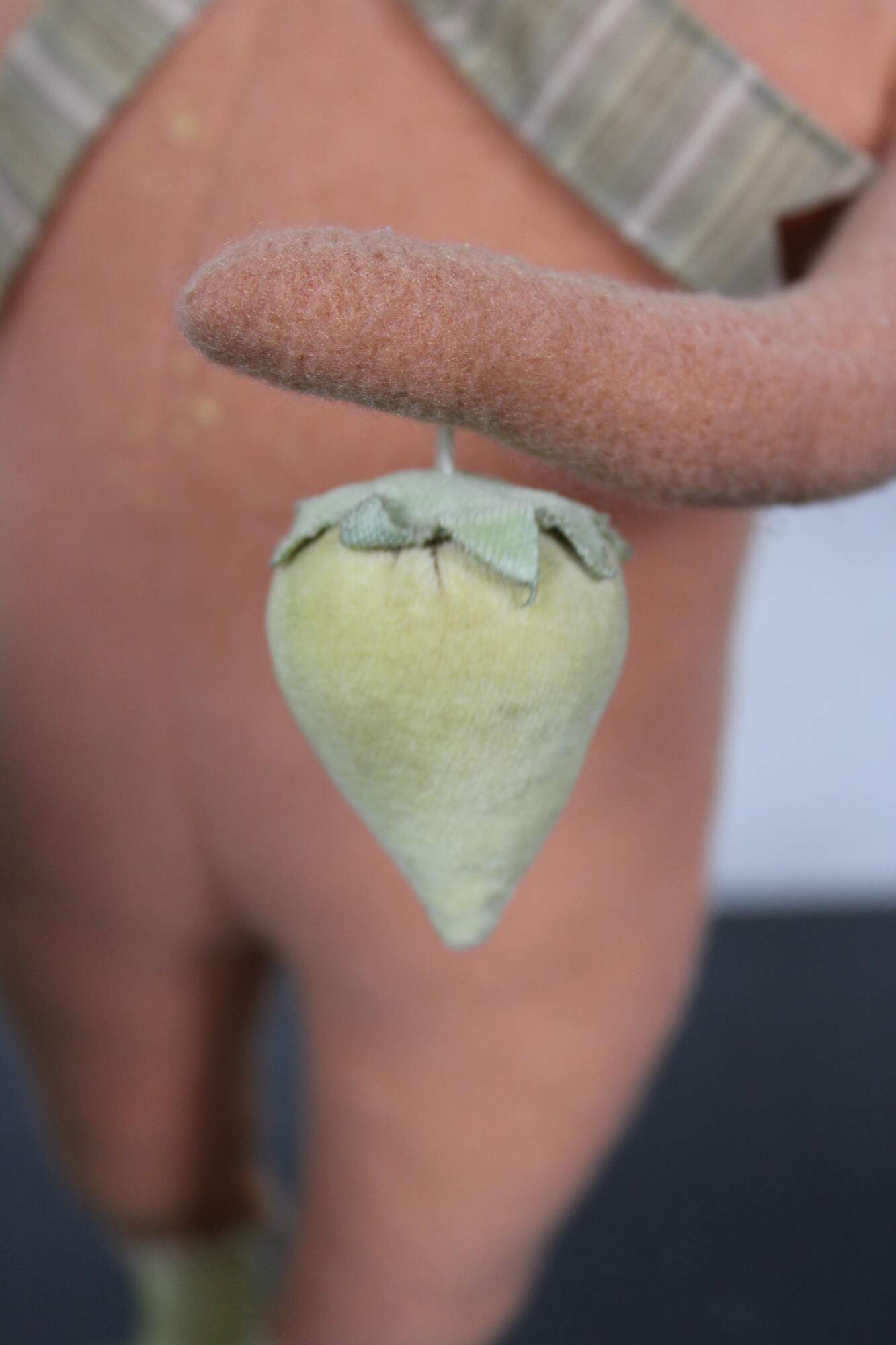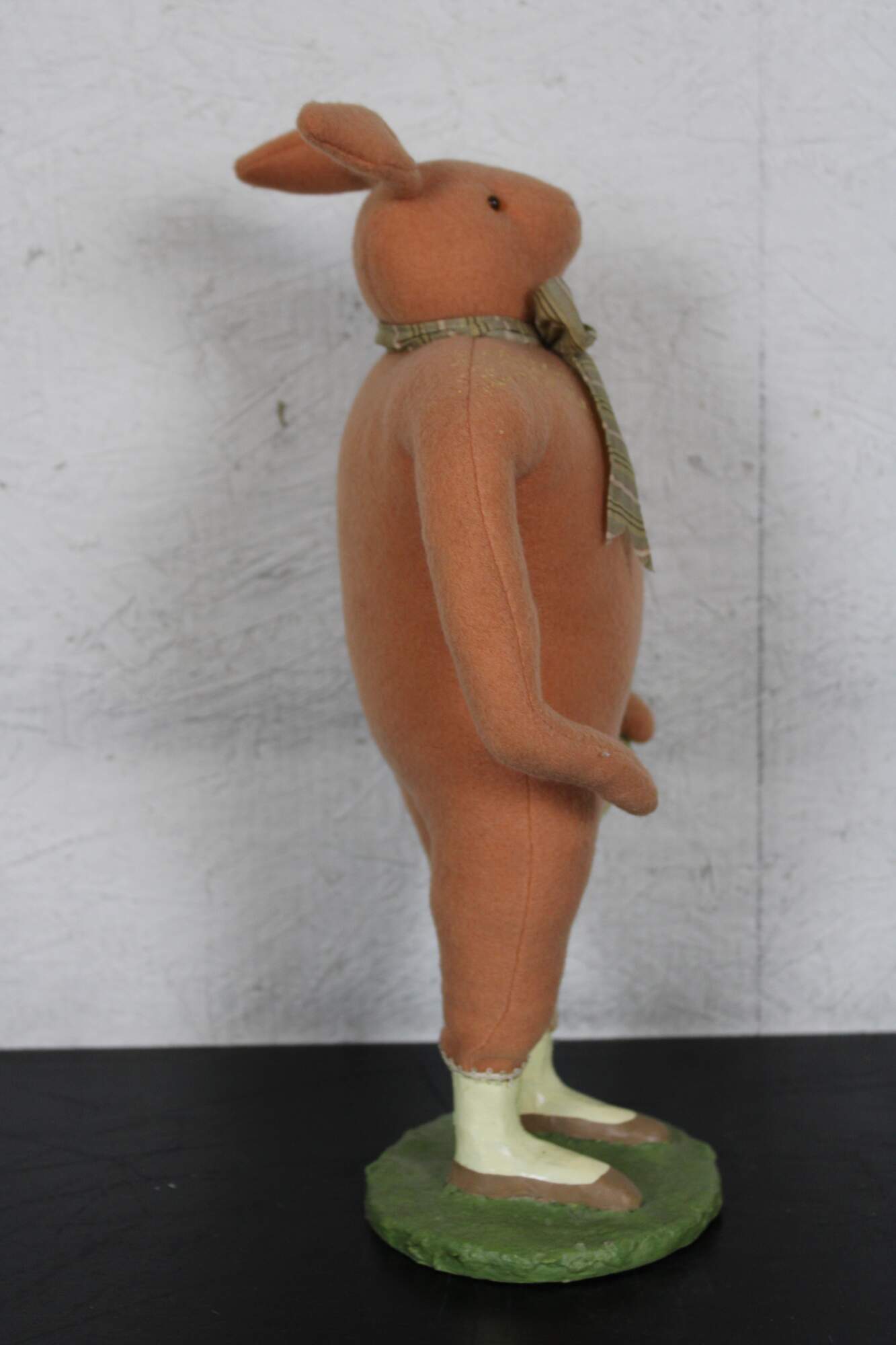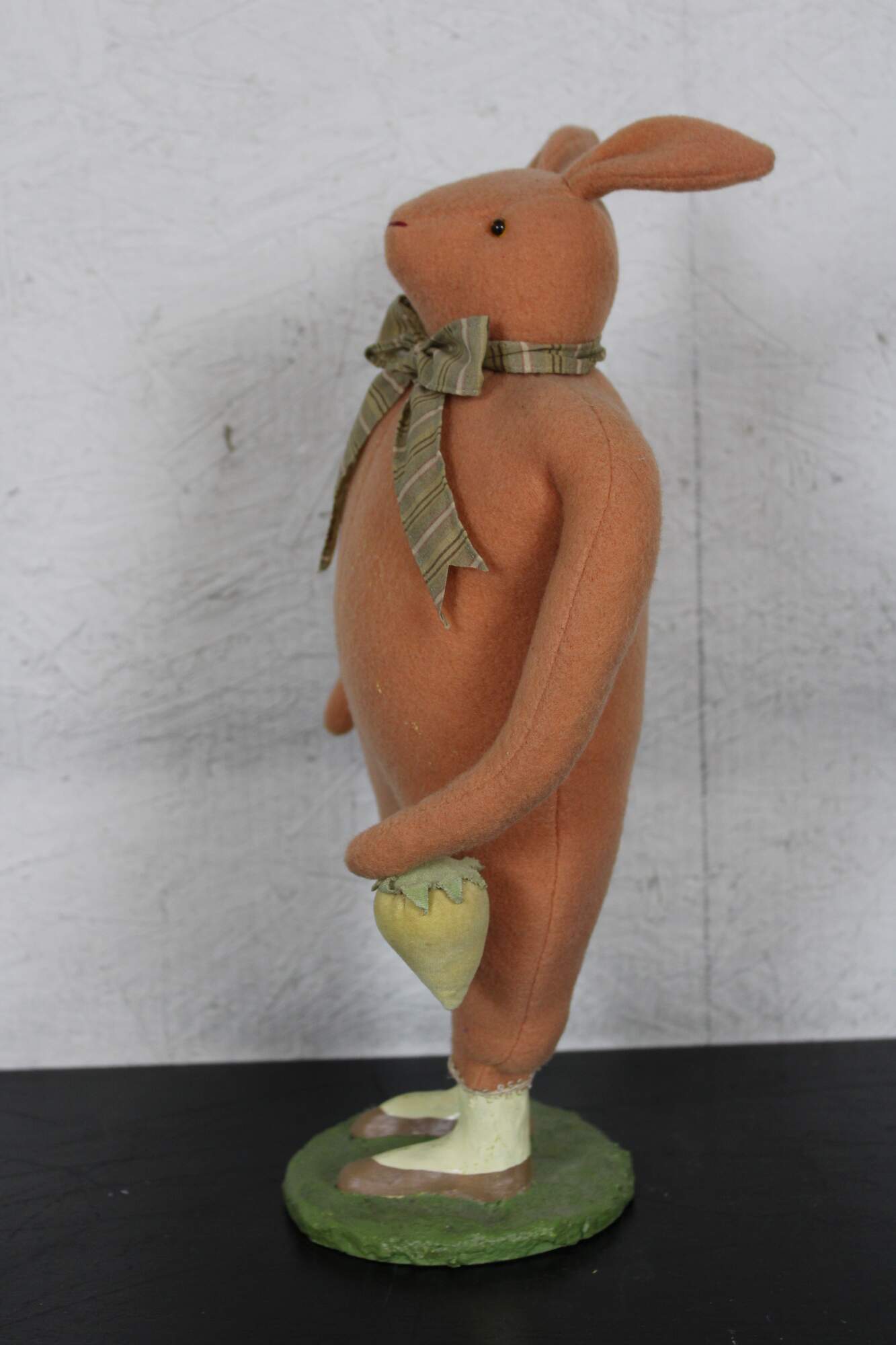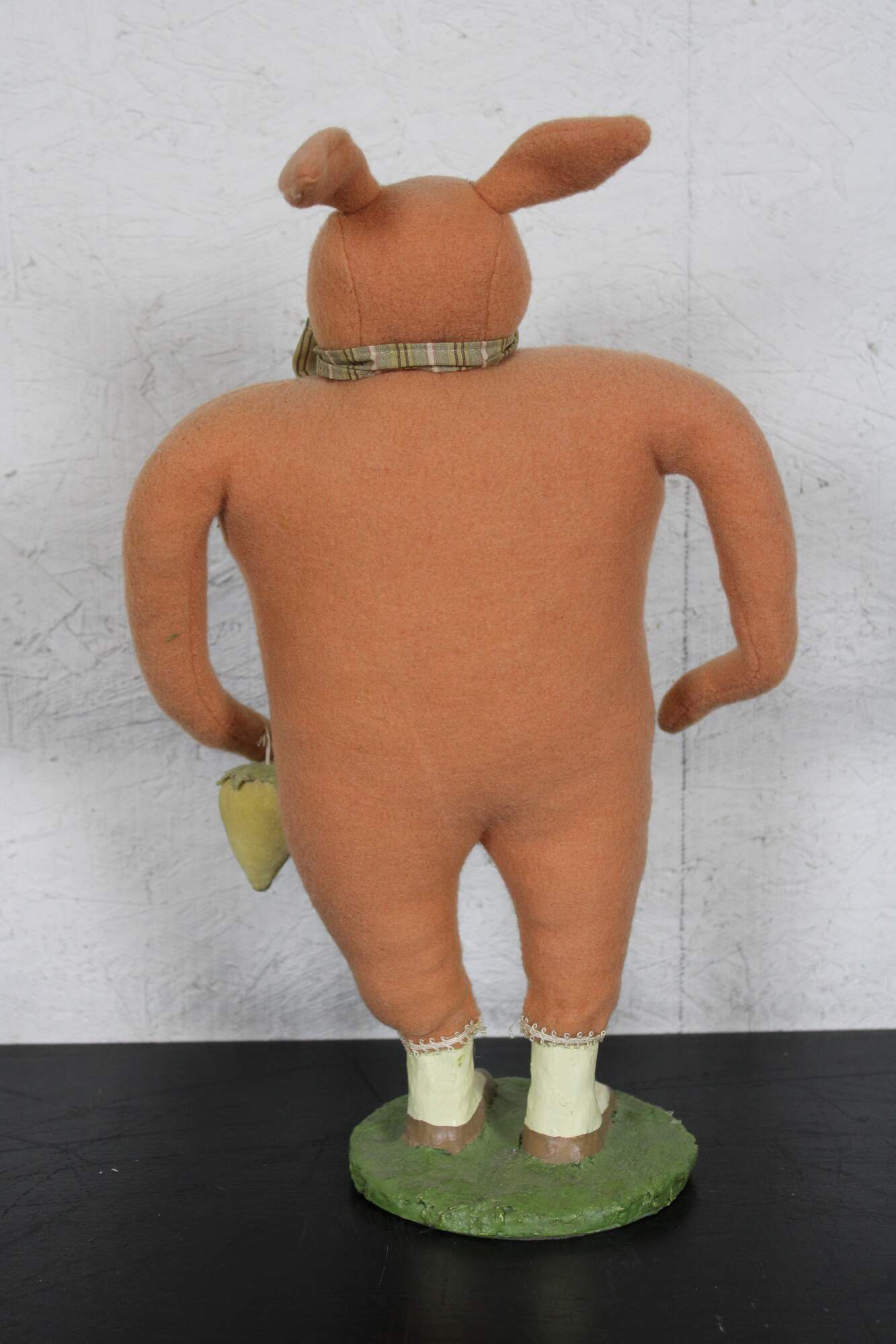 Rare, one of Cody Fosters early original works. Folk art style stuffed animal figurine in the form of a pink rabbit wearing a bow tie and holding a yellow velvet strawberry, standing on a plaster base with painted shoes.
