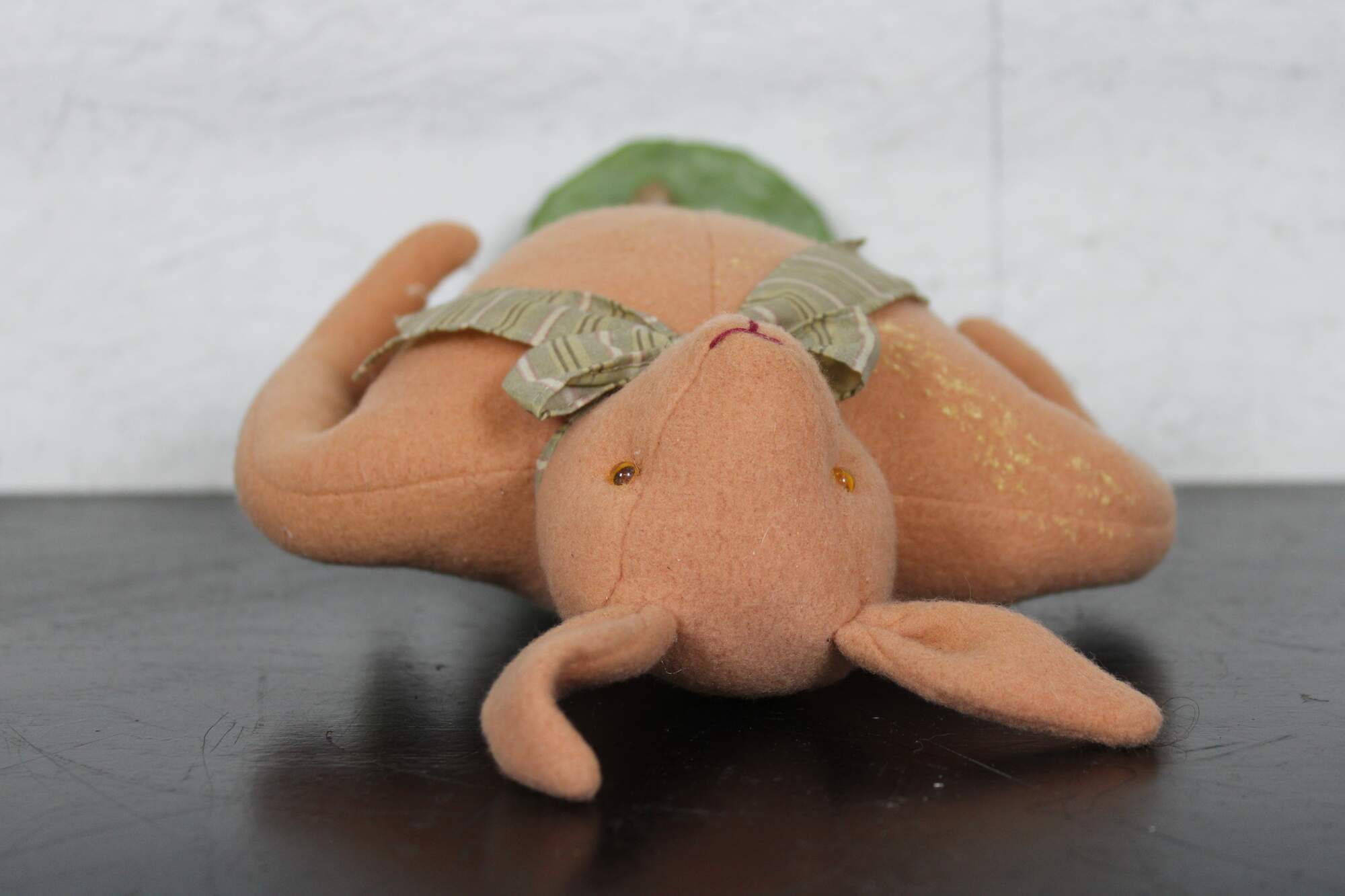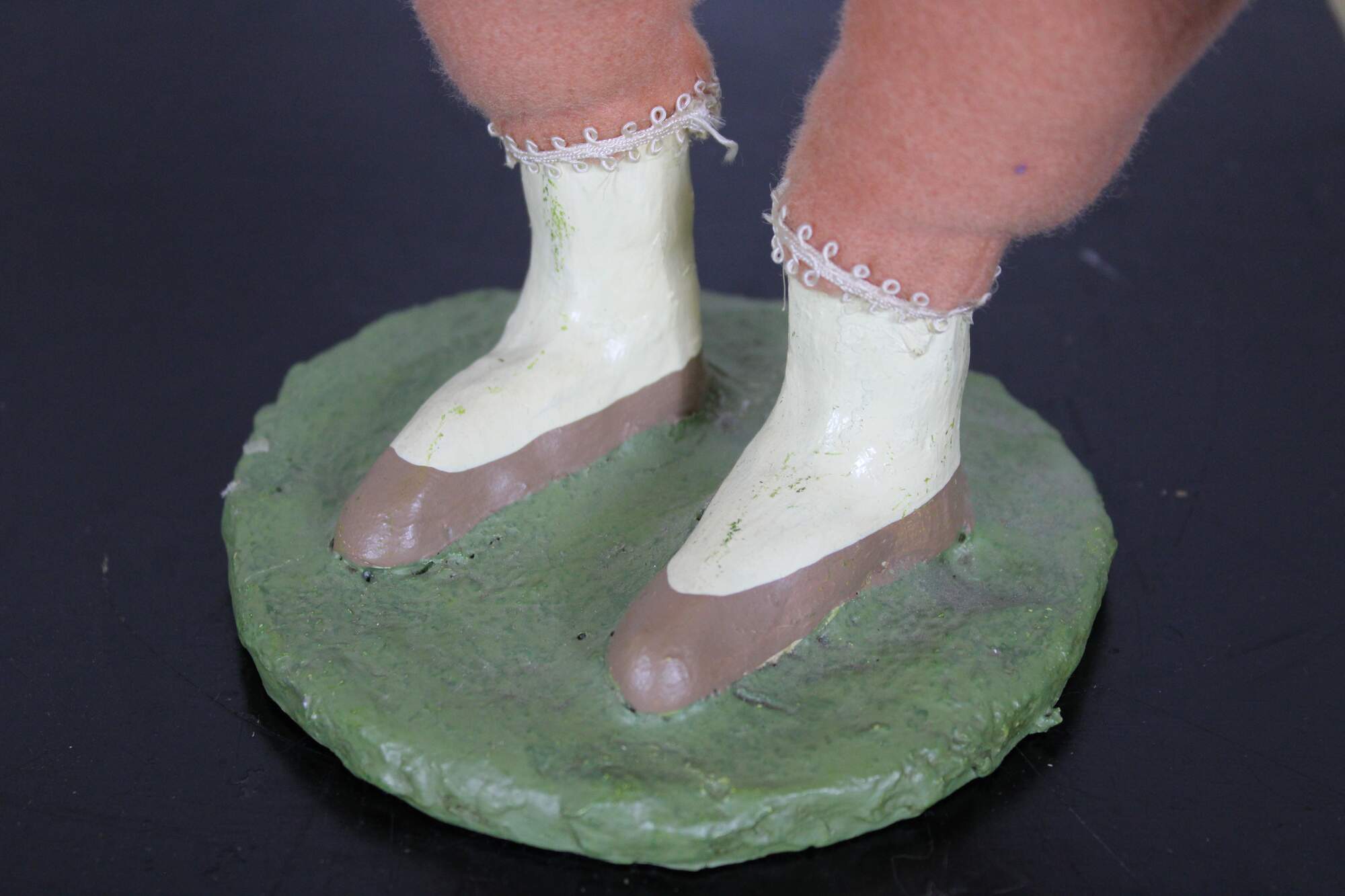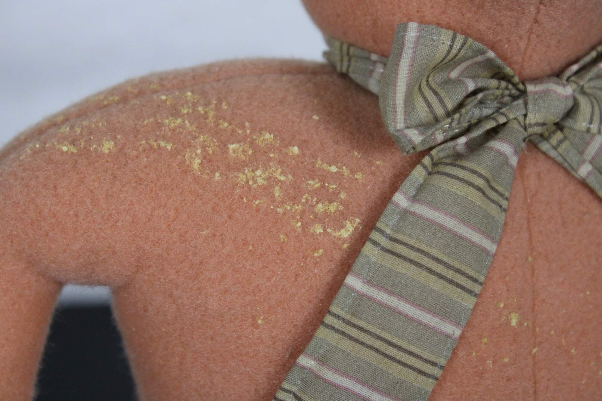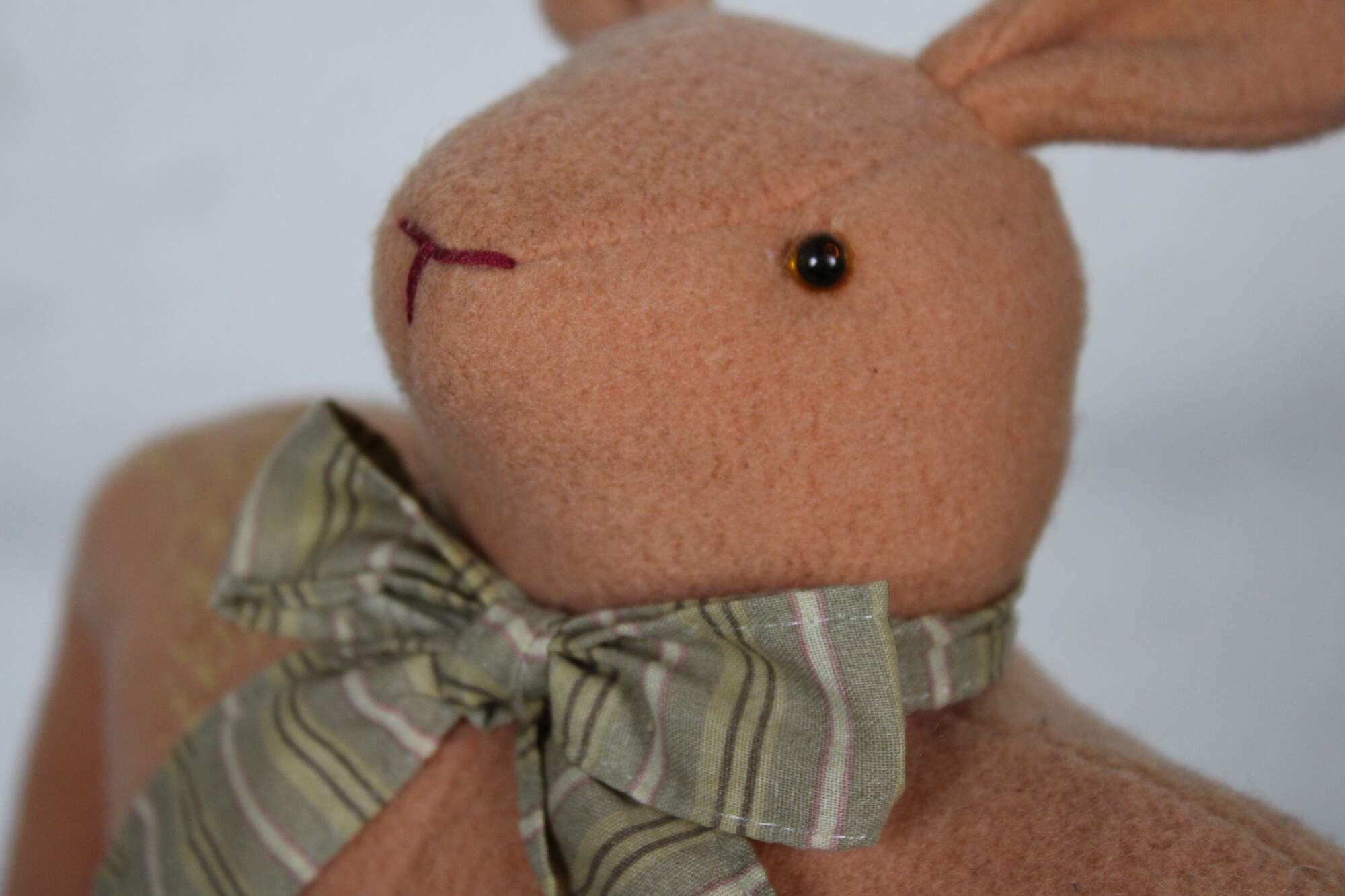 Rare, one of Cody Fosters early original works. Folk art style stuffed animal figurine in the form of a pink rabbit wearing a bow tie and holding a yellow velvet strawberry, standing on a plaster base with painted shoes.