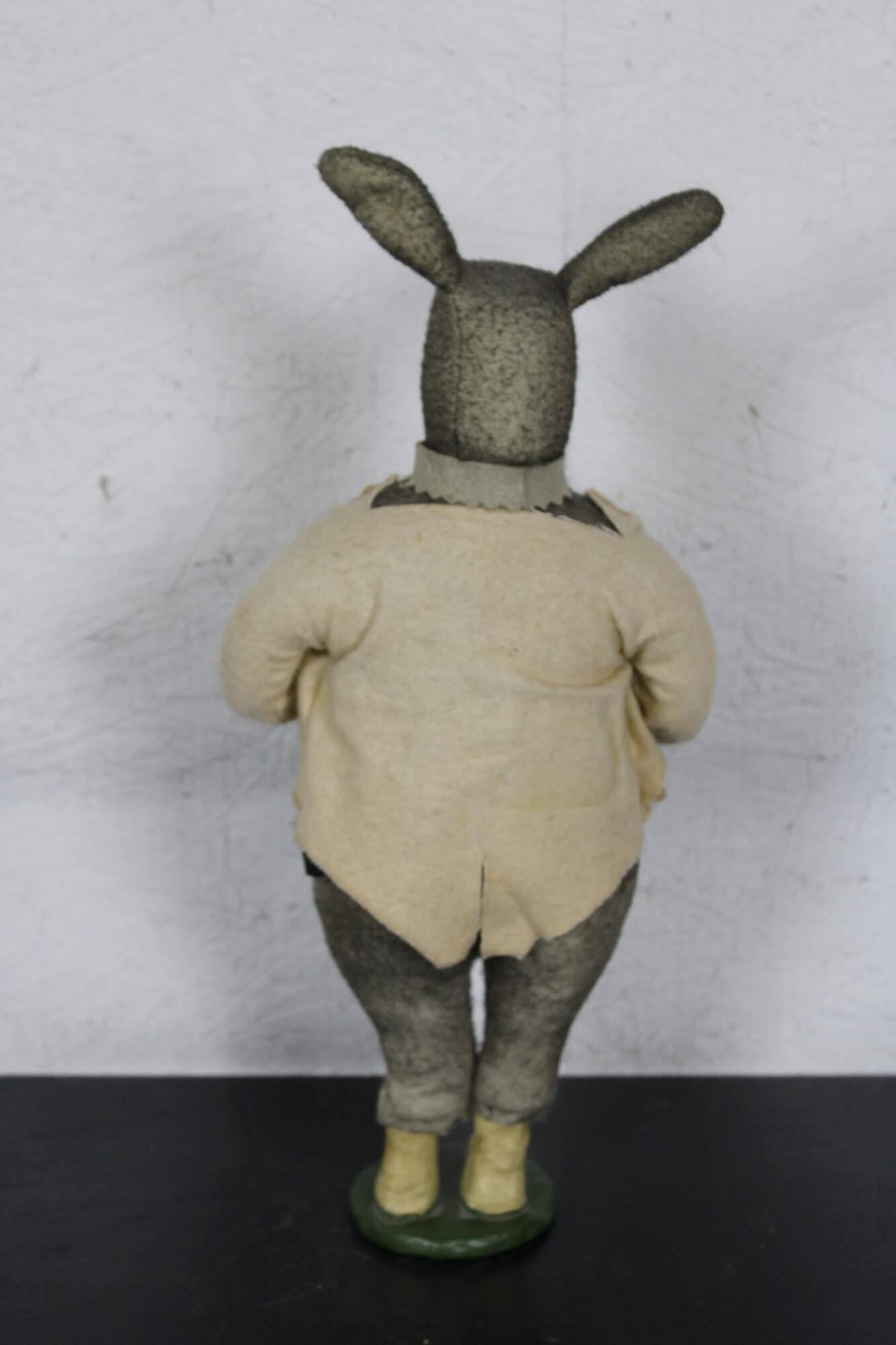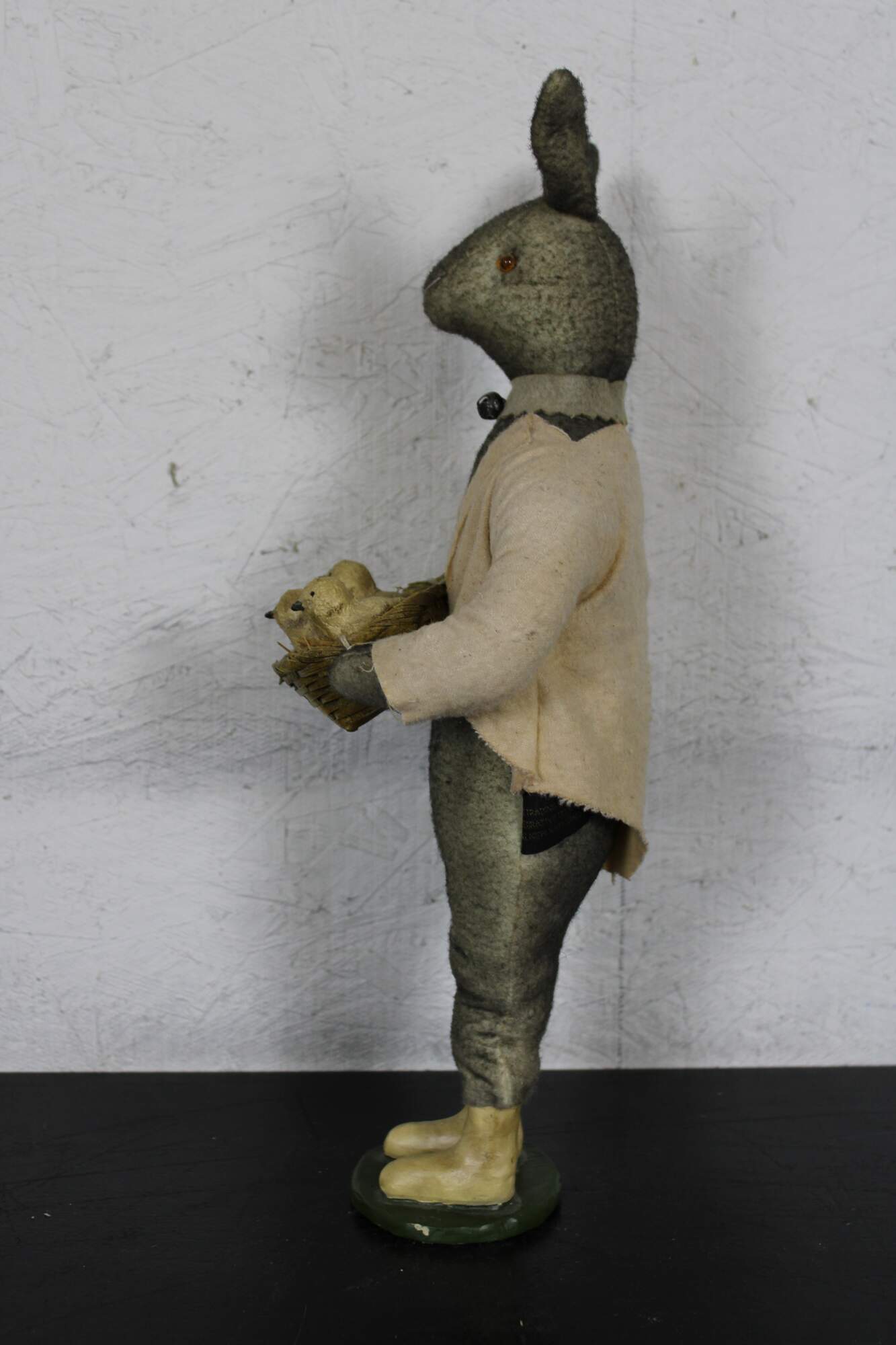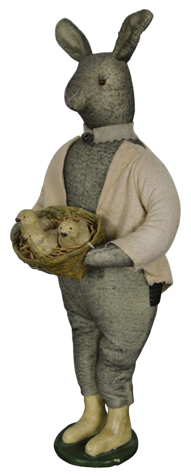 Folk art style stuffed animal ornament figurine in the shape of a gray rabbit wearing a jacket and collar, holding a basket of chicks, standing on a plaster base with painted shoes. Designed by Cody Foster for ESC Trading Company.