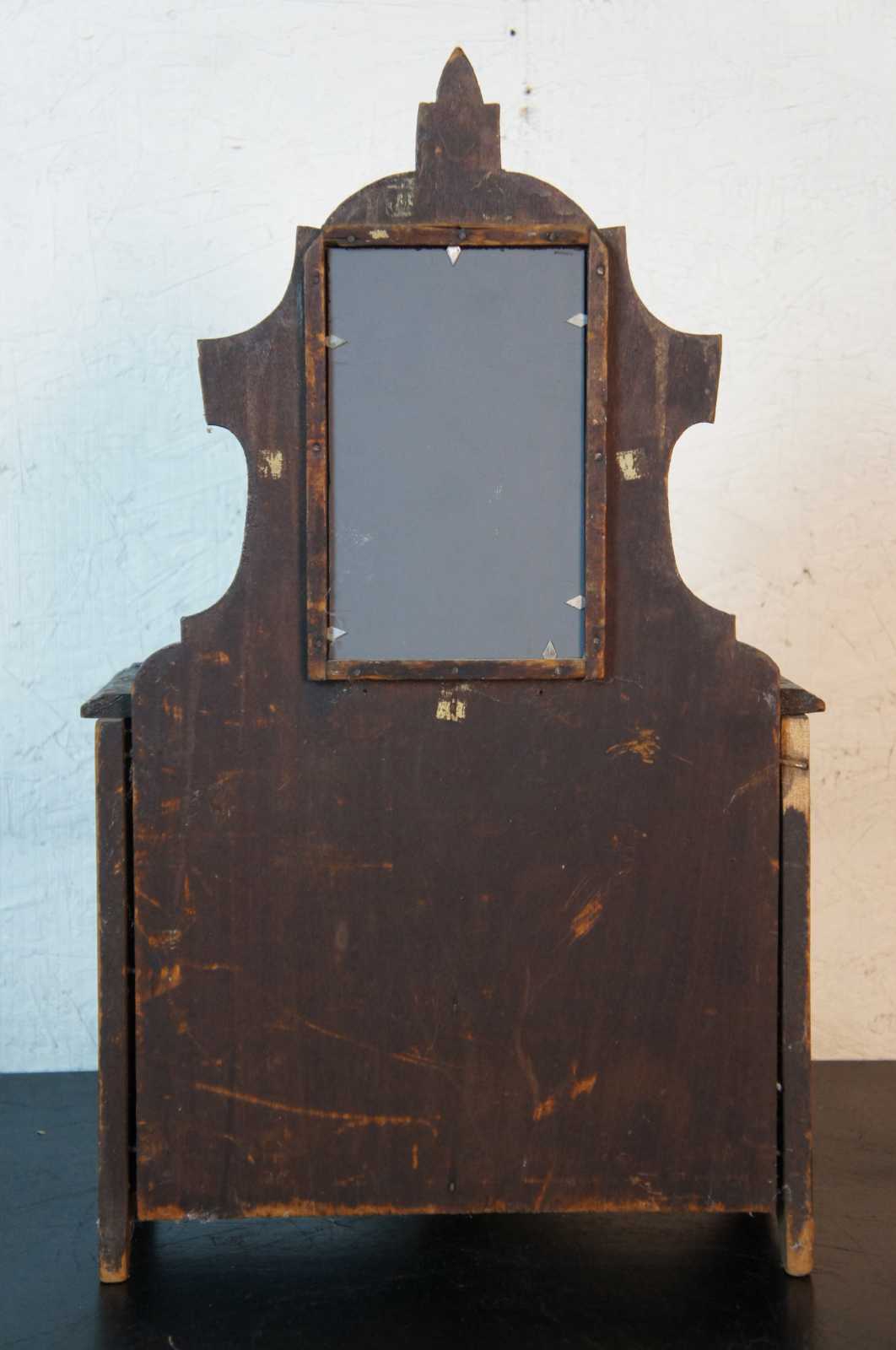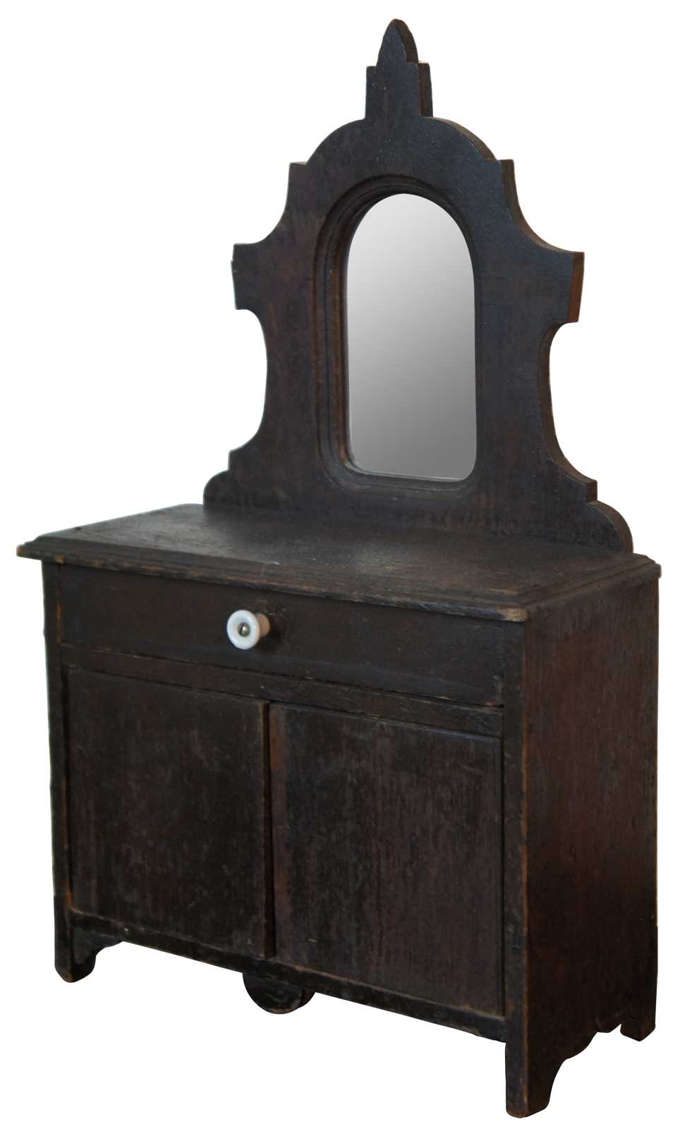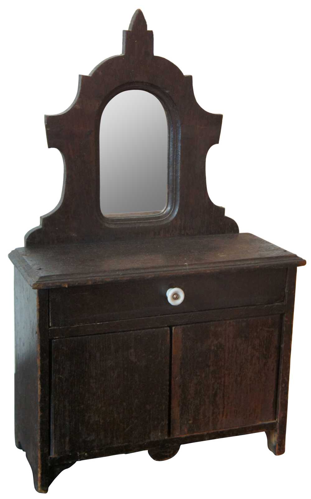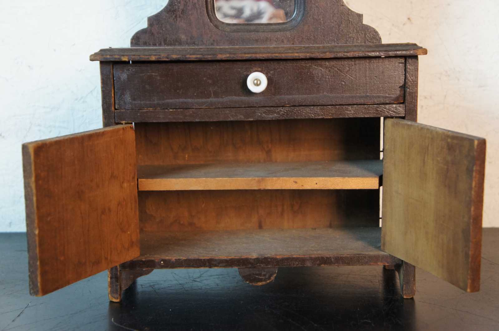 Antique 19th century Victorian salesman sample miniature pine mirrored dresser with one drawer over a two shelf cabinet.
