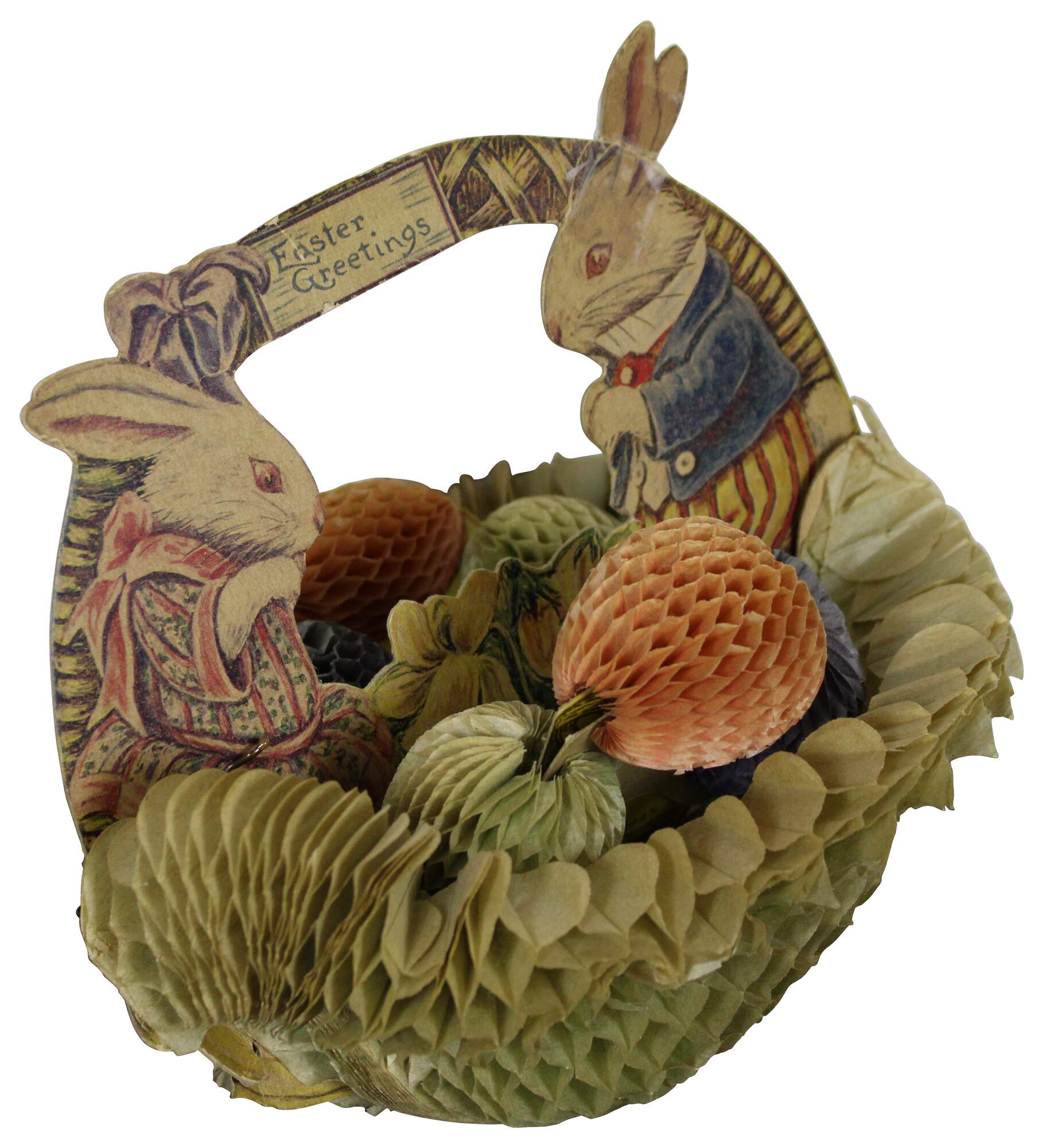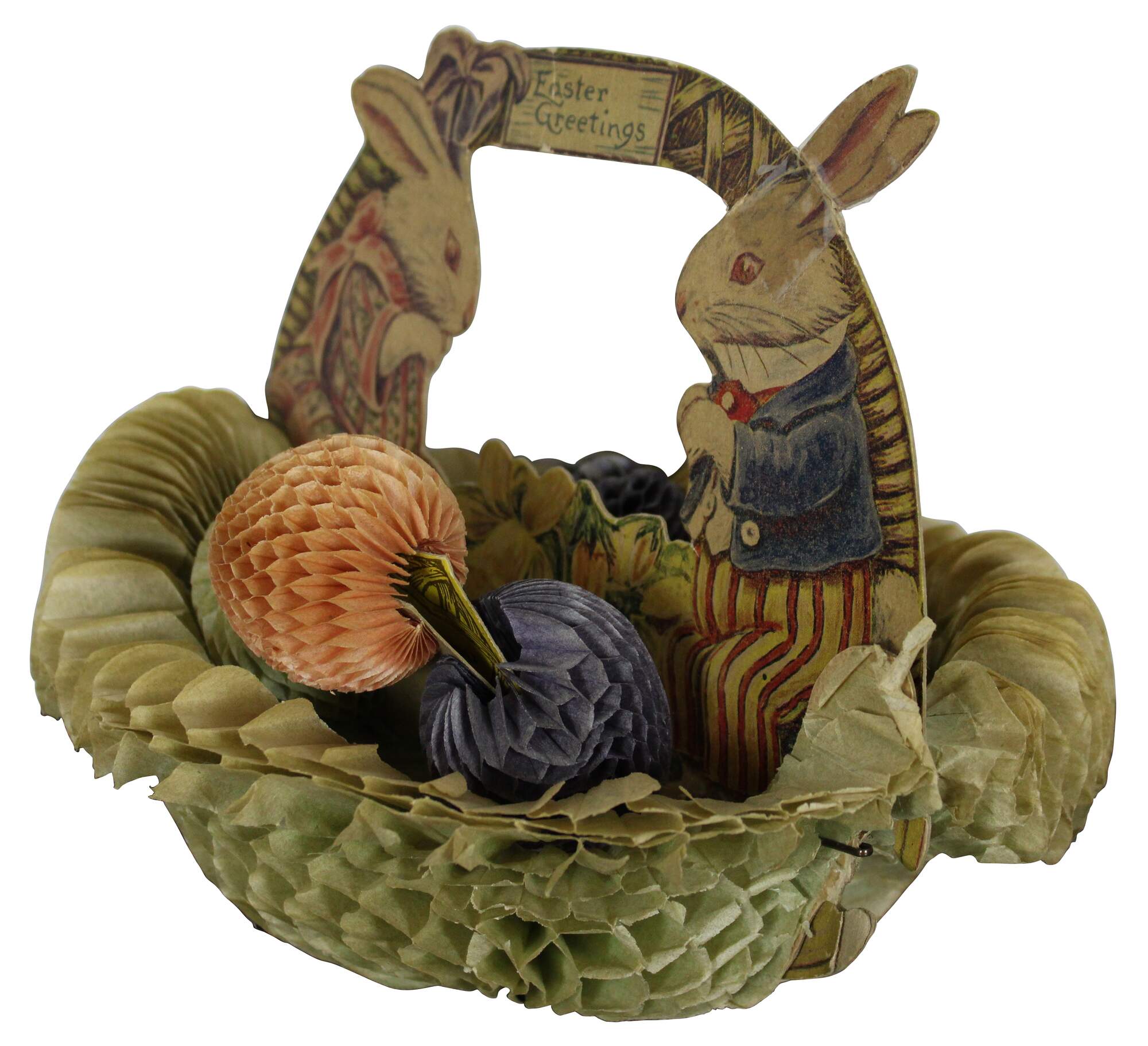 Rare antique folding cardboard and honeycomb tissue paper Easter basket by Beistle Company, patented 1925. Decorated with anthropomorphic rabbits on either side of the handle with the legend “Easter Greetings.” the To and From on the opposite side is marked for the original recipient.