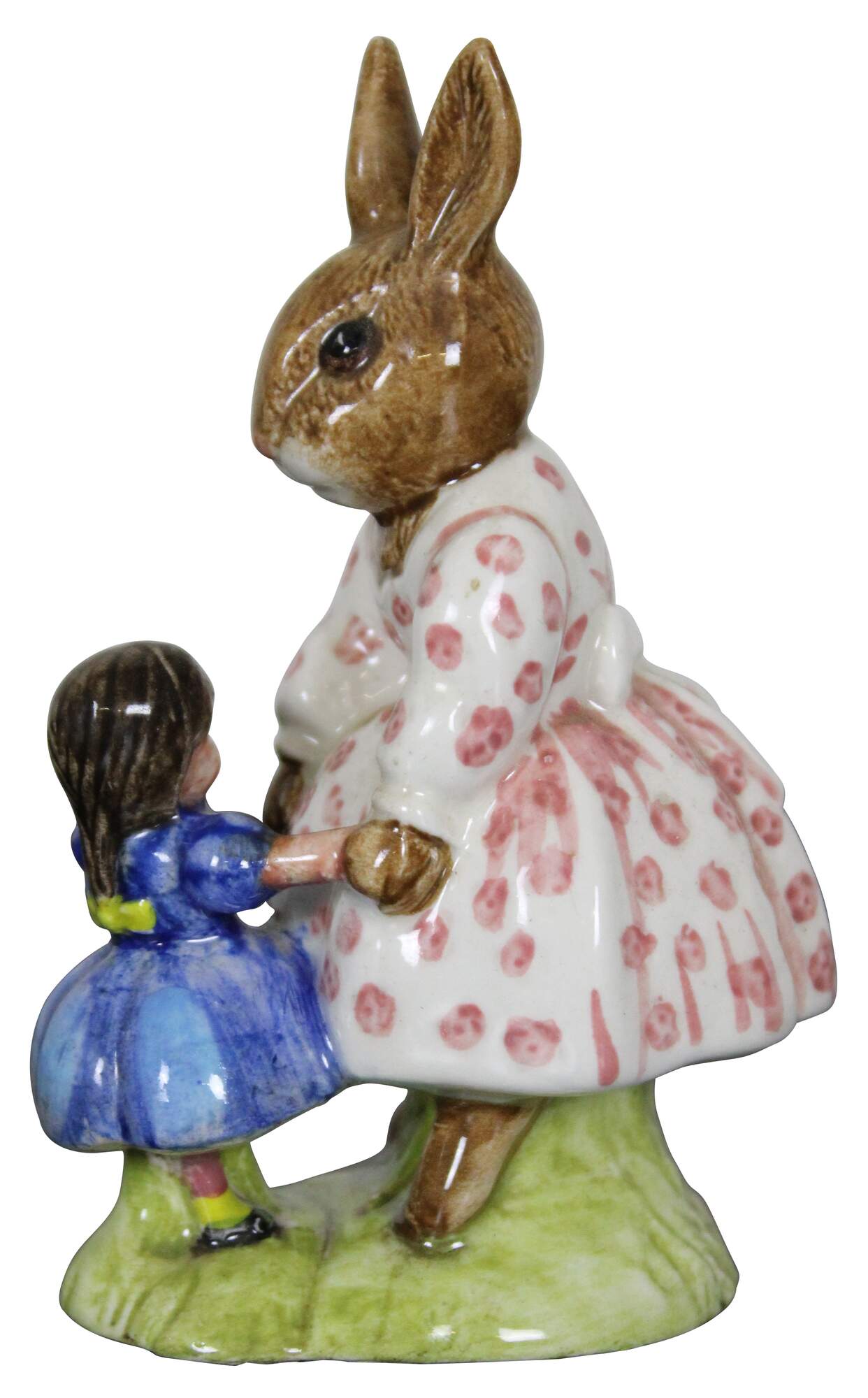 Vintage 1972 Royal Doulton Dollie bunnykins figurine number DB8 titled “Playtime” showing an anthropomorphic rabbit in a floral dress playing with a small girl in blue.