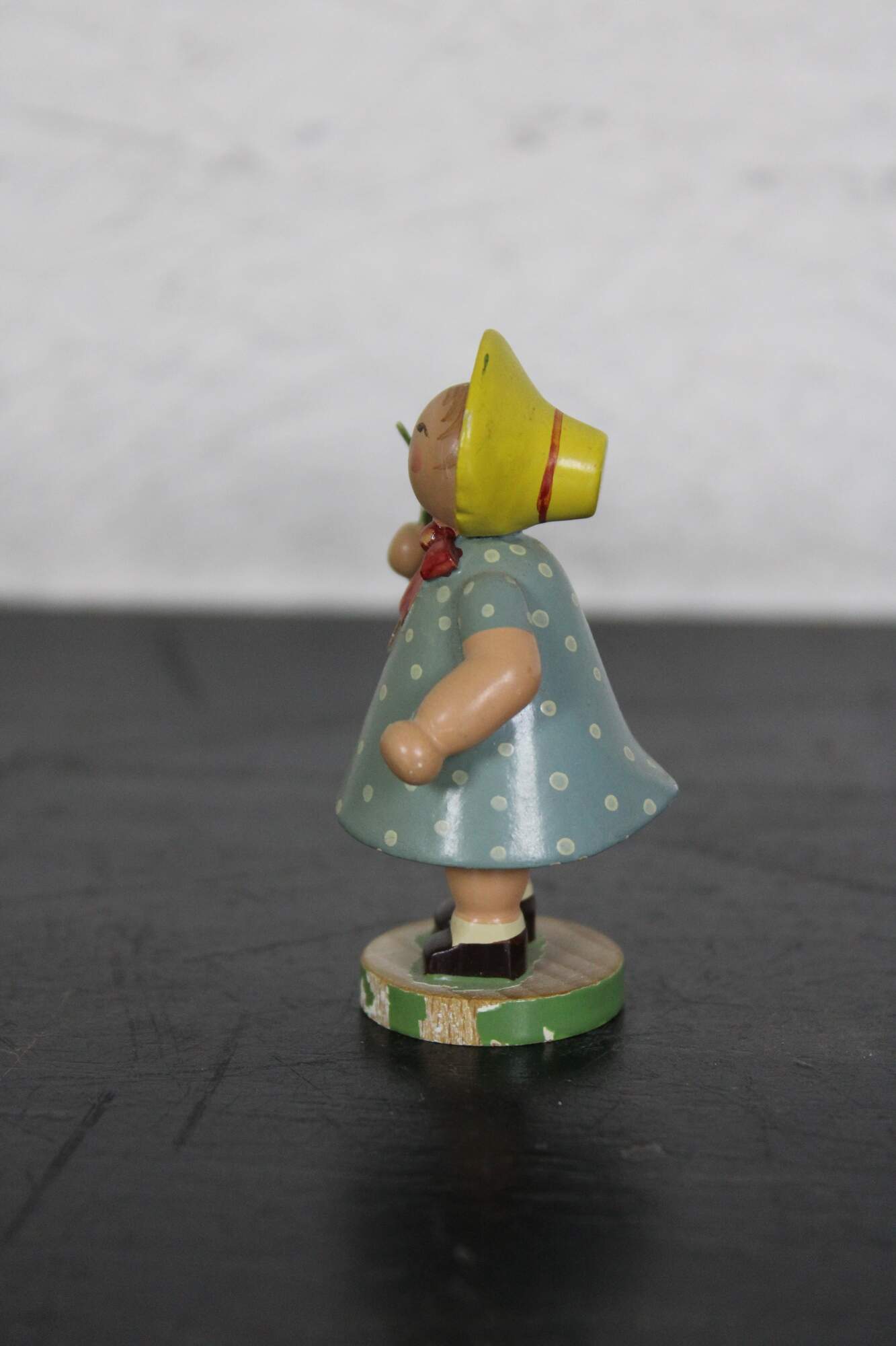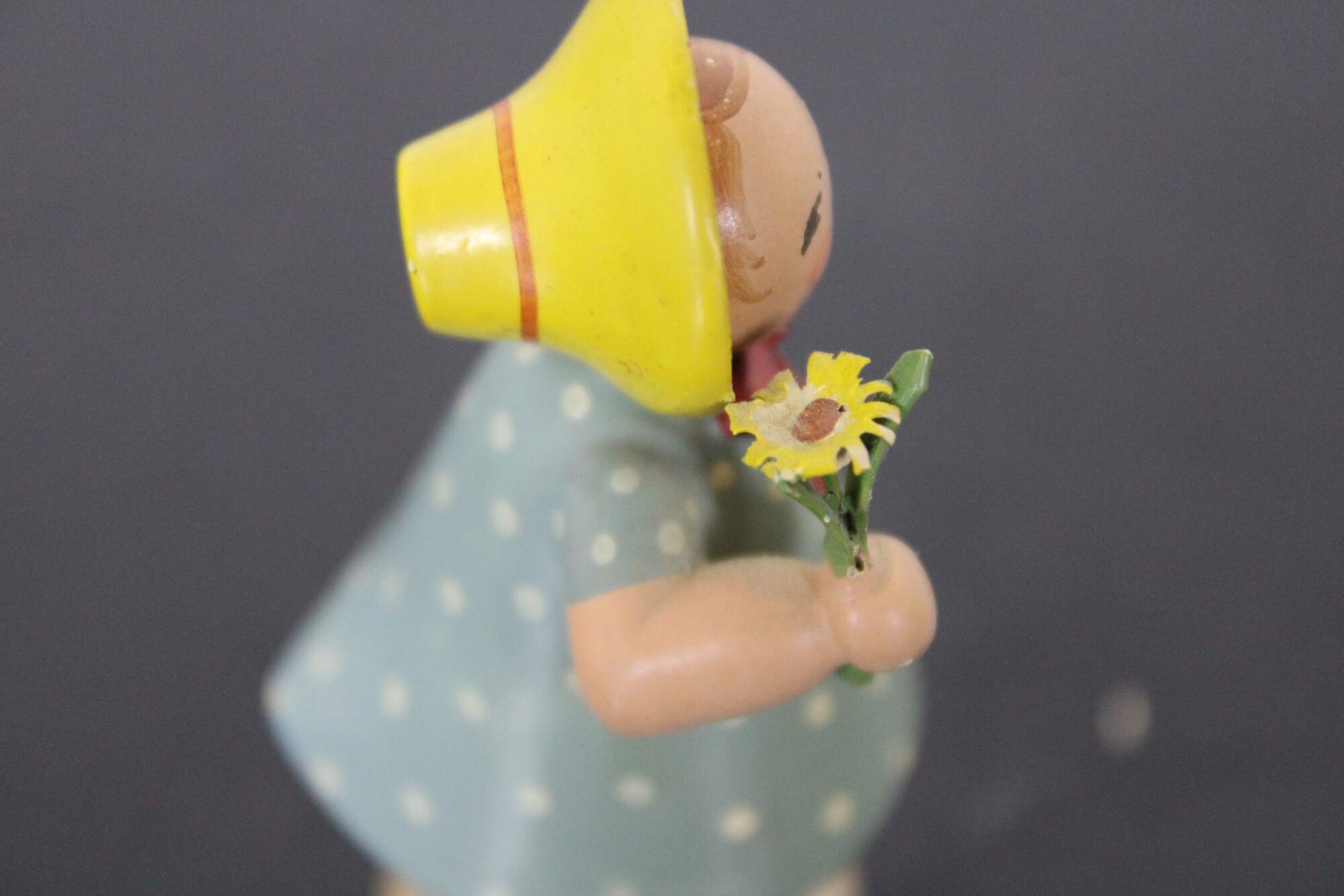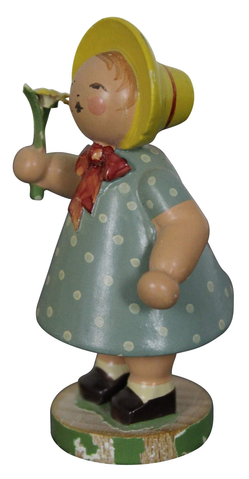 Vintage Expertic German Erzgebirge W K hand painted wood figurine of a young maiden girl wearing a bonnet, dressed in a blue polka dot dress, holding a daisy.