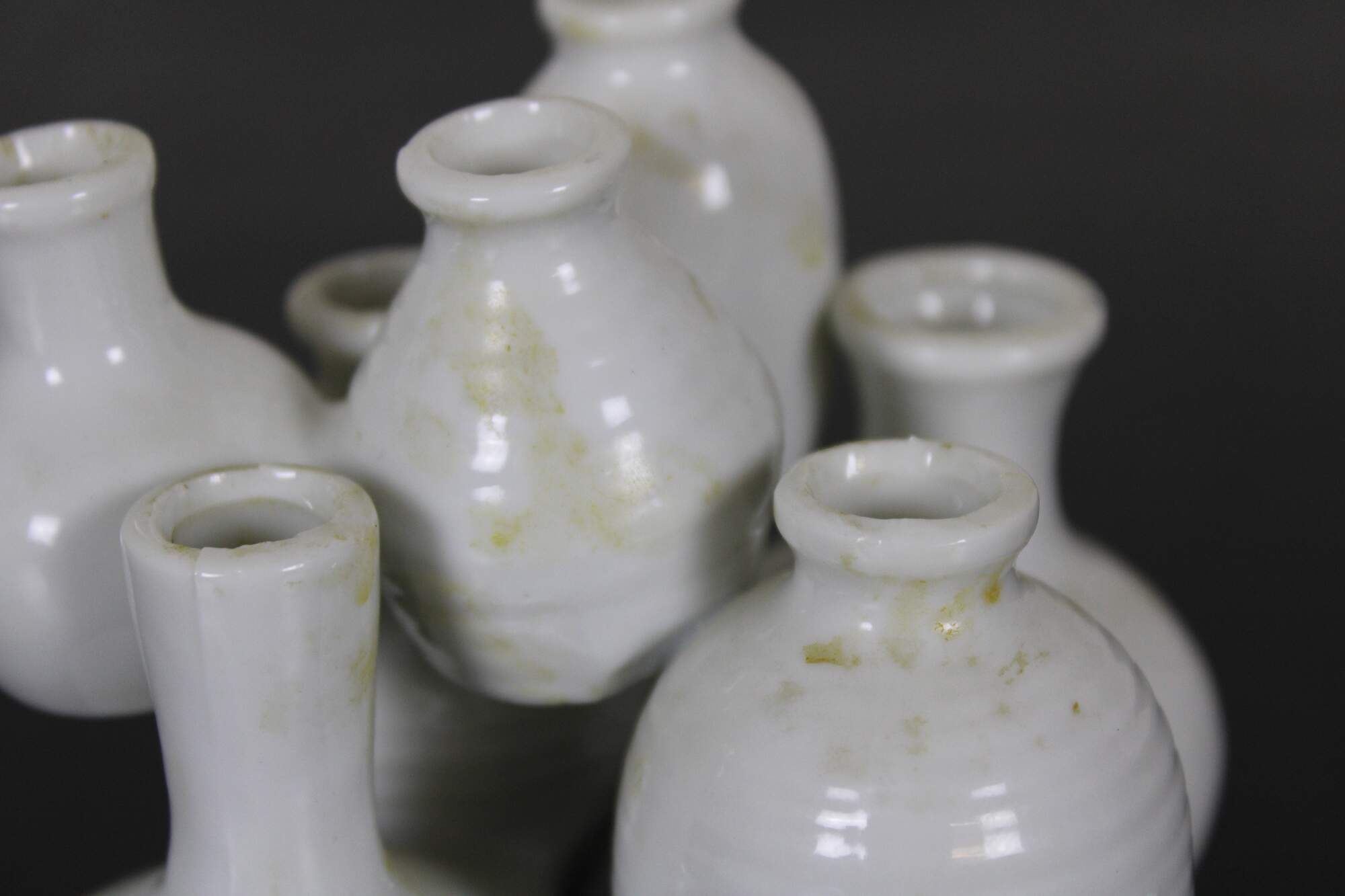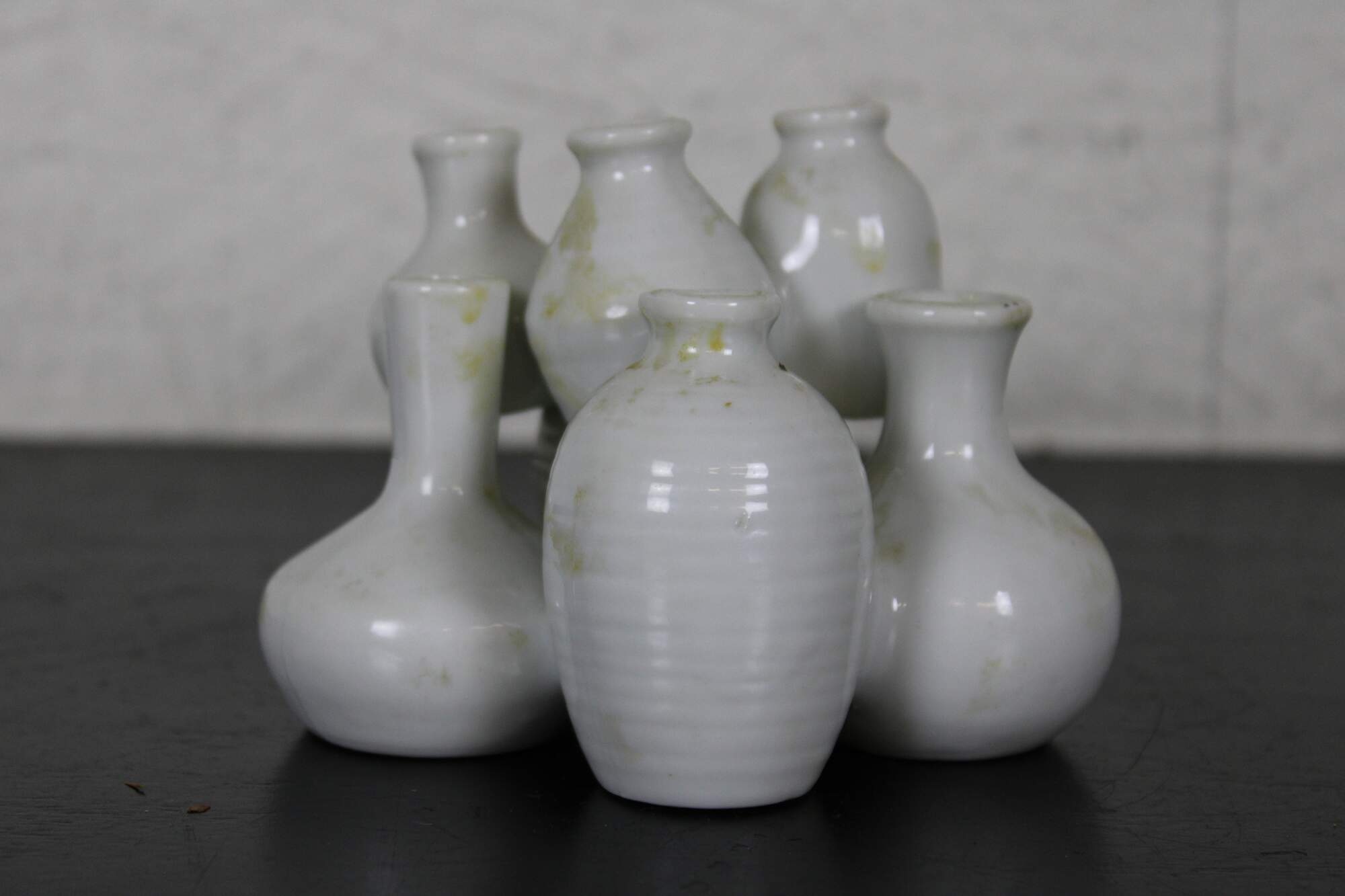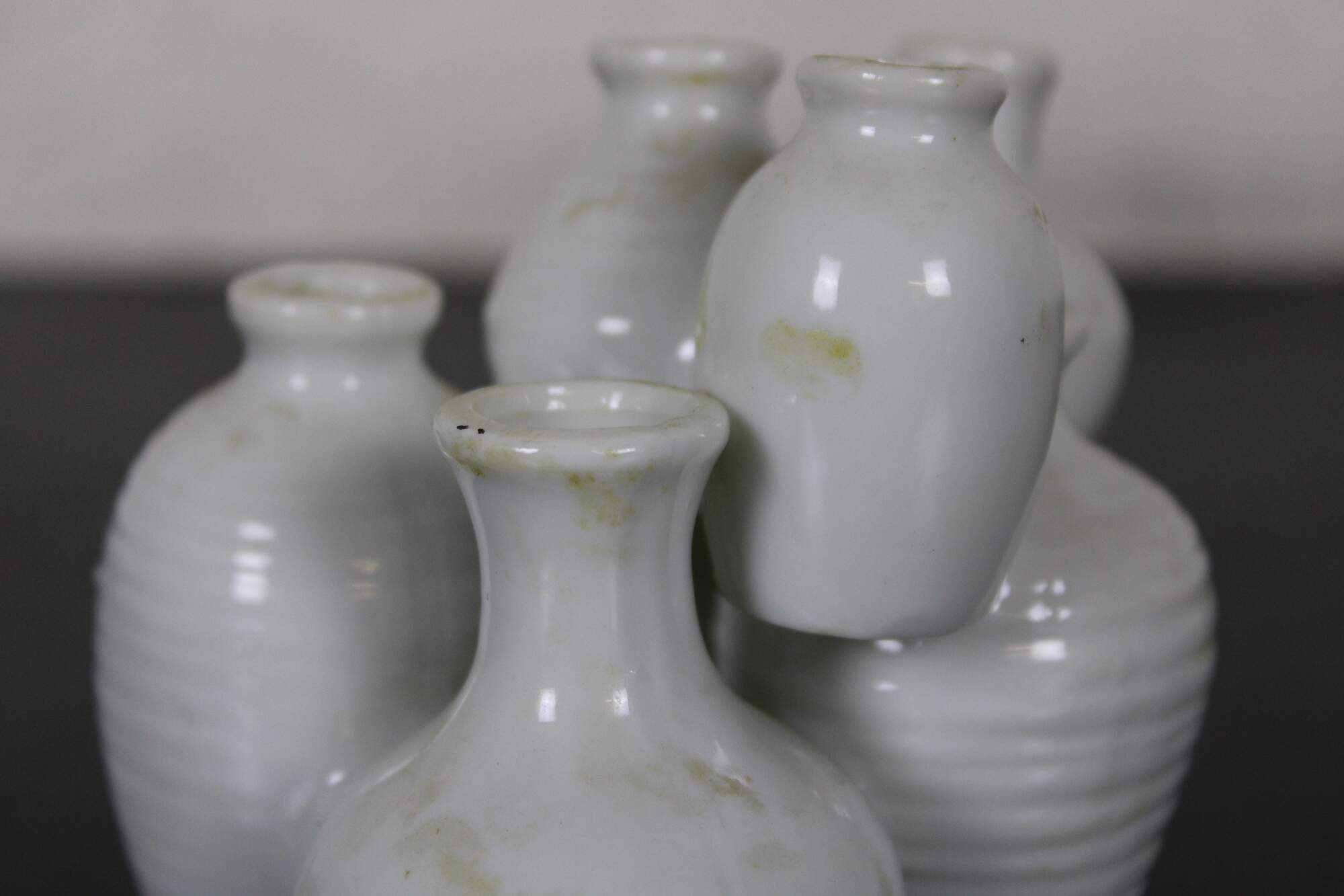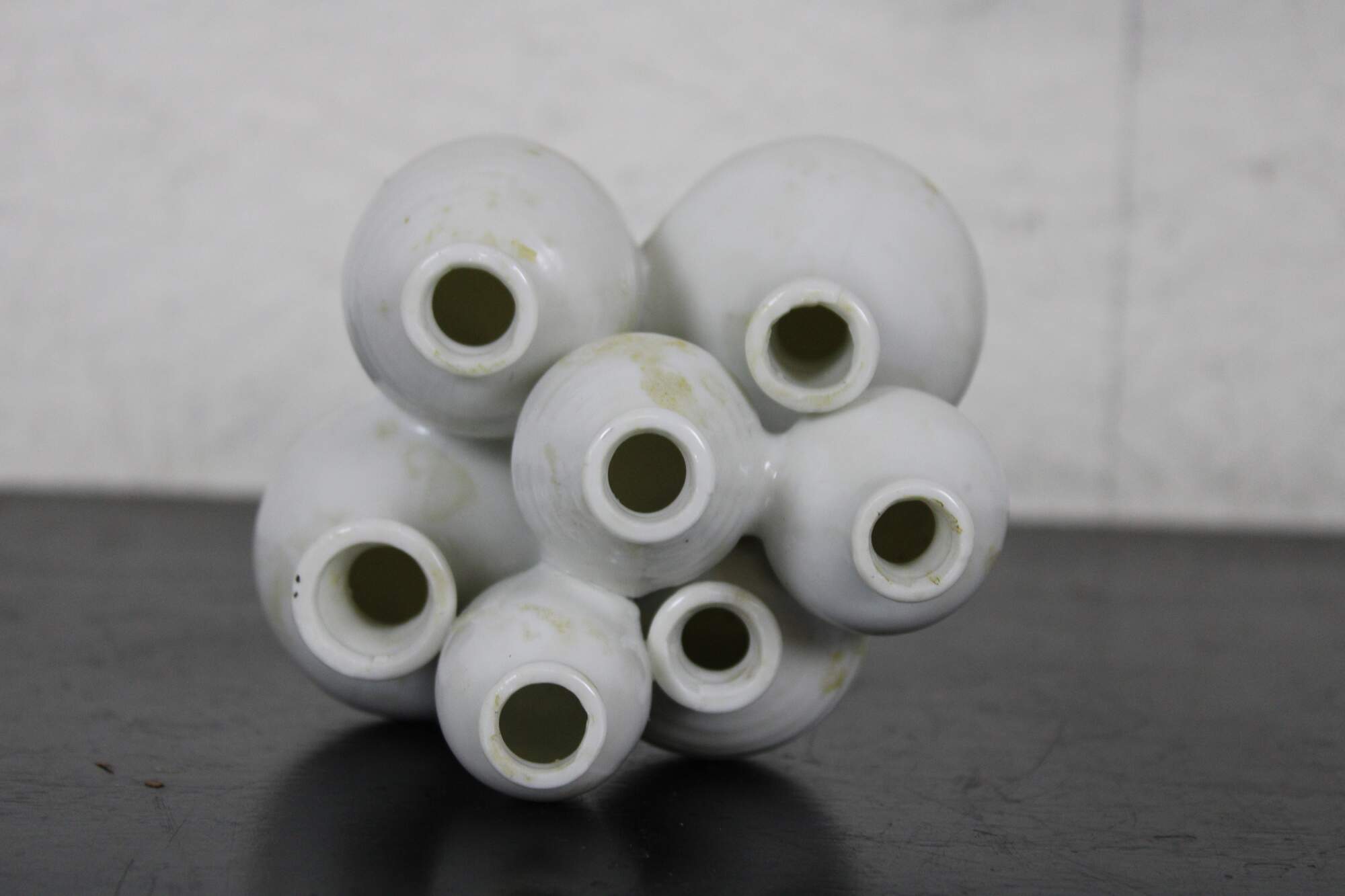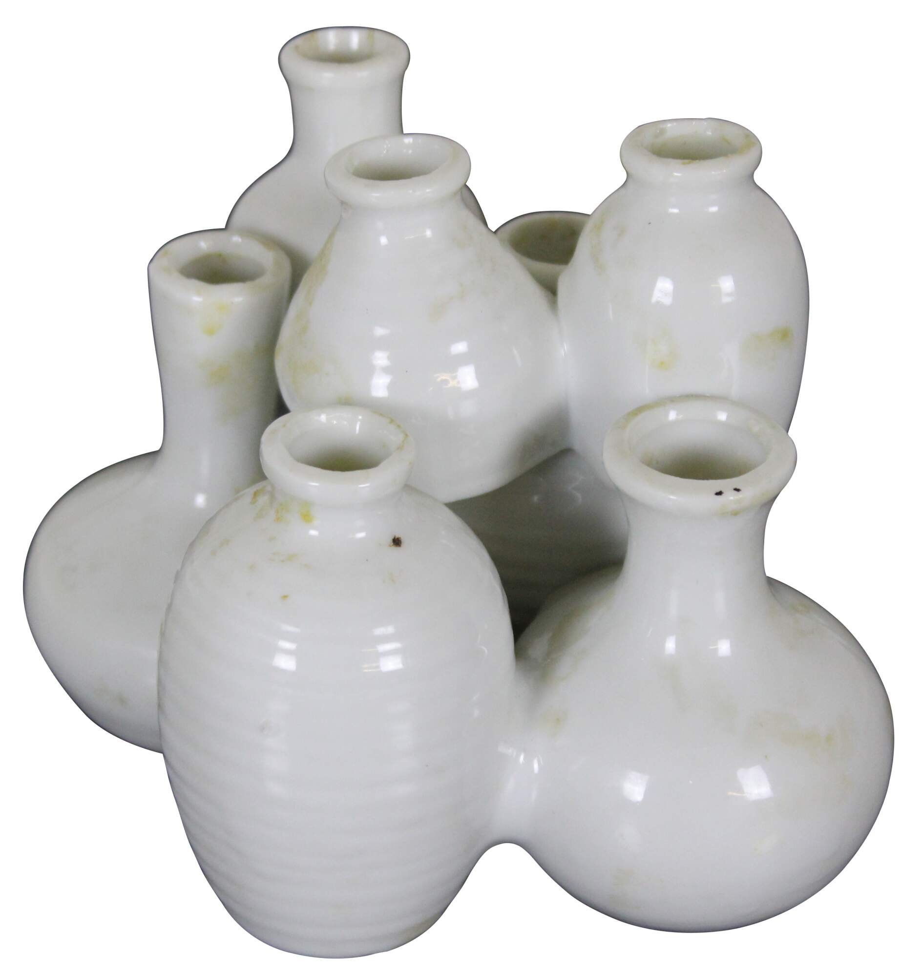 Vintage 1960’s white porcelain bud vase shaped to resemble a cluster of seven stacked amphoras. Excellent for decorative flowers or propagation of plant cuttings.