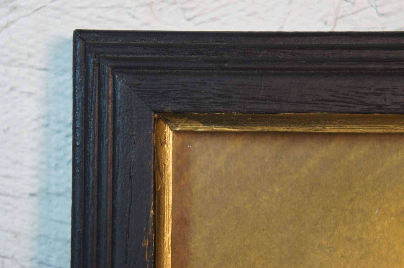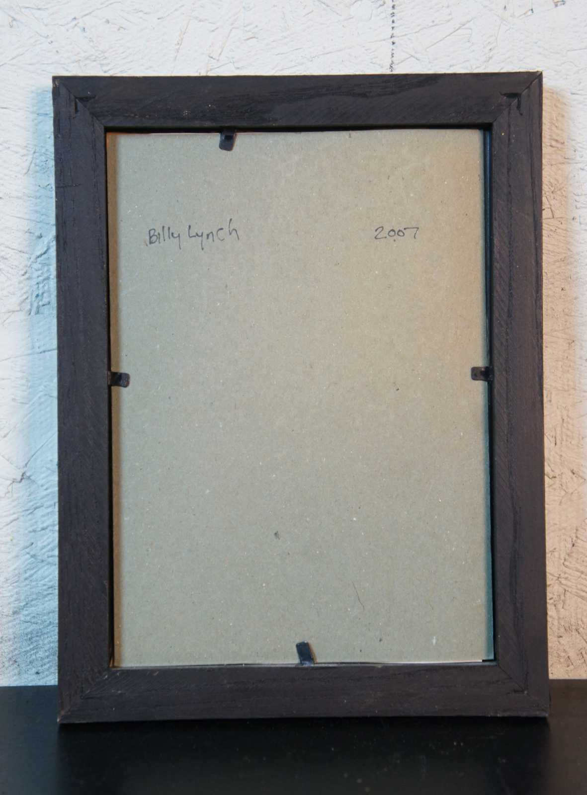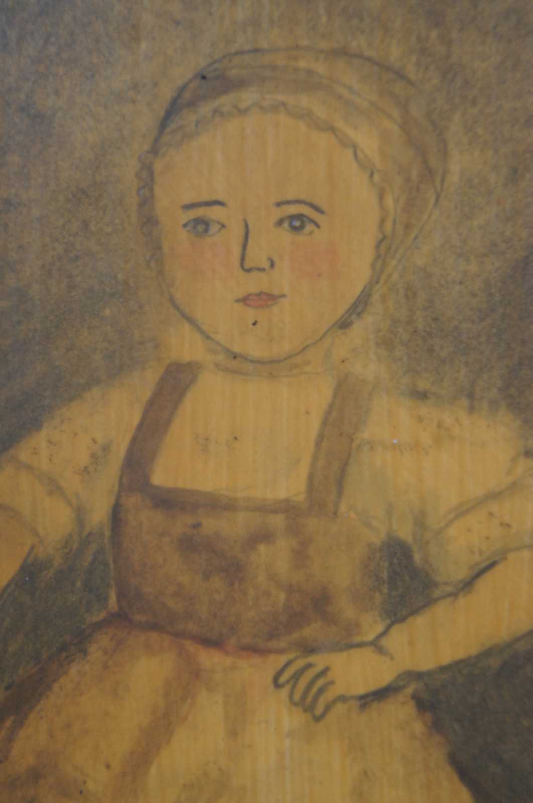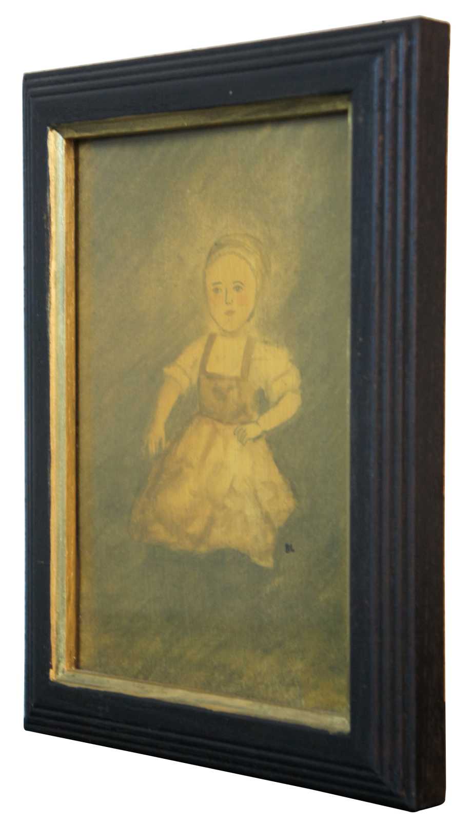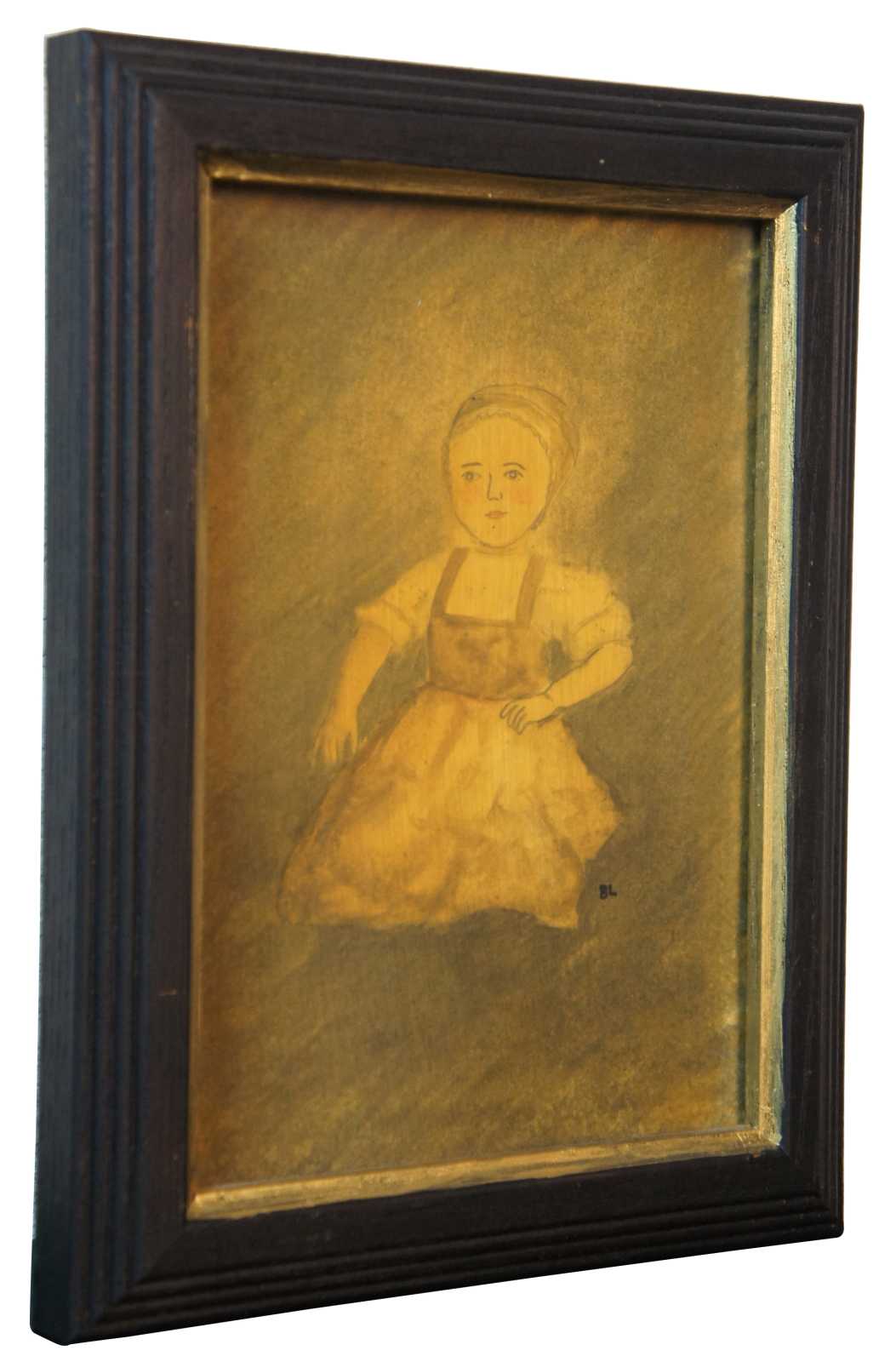 Vintage watercolor painting of a young colonial girl in antique clothing reminiscent of 17th century pilgrims, signed on reverse “Billy Lynch 2007.”
