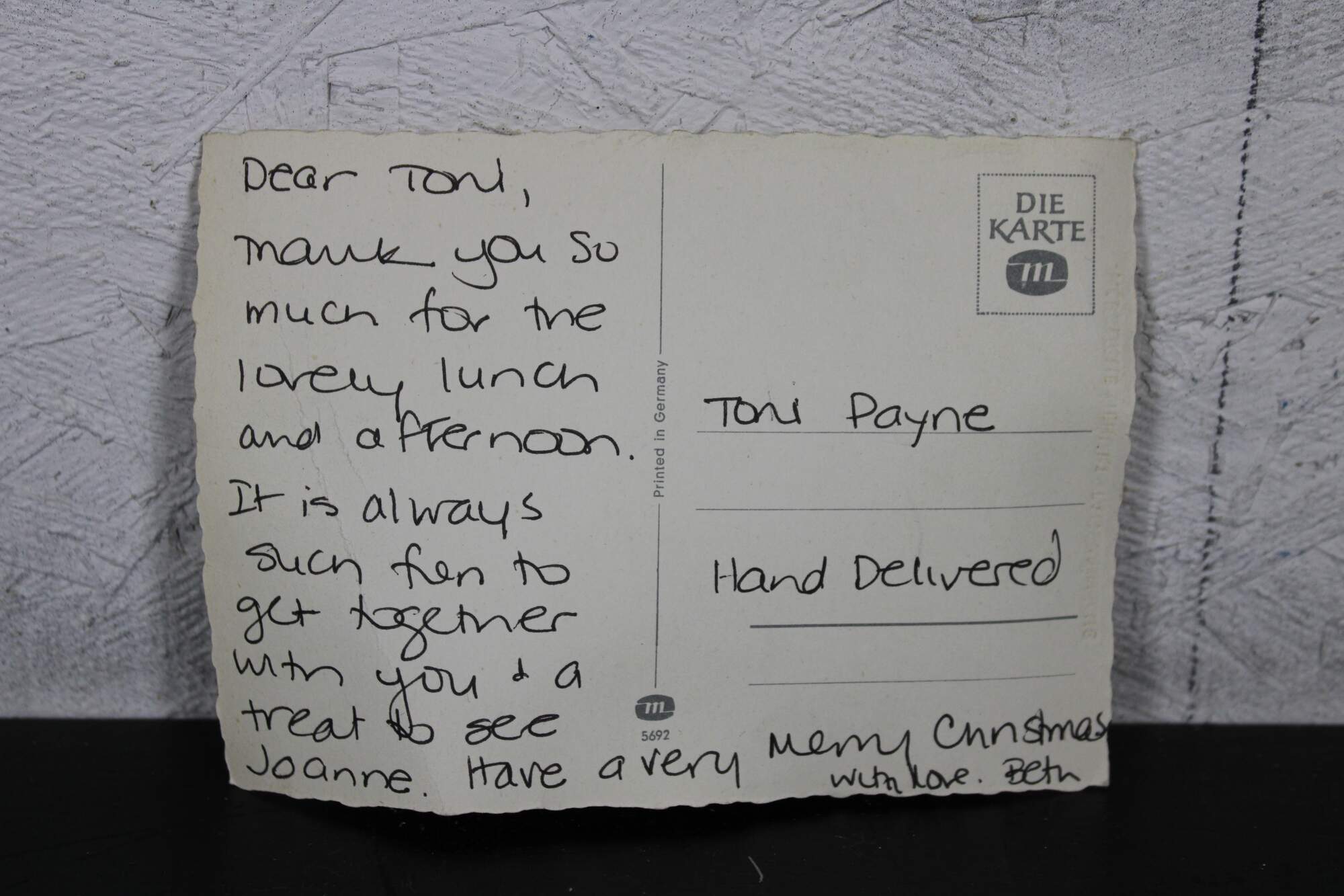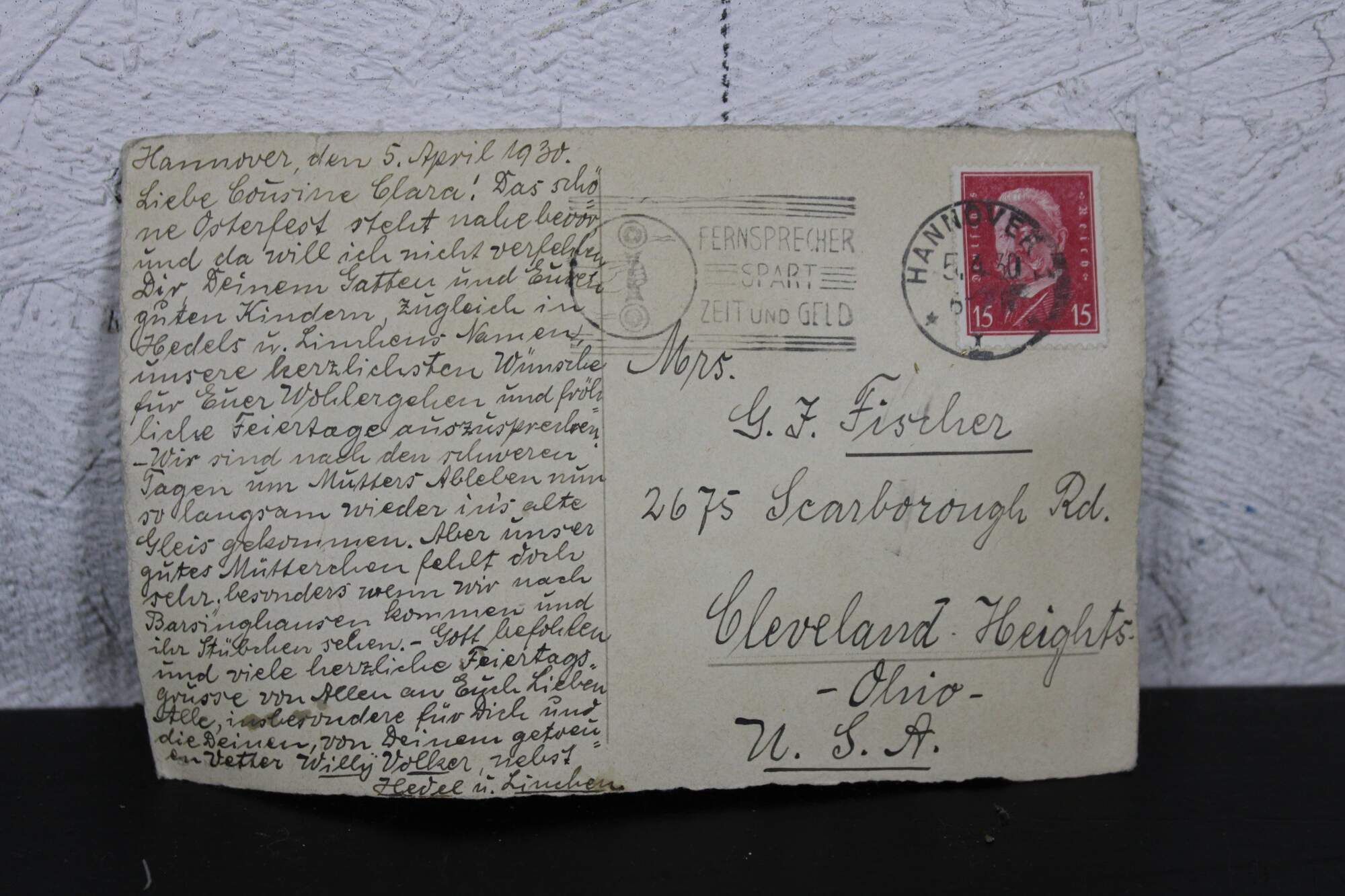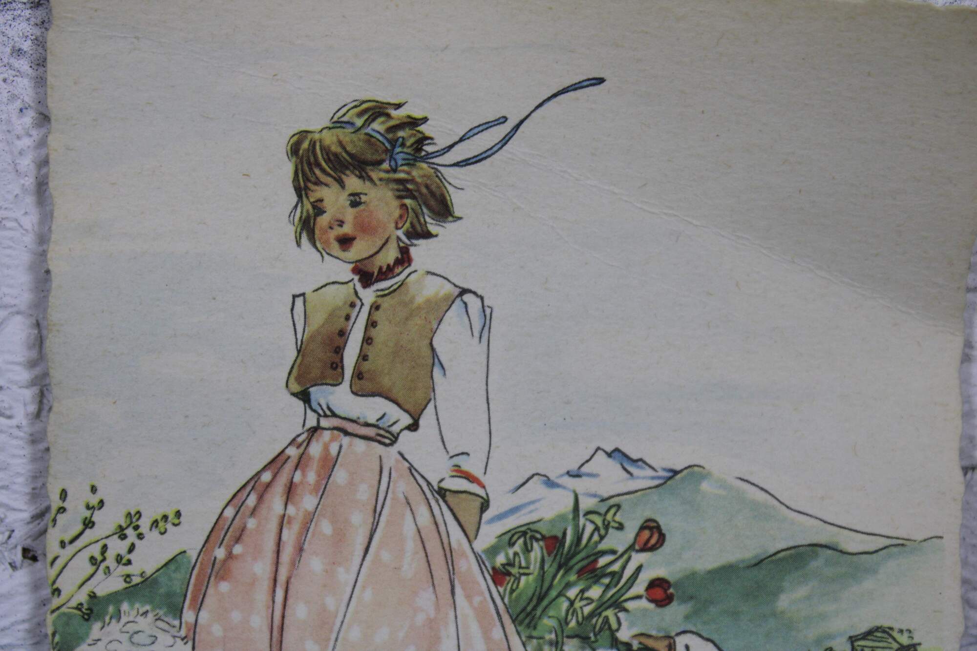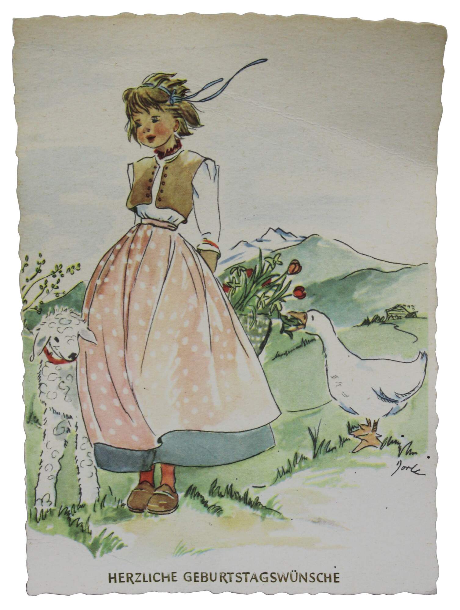 Pair of vintage and antique German postcards. One wishing a Happy Easter (Frohliche Ostern), with art designed by Franziska Shenkel that features a rabbit with a basket of Easter eggs speaking to two young girls; and Happy Birthday Wishes (Herzliche Geburtstagswunsche), featuring a girl in a dress with her lamb and goose.