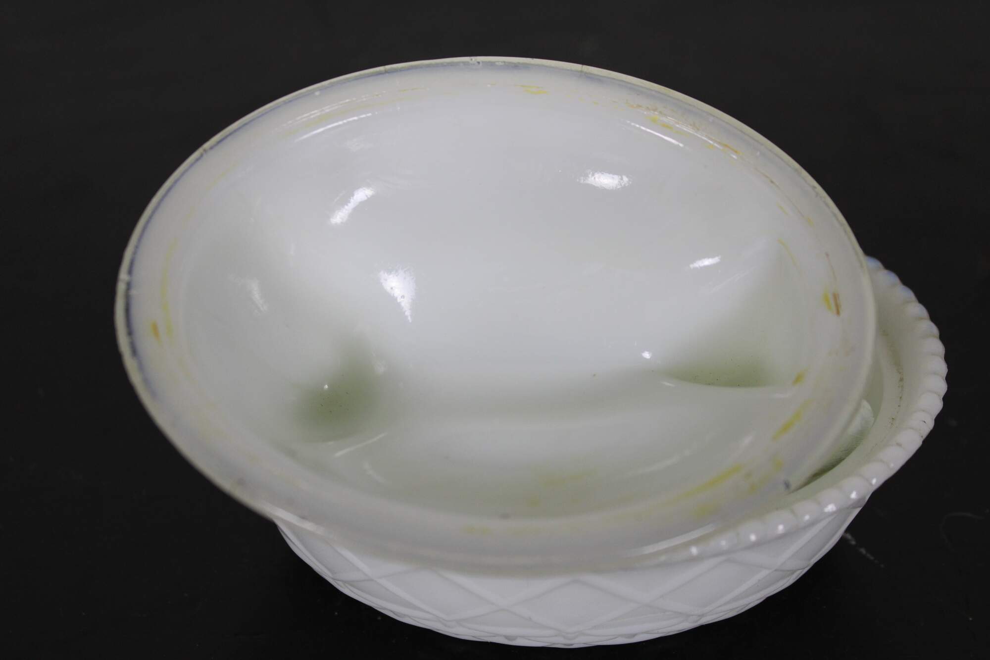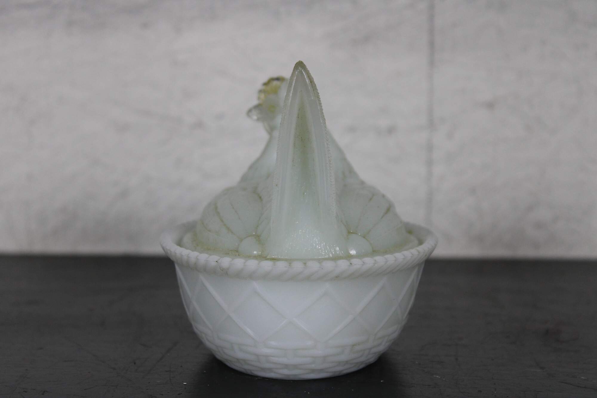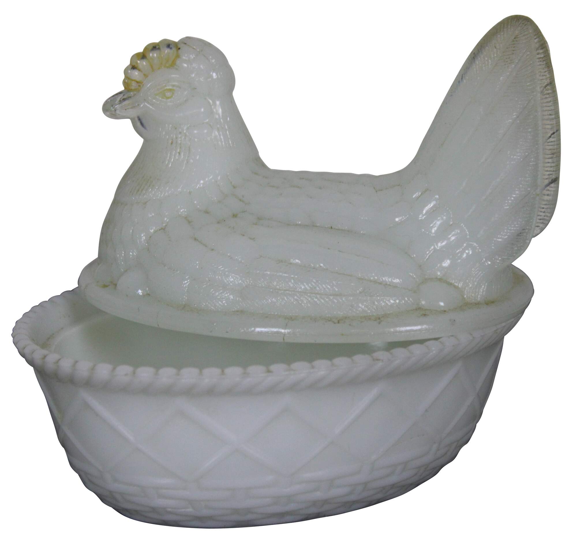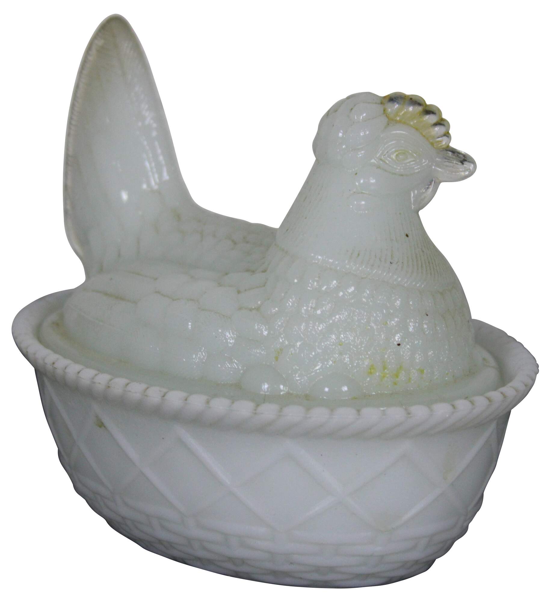 Antique milk glass candy dish in the shape of a chicken nesting in a basket.