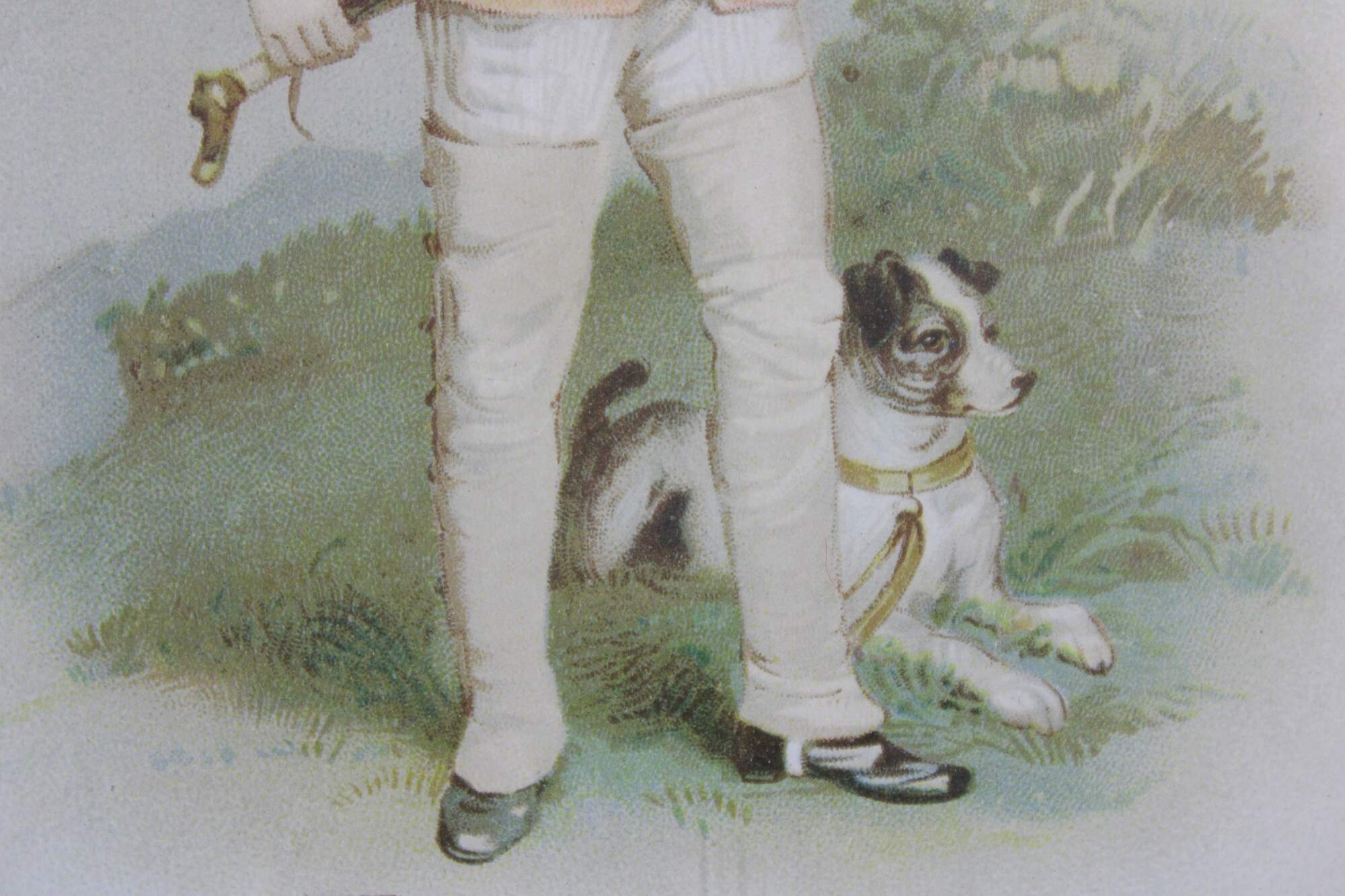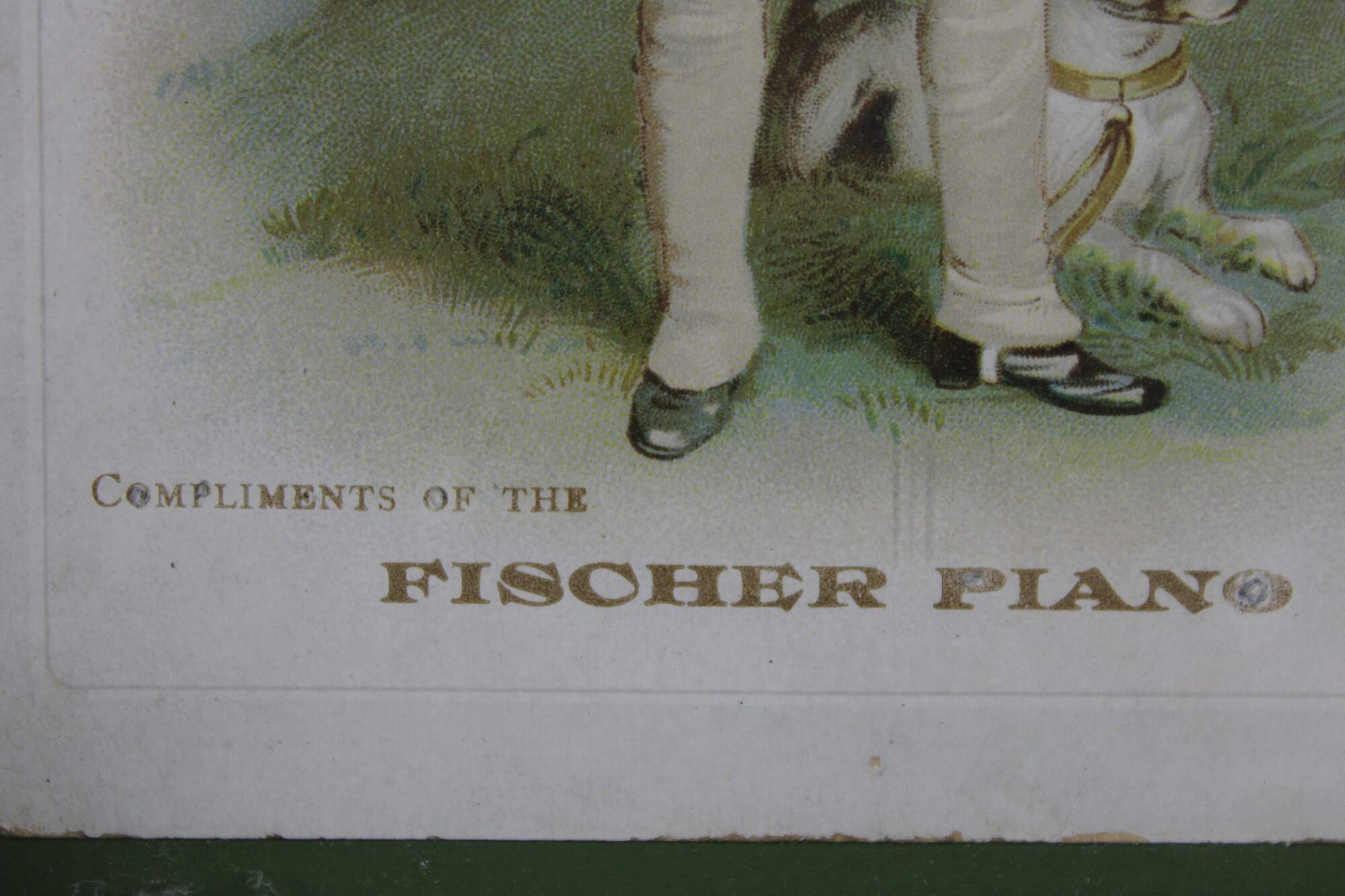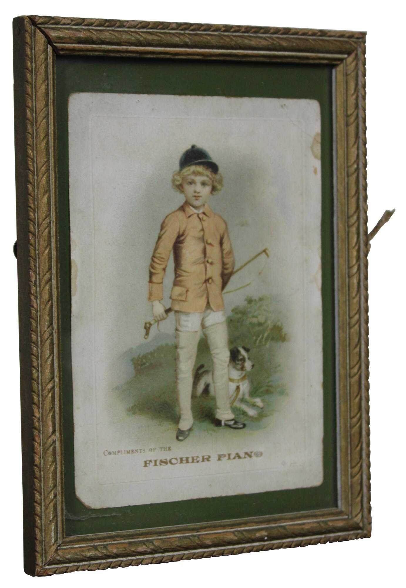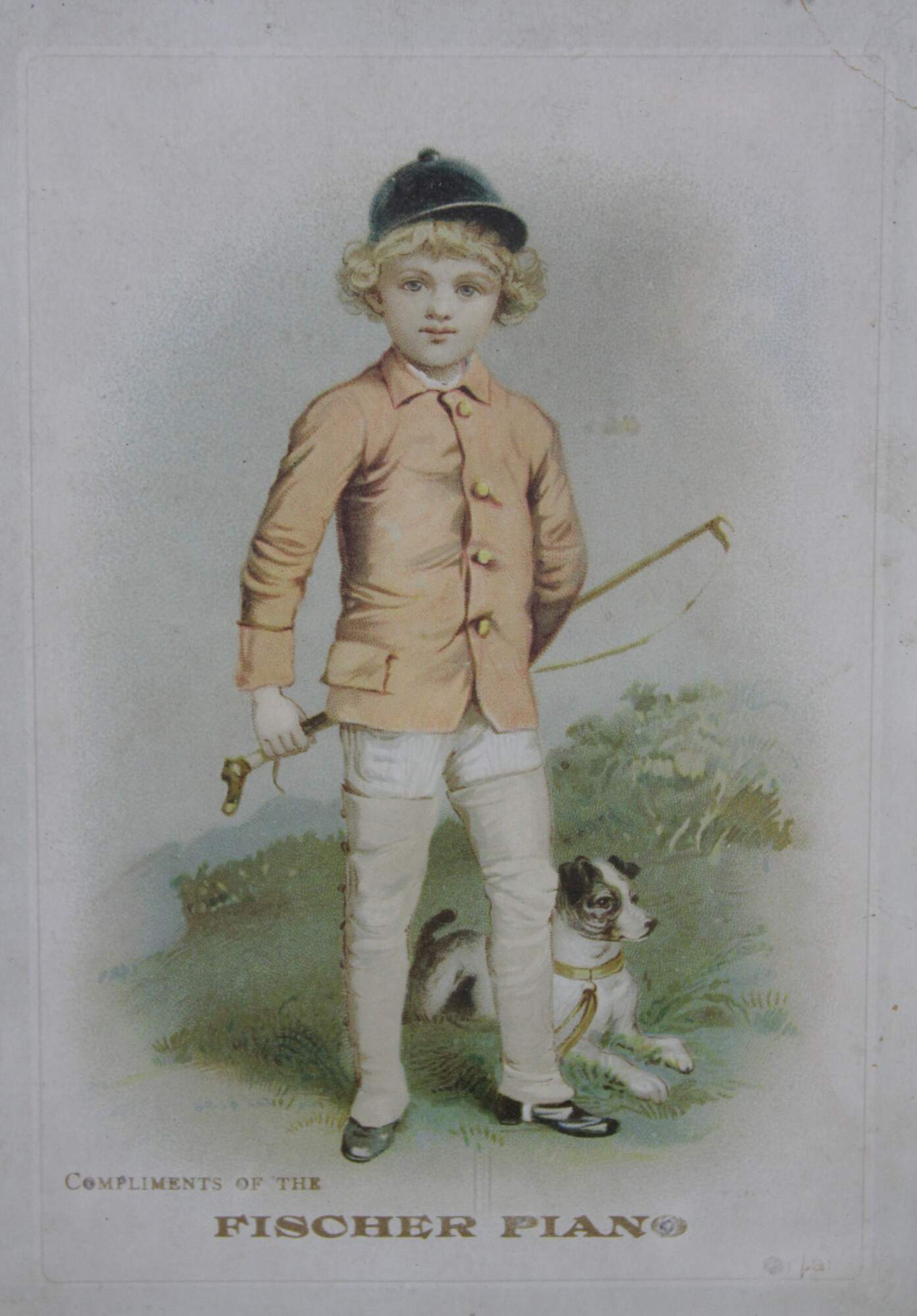 Antique Victorian advertising trade card showing a lithograph portrait of a boy and his dog in fox hunting attire with the legend “Compliments of the Fischer Piano.”