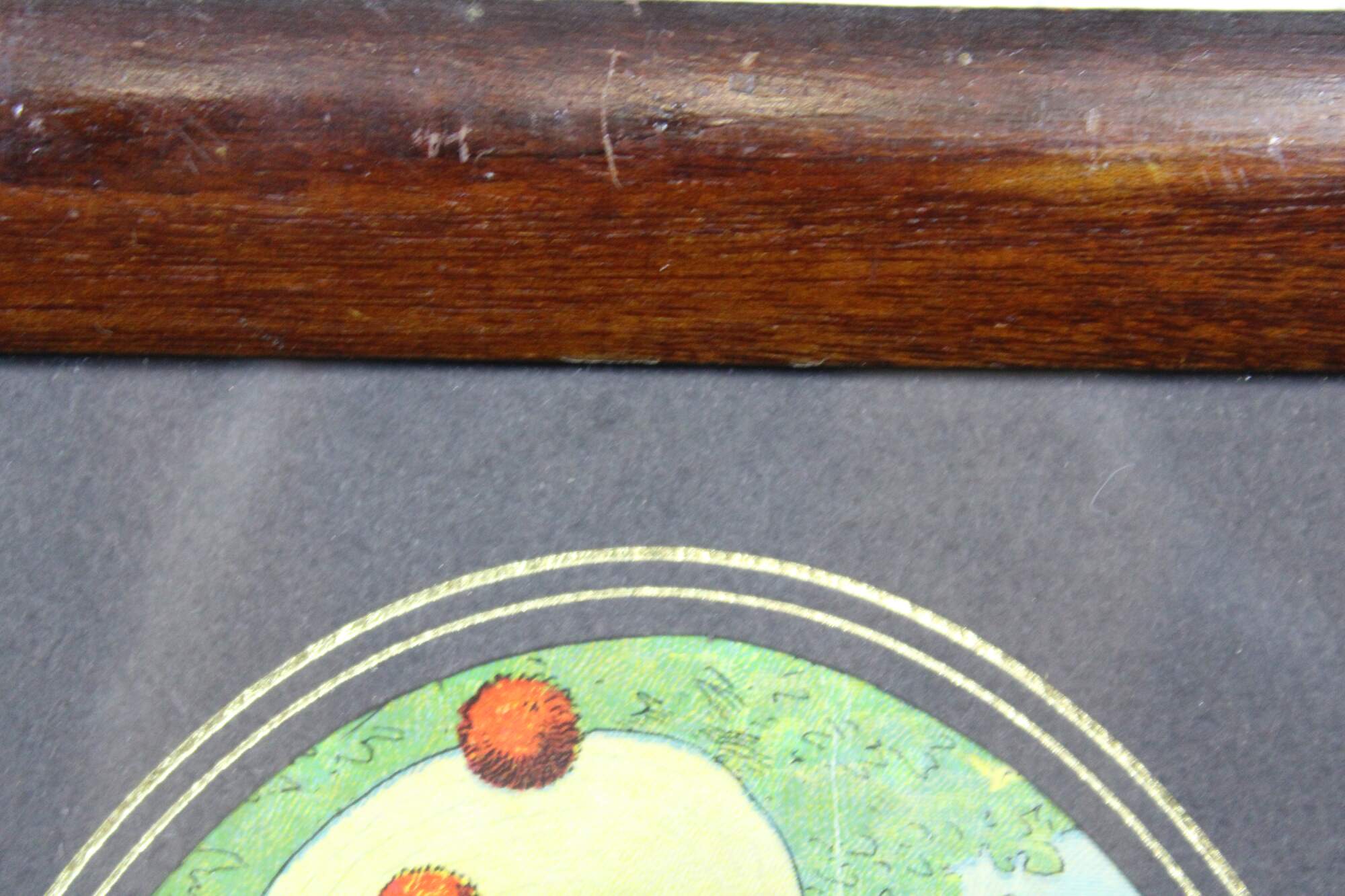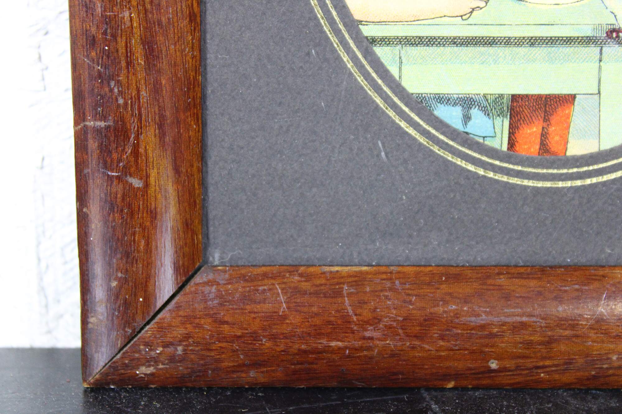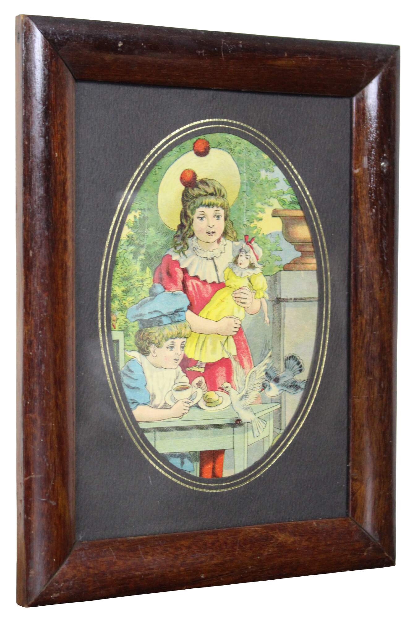 Antique brightly colored Victorian lithograph print showing two children having tea in a garden with hungry birds.