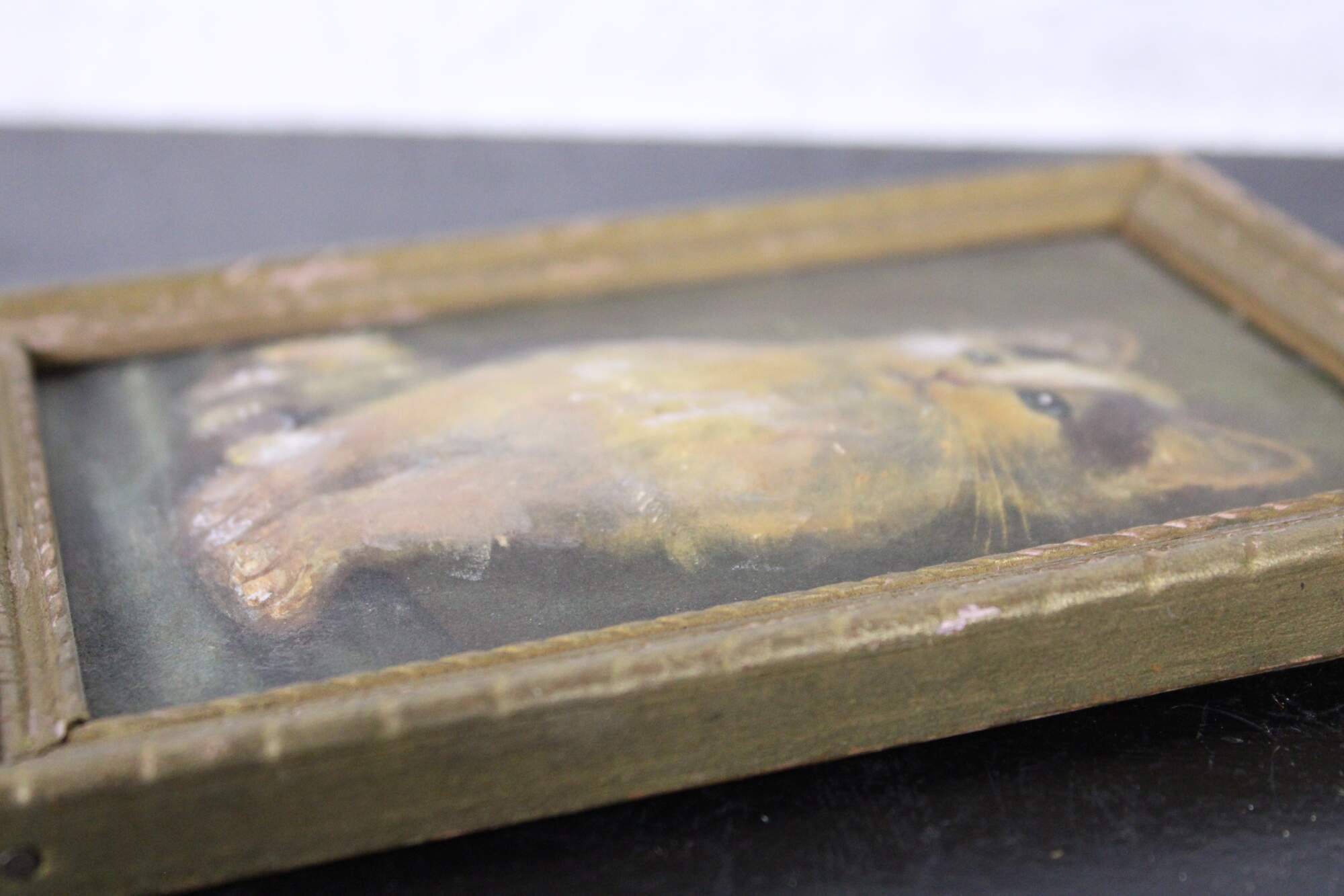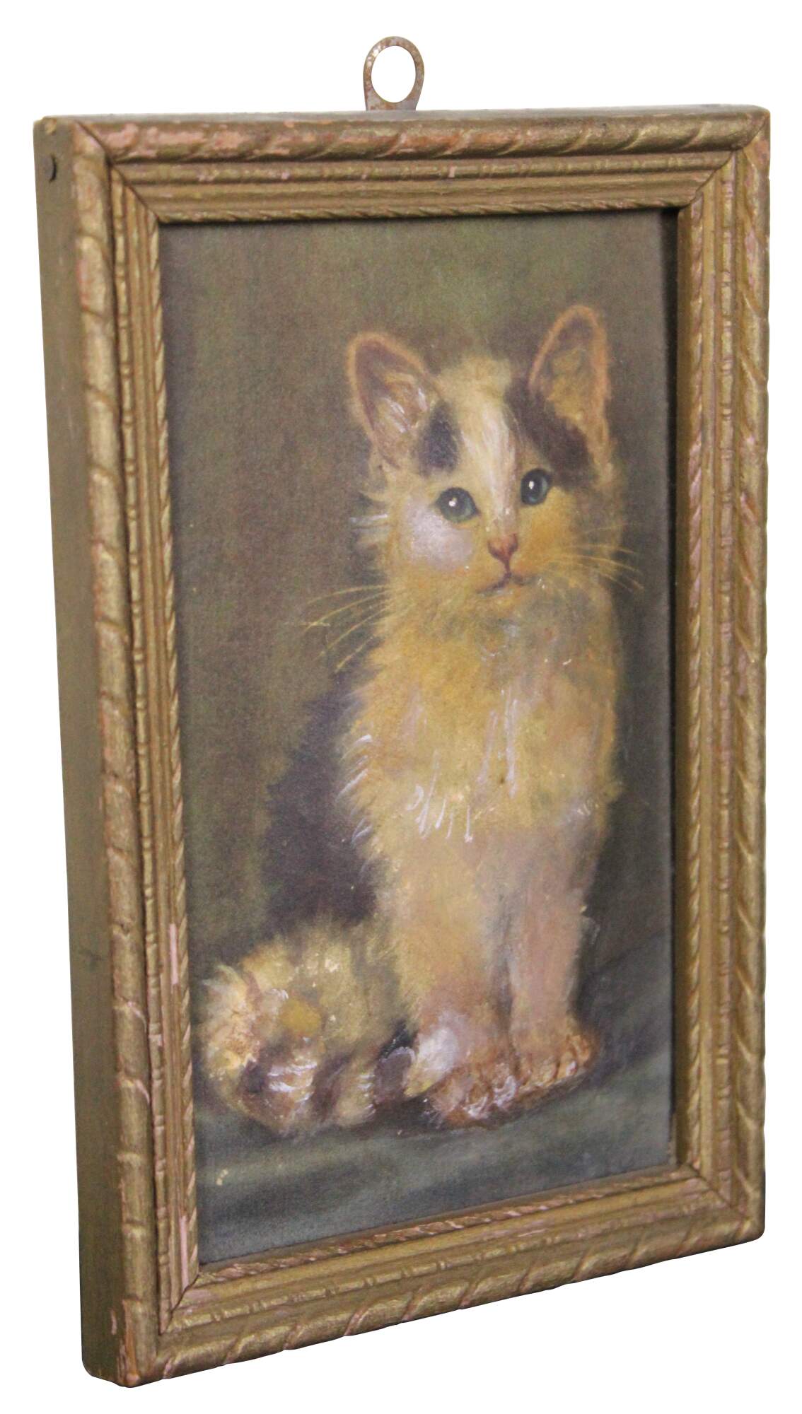 Small antique 19th century watercolor painting of a fluffy kitten, molded over a raised surface to be slightly 3-dimensional.
