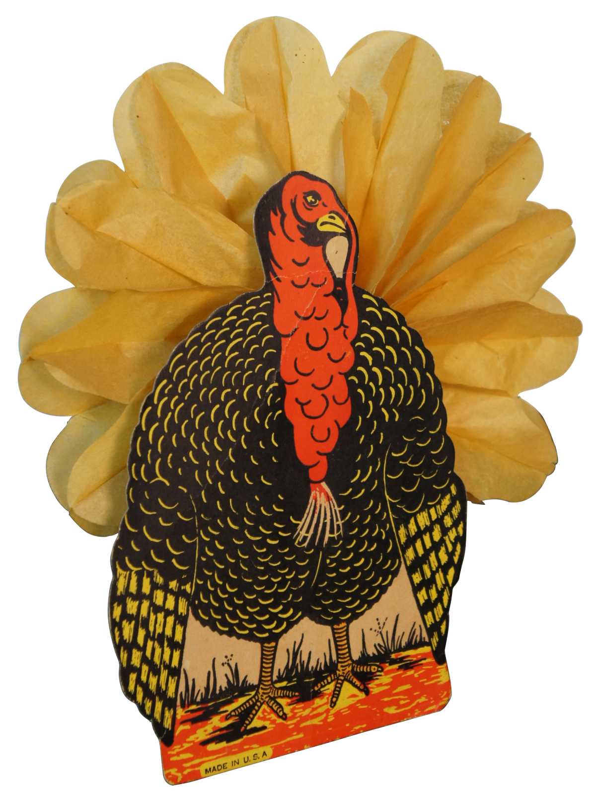 Antique dime store paper turkey table topper with tissue feathers.