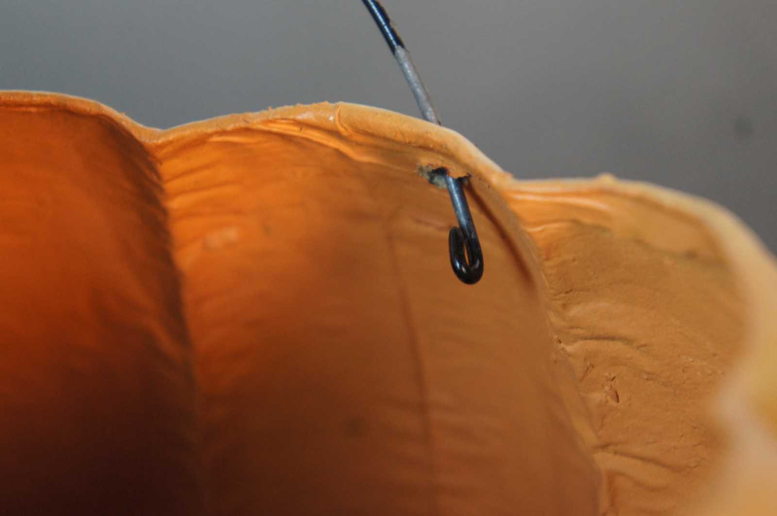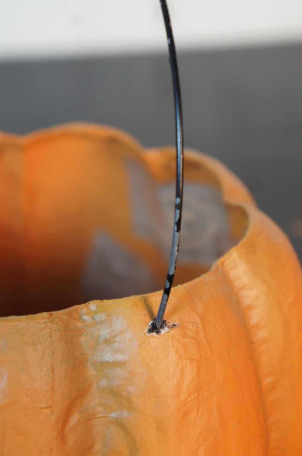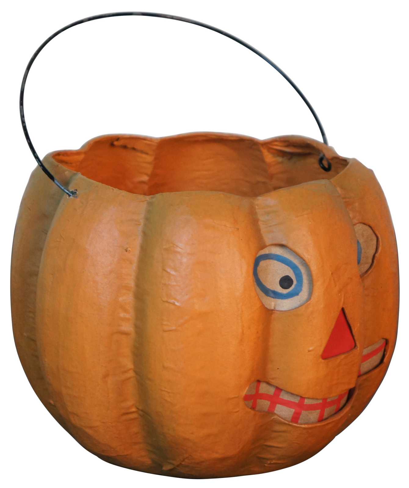 Antique paper mache jack-o-lantern shaped candy bucket with paper backed, cut out face and wire handle.