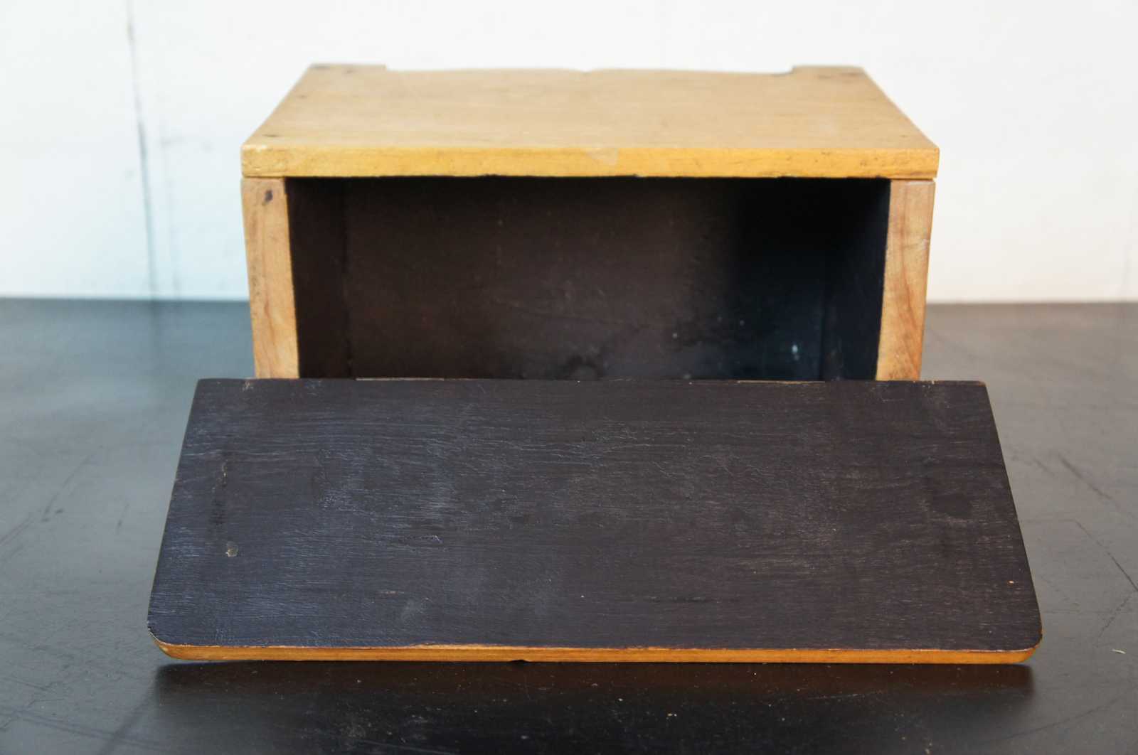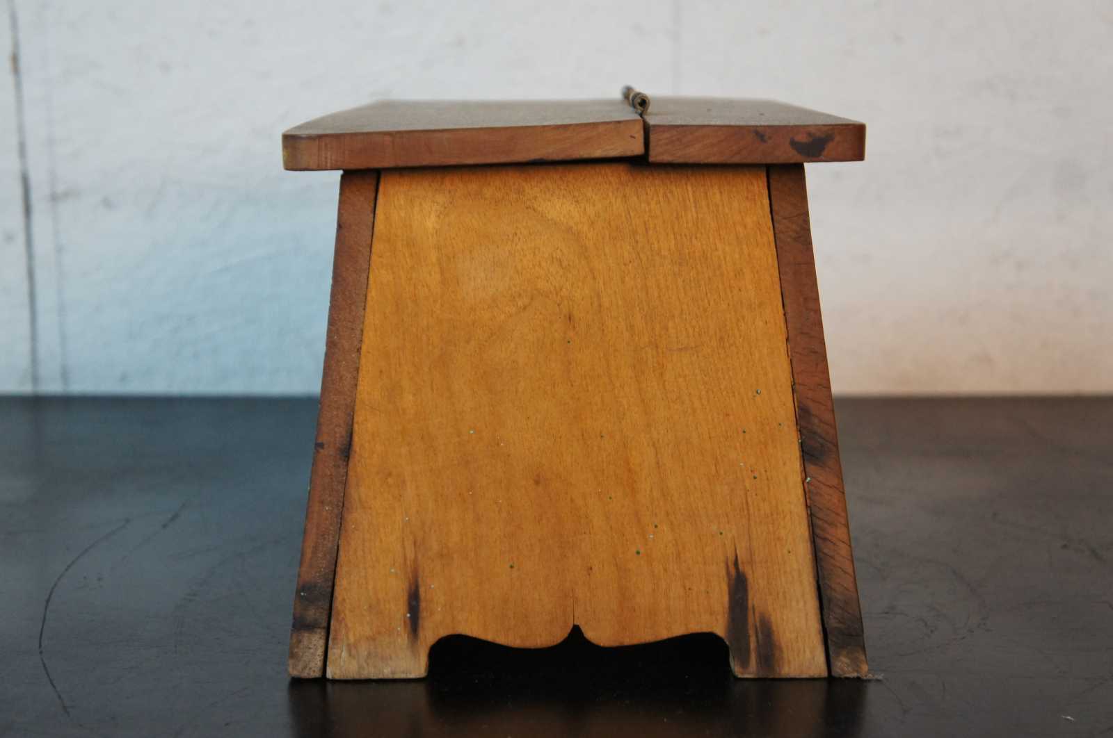 Antique primitive wooden step stool with flip top lid for storage, possibly a shoe shine box.