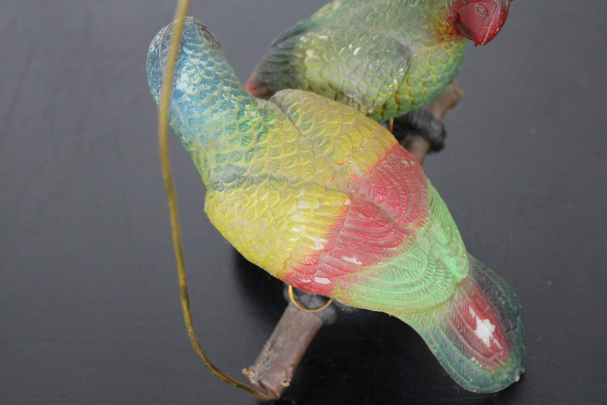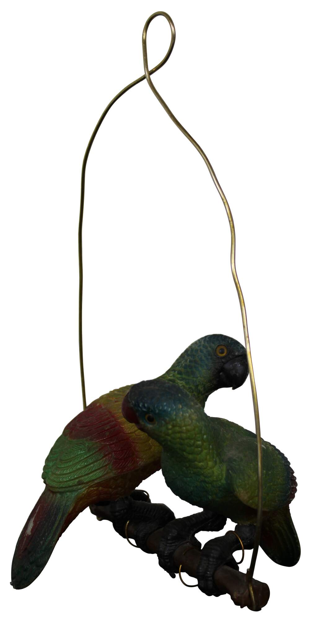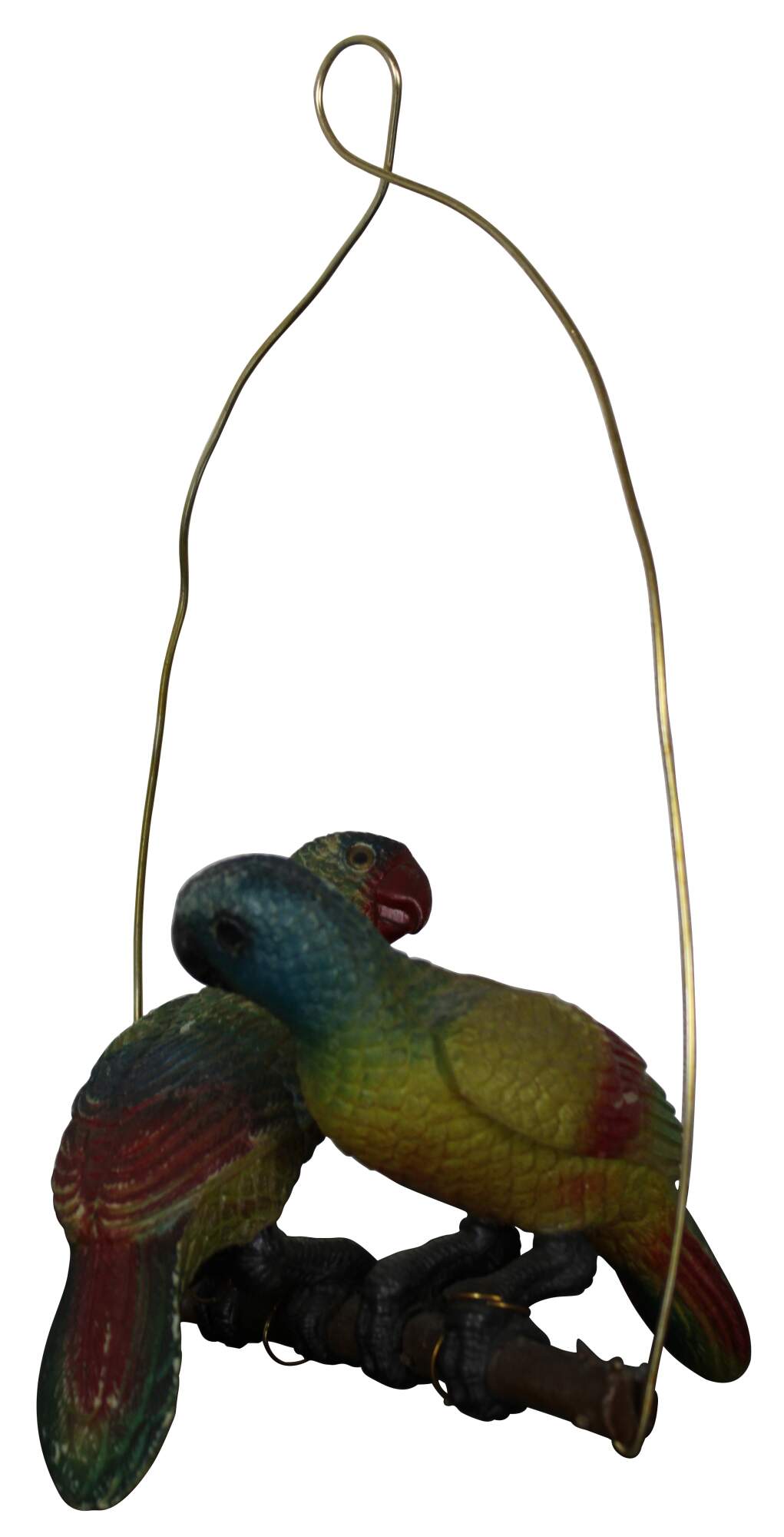 Vintage mid century pair of painted plastic parrots perched on a wood and brass wire hanging perch.
