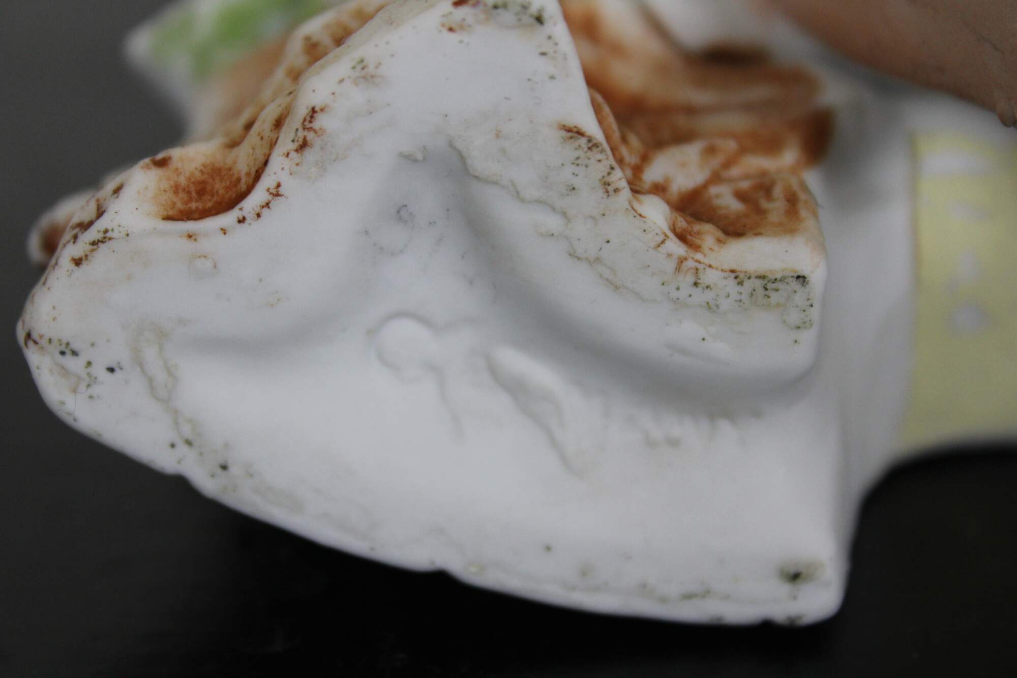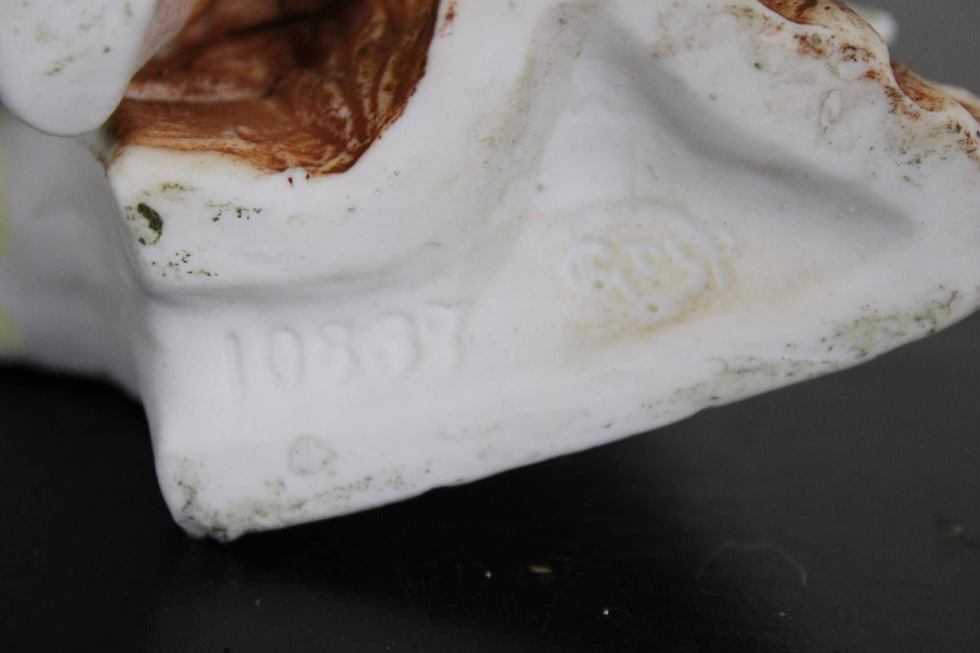 Antique German bisque spill vase in the shape of a child seated under a fence with a rabbit. Attributed to Goer, Made in Germany.