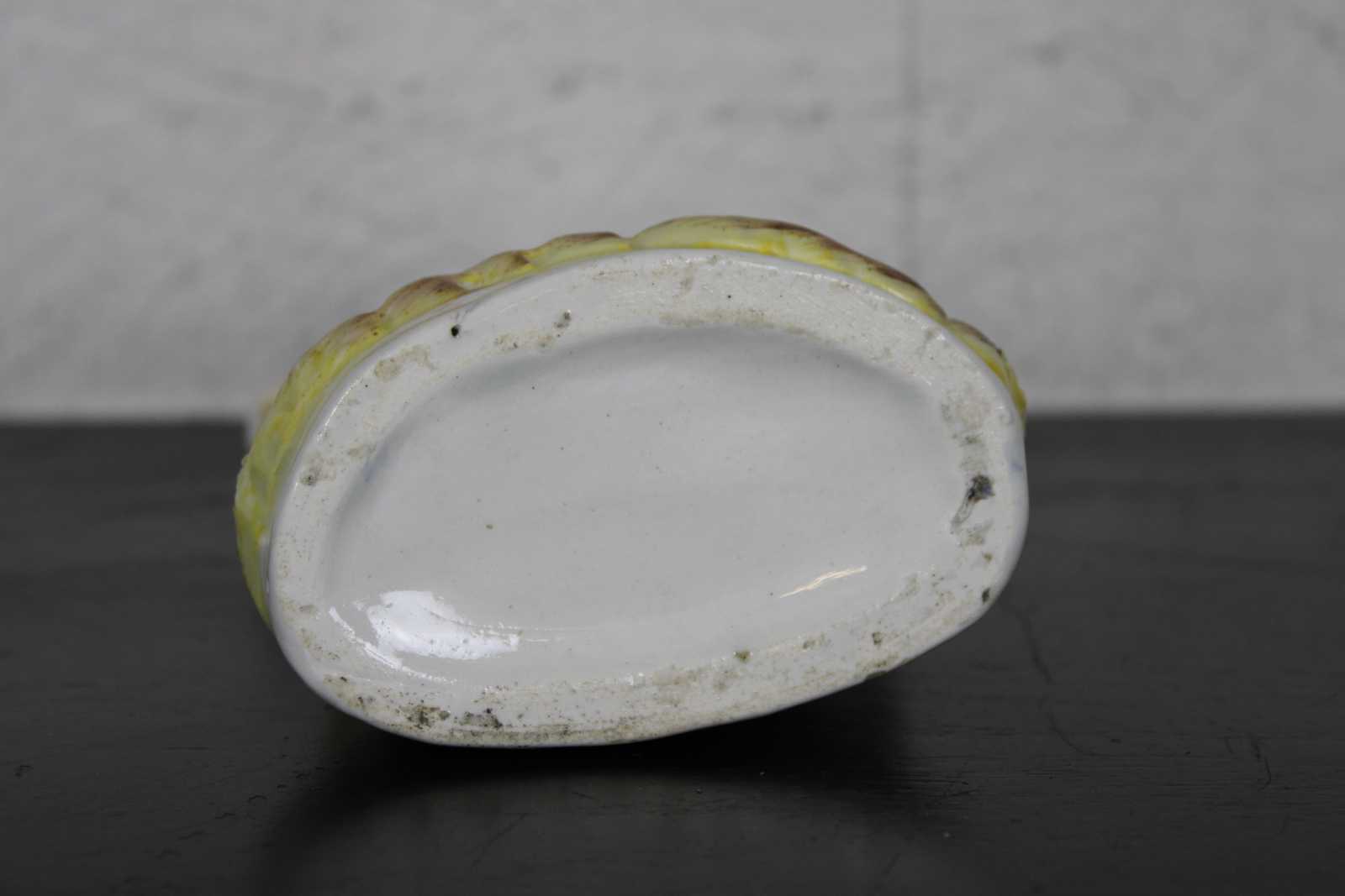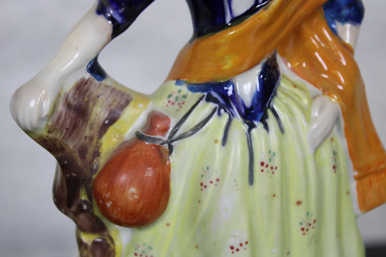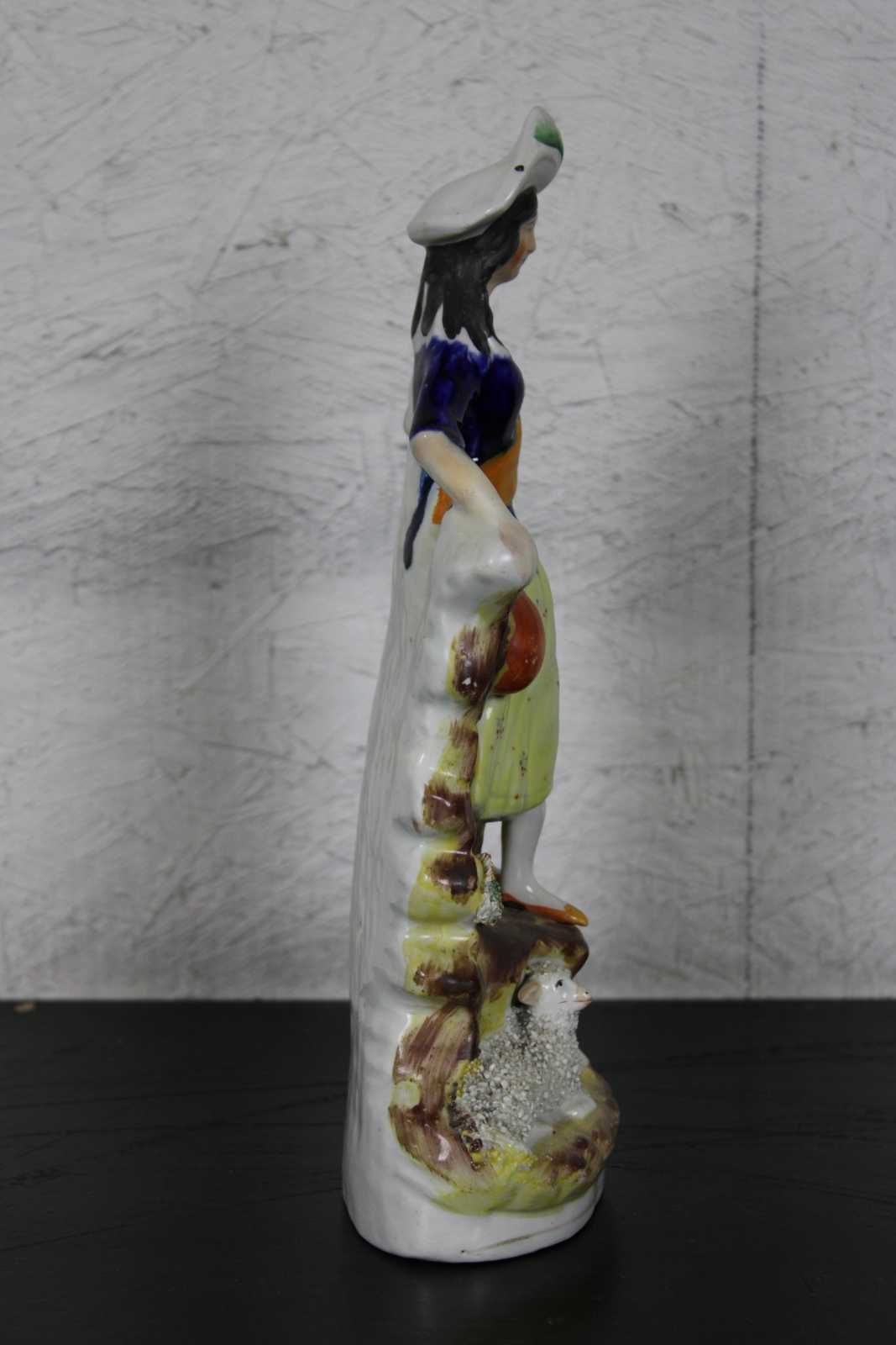 Antique 19th century English Staffordshire porcelain figurine in the shape of a Scottish woman standing by a tree stump, watching over a pair of textured sheep / lambs.