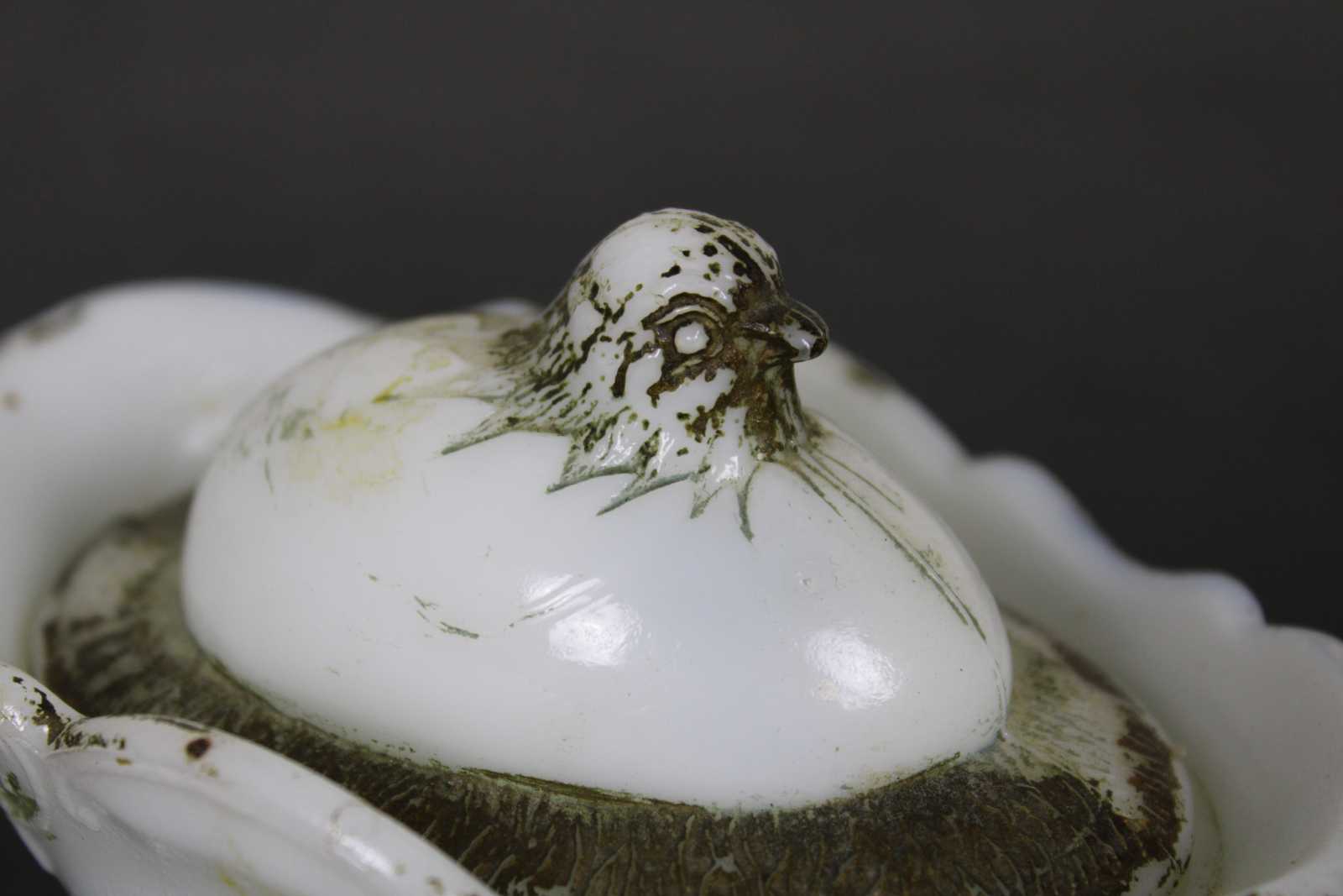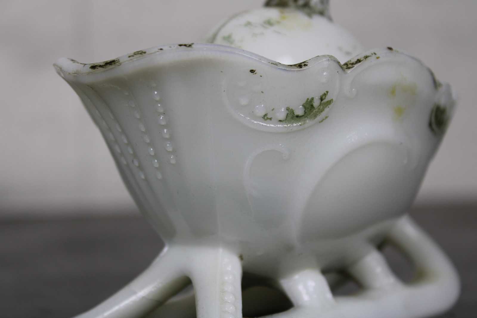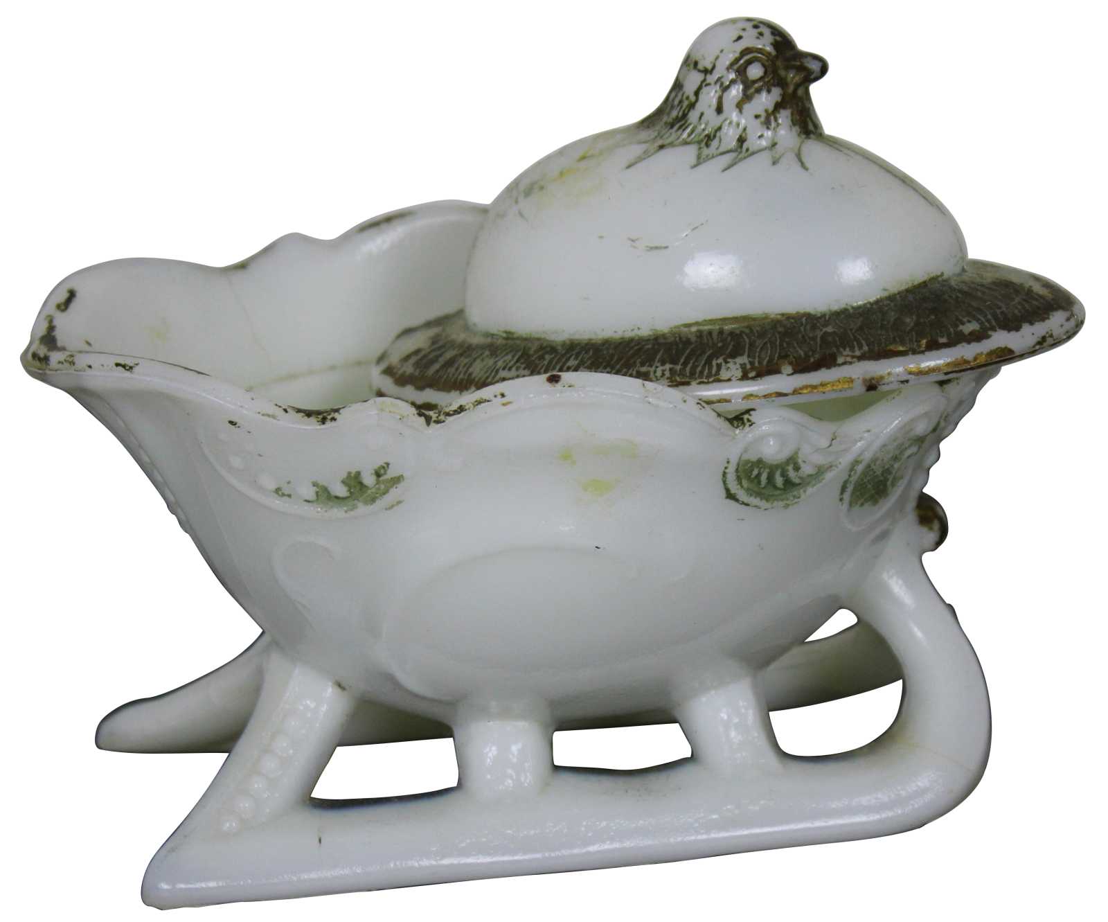 Circa 1905 antique Westmoreland Specialty Company milk glass sleigh shaped candy dish with egg and chick lid.