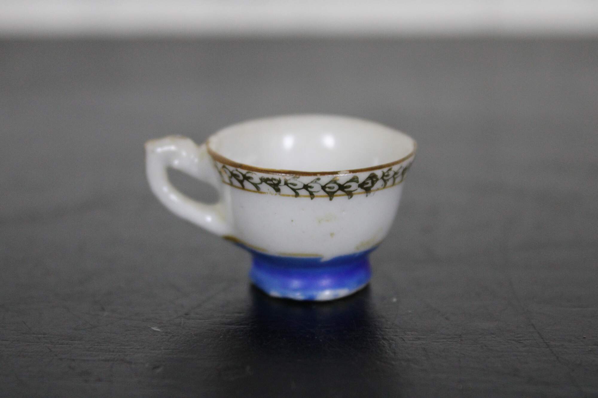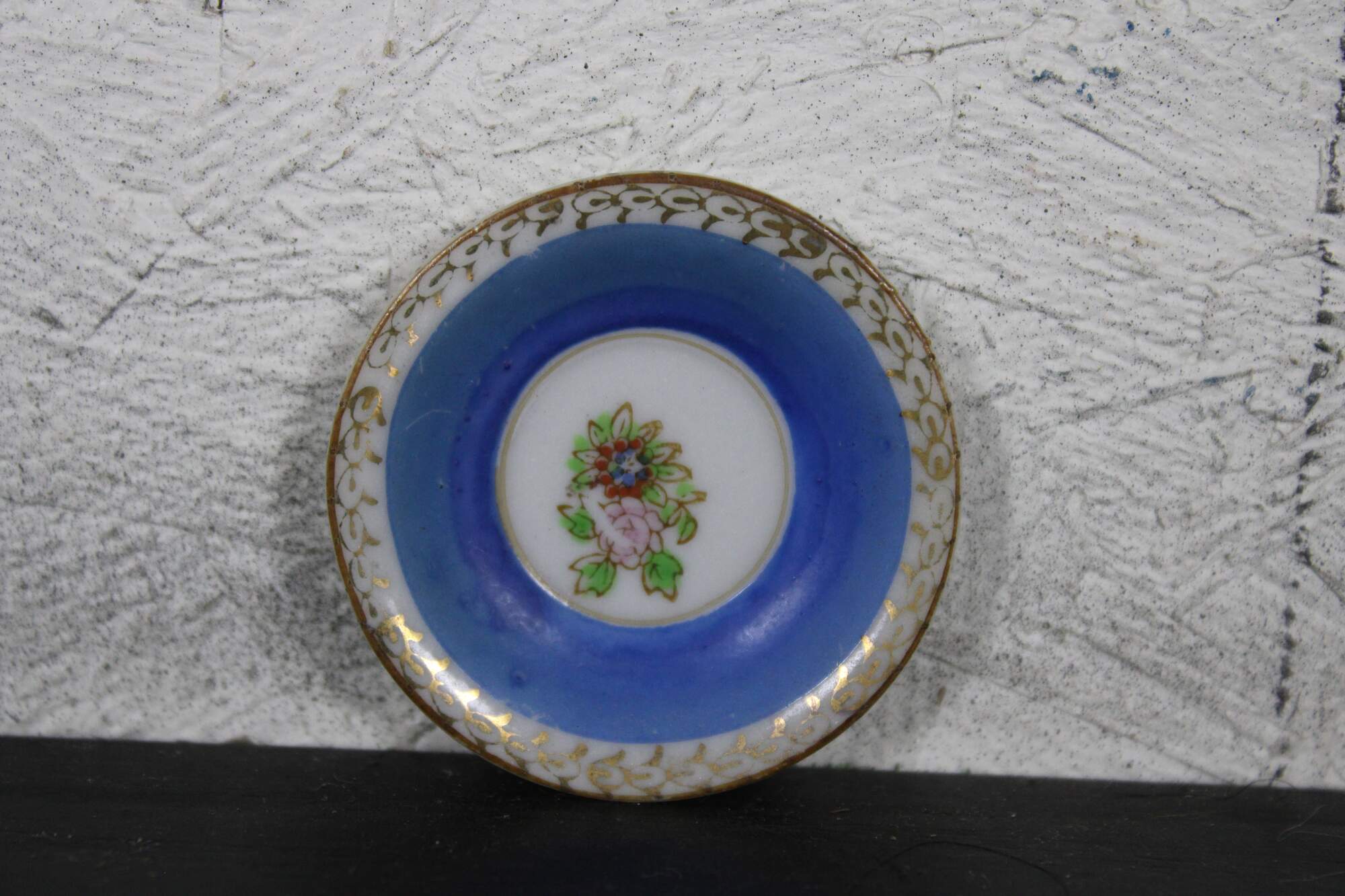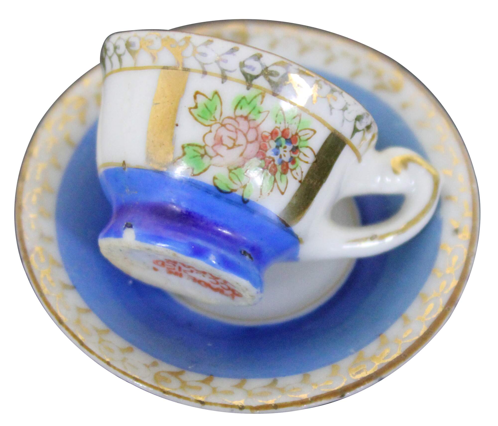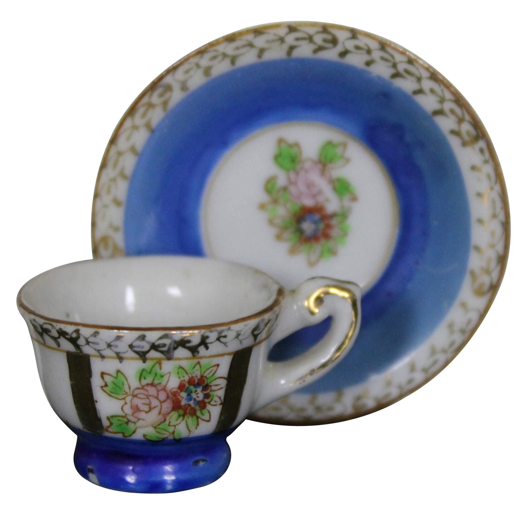 Vintage mid century porcelain miniature teacup and saucer, hand painted in blue and gold with floral accents,; made in Occupied Japan.