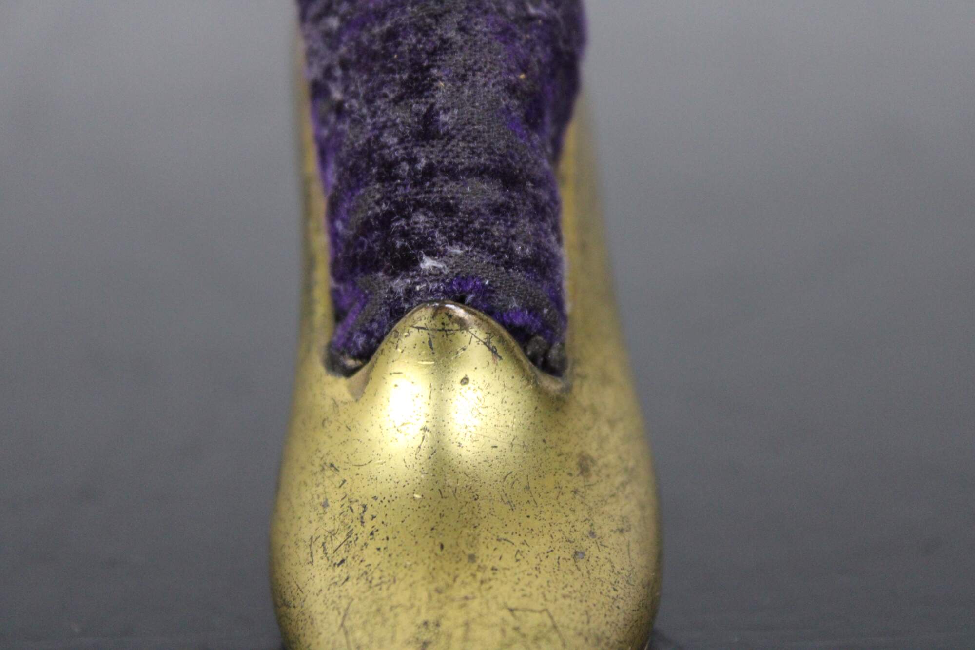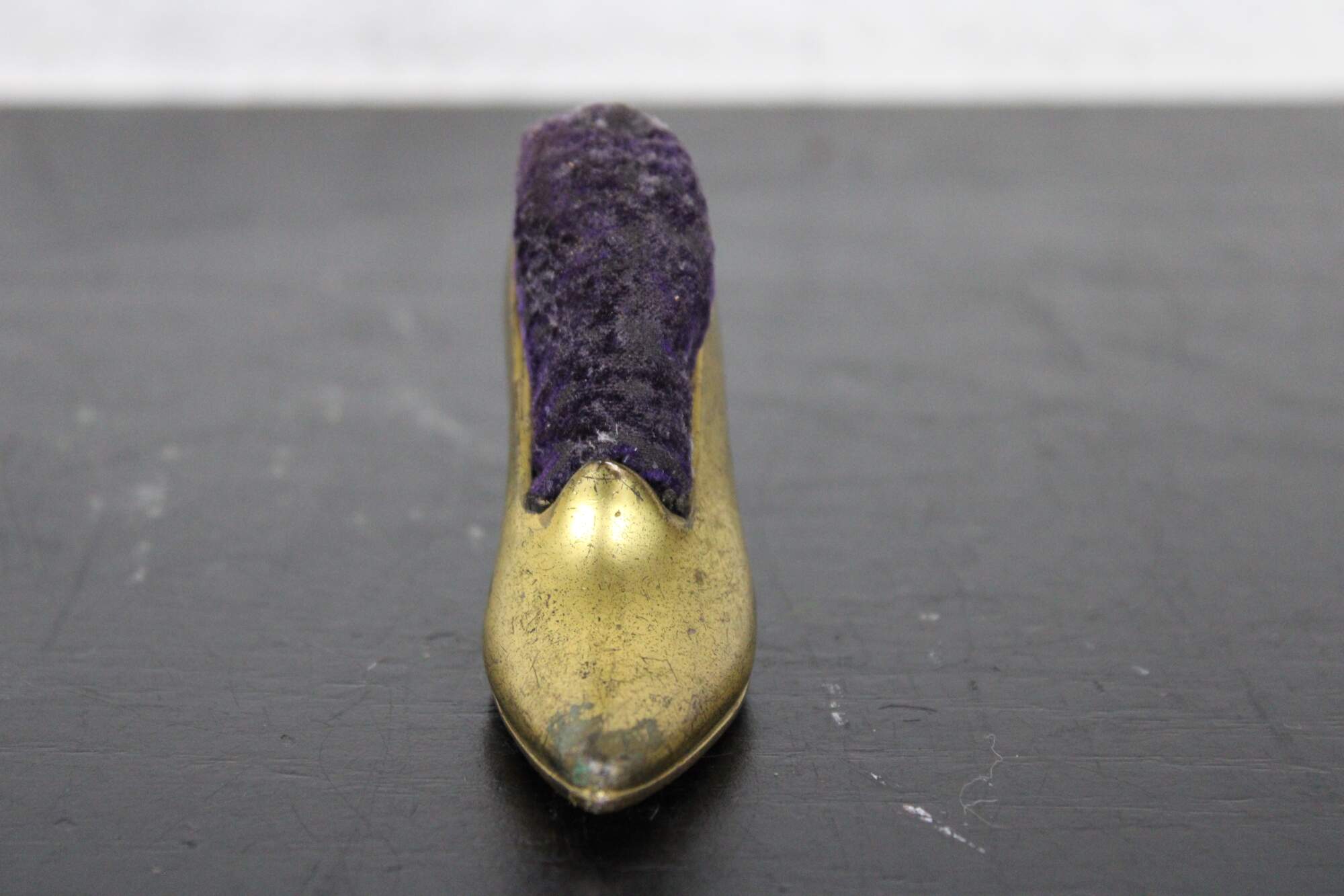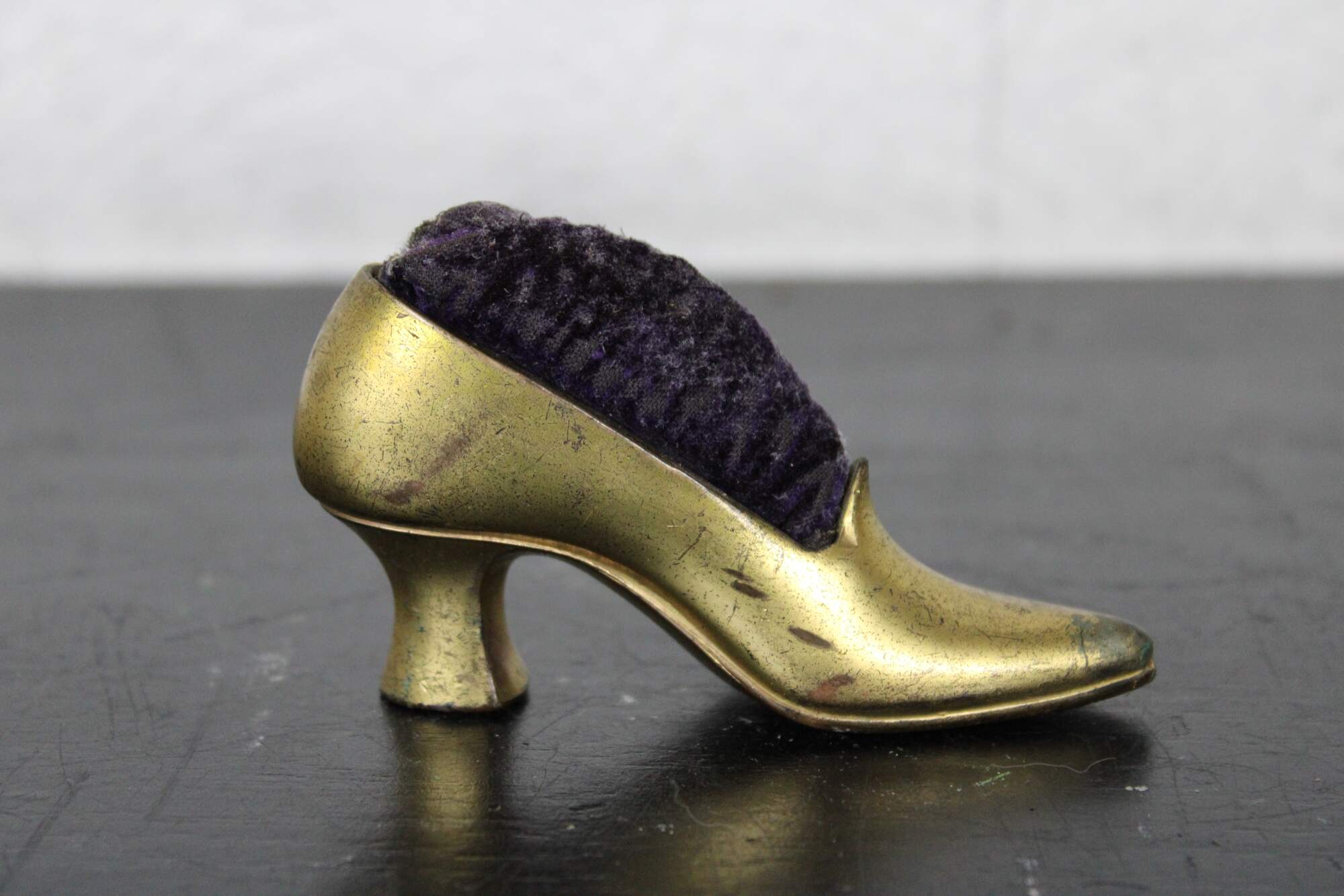 Antique Victorian saw dust filled, purple velvet pin cushion enclosed in a gilded brass miniature ladies shoe.