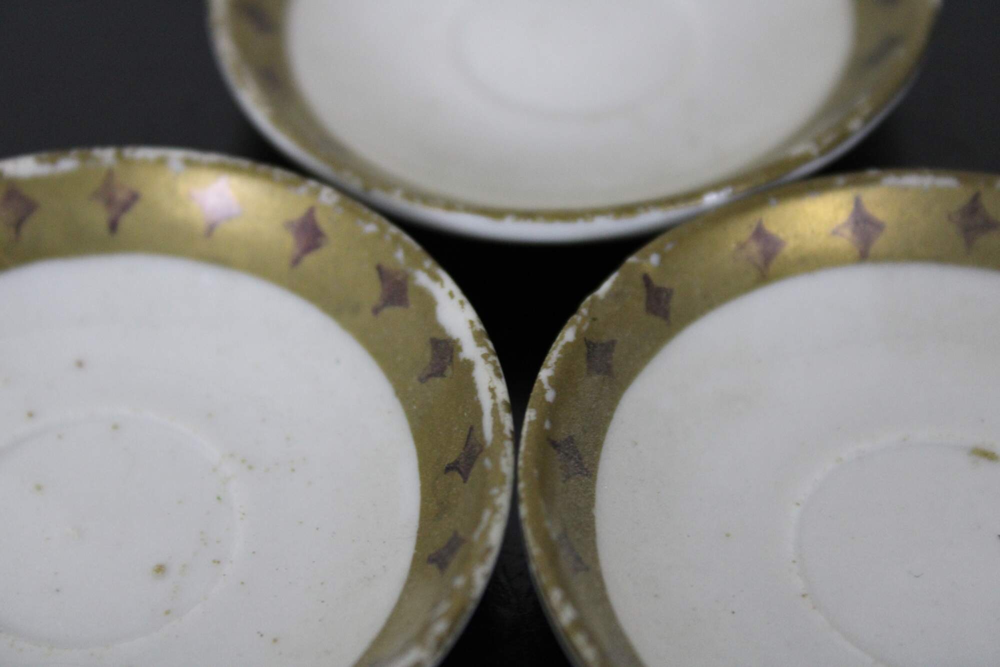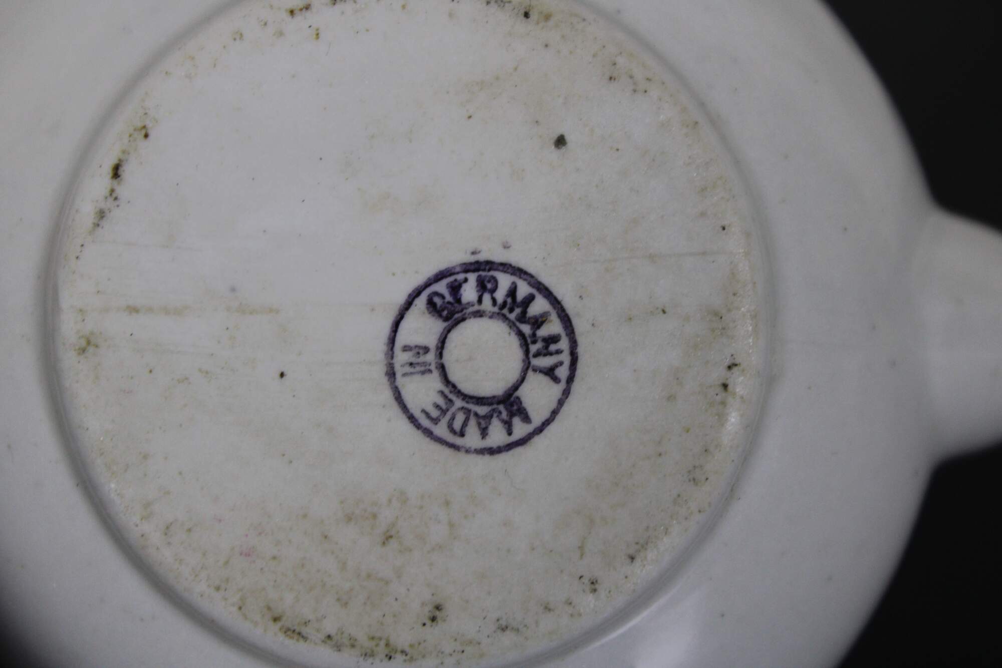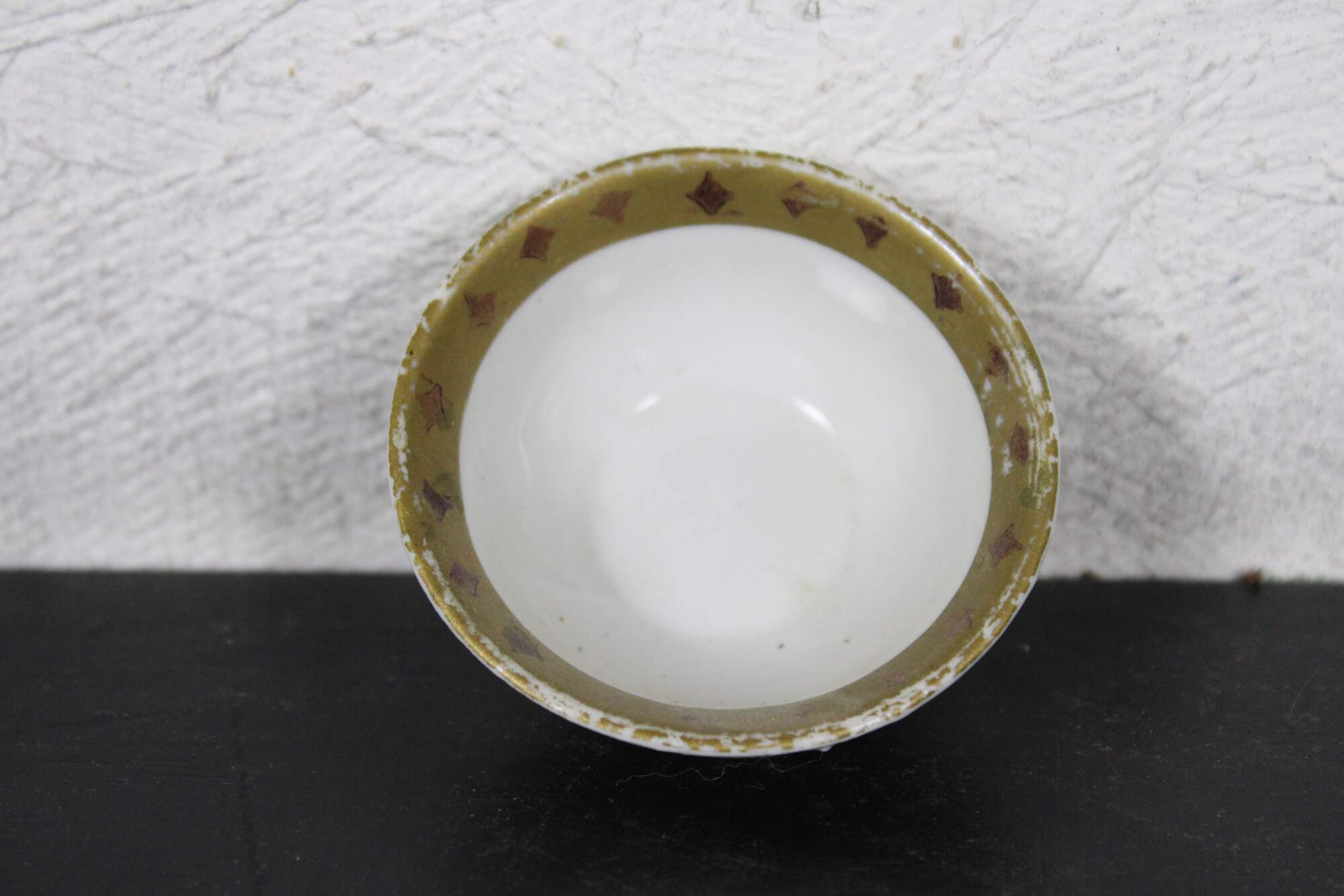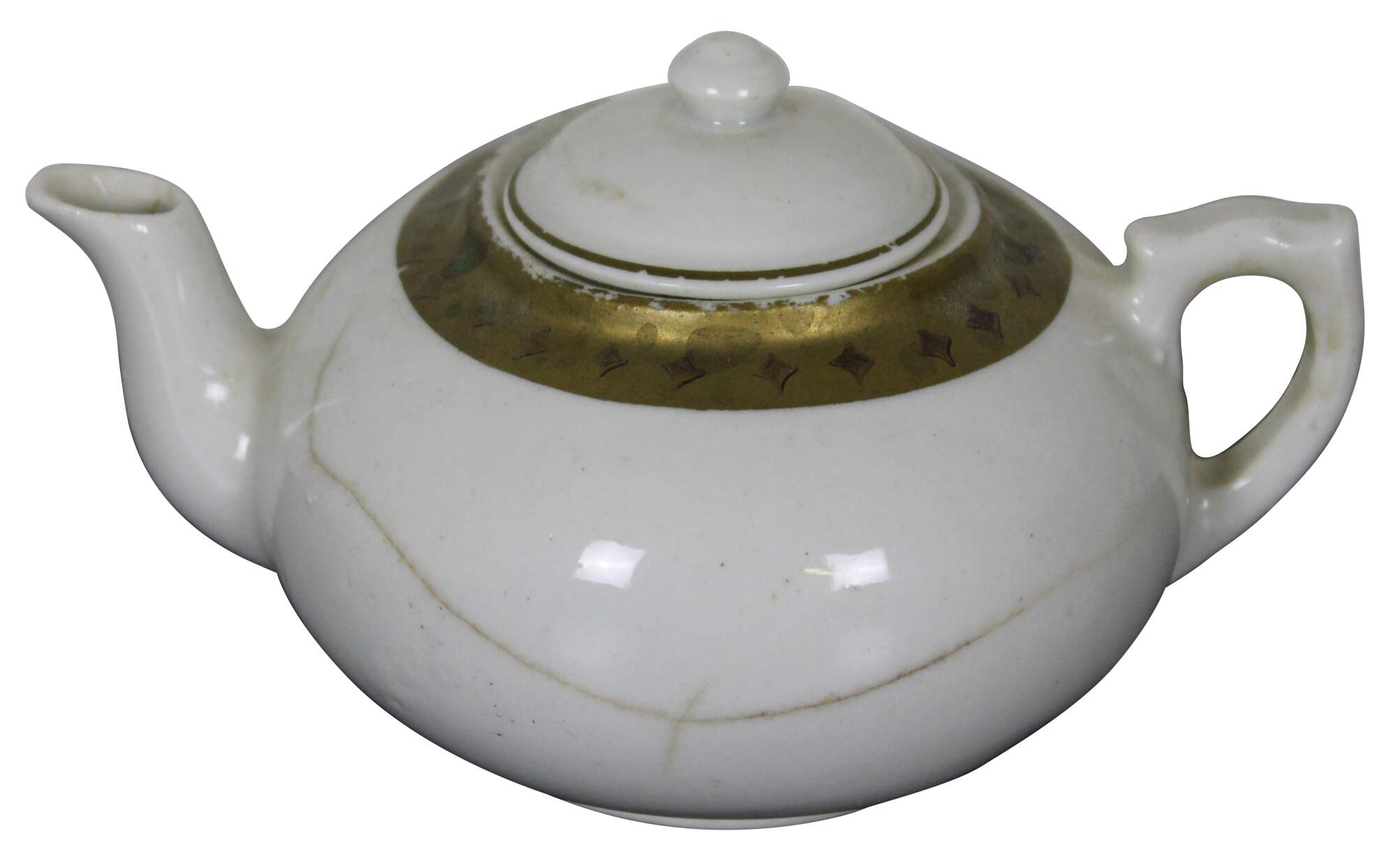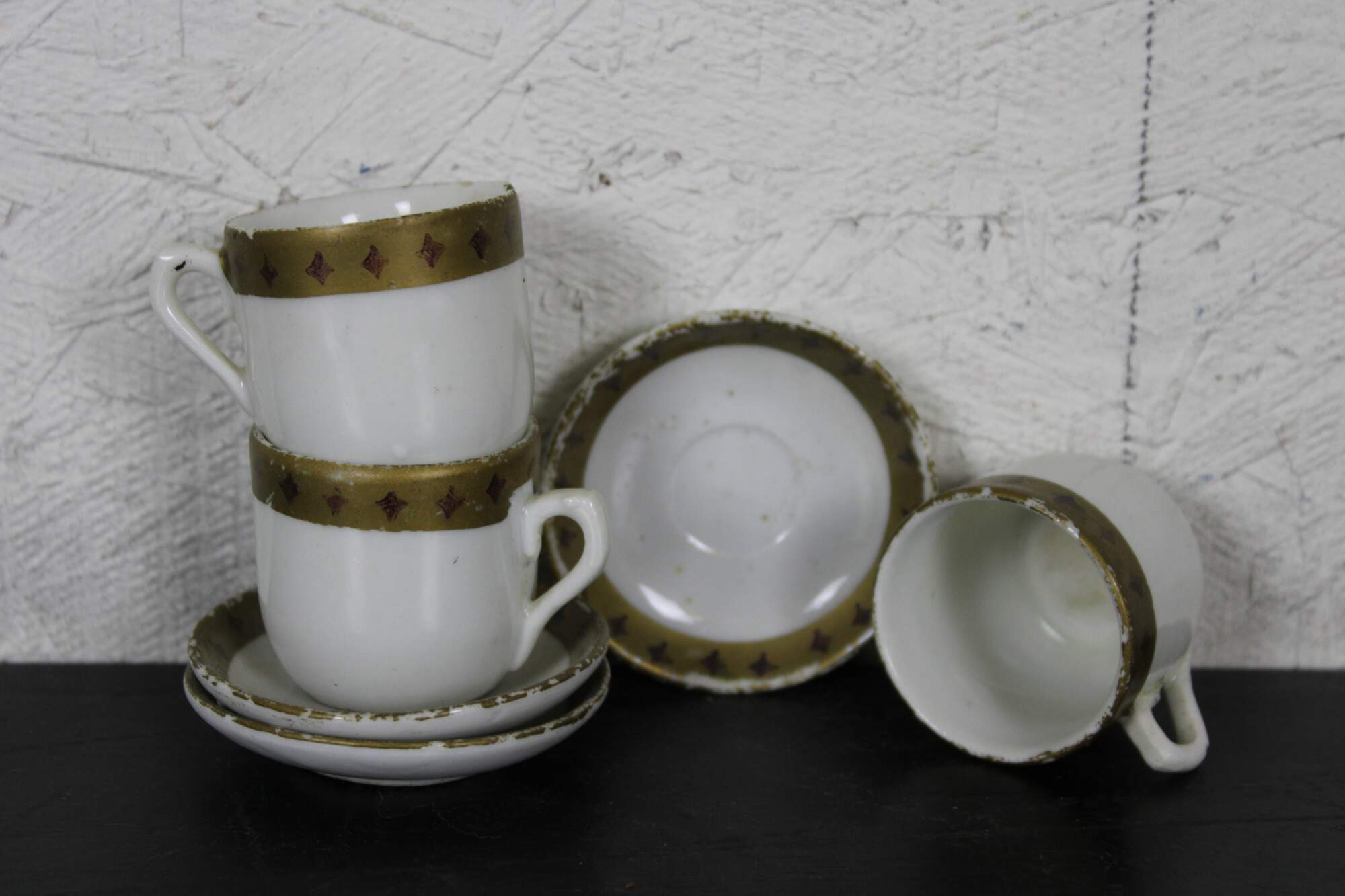 Early 20th century children’s china tea set, decorated with borders of gold with purple diamonds. Set includes tea pot and lid, 3 tea cups, 3 saucers, and a bowl.
