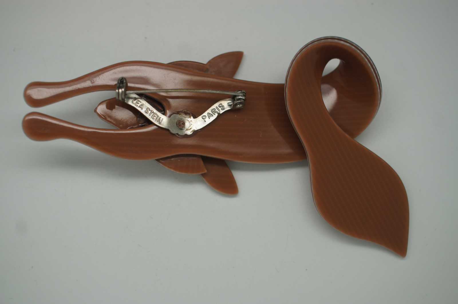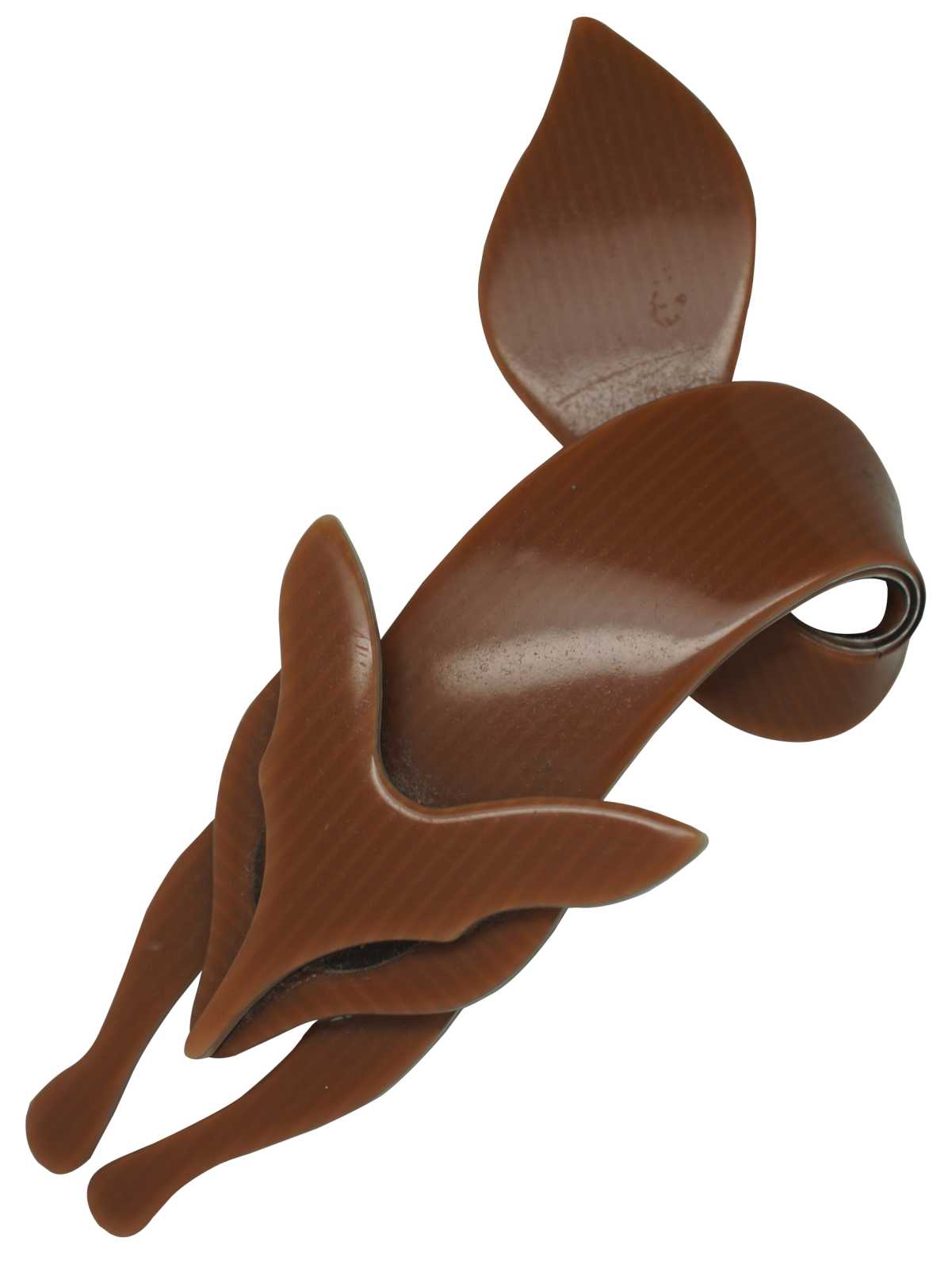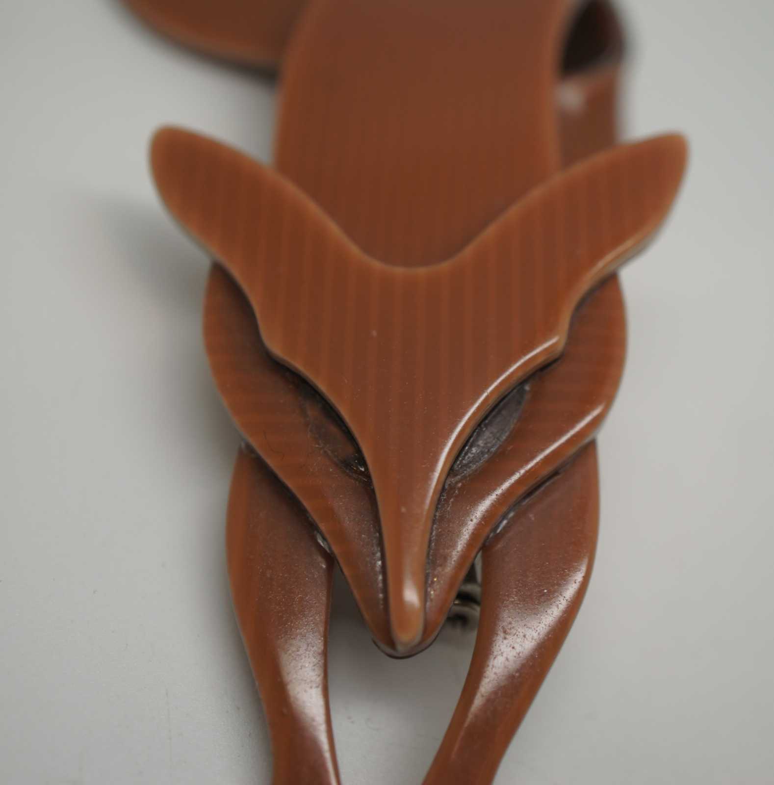 Vintage Lea Stein famous Renard fox shaped pin in subtly striped caramel brown bakelite.