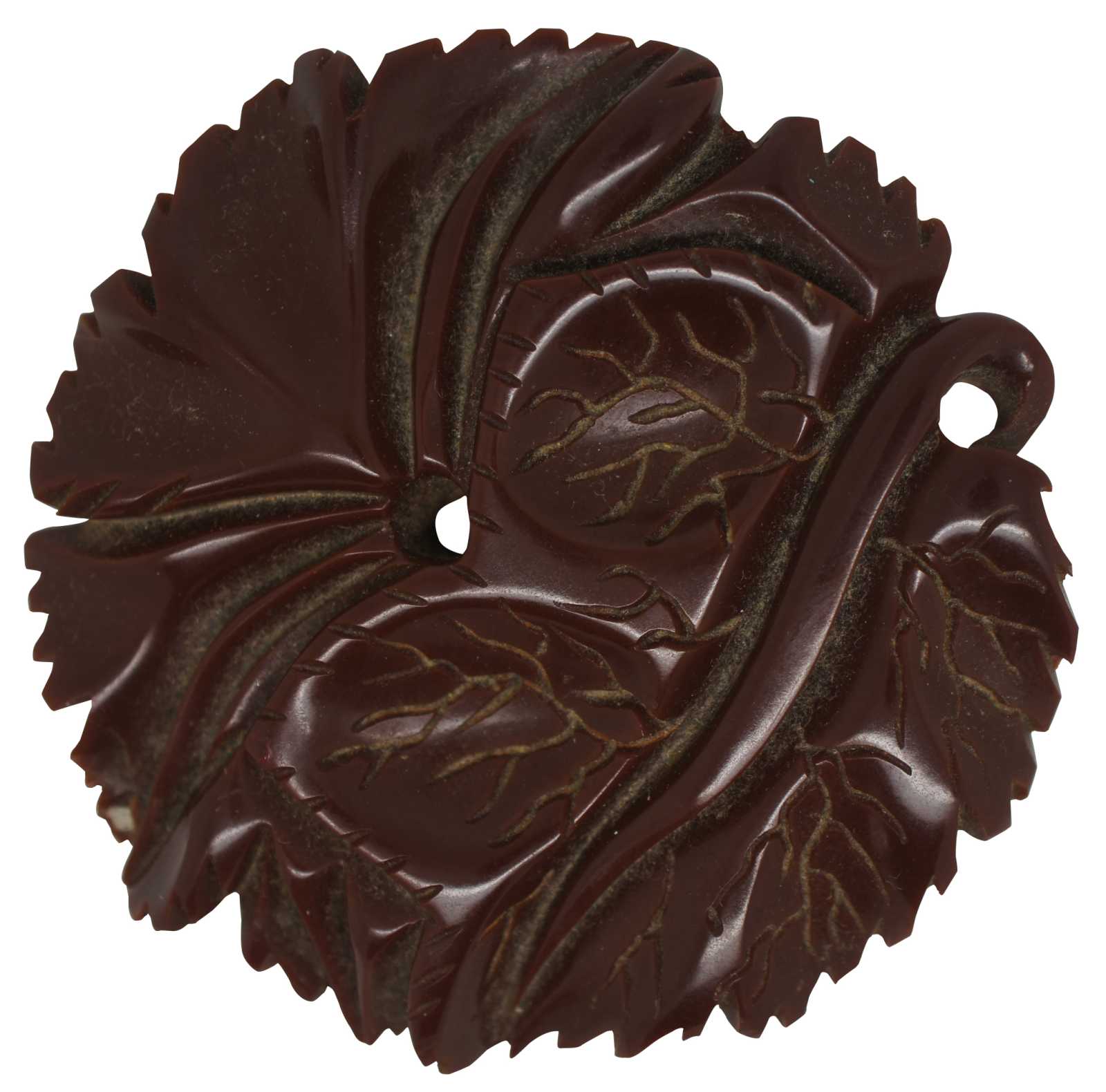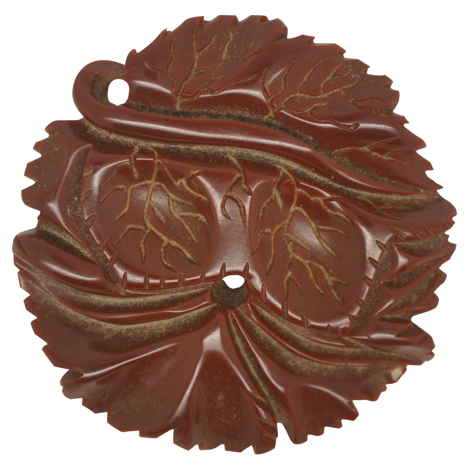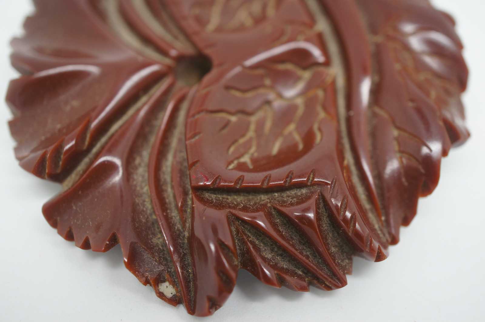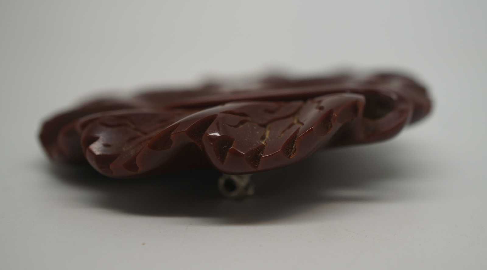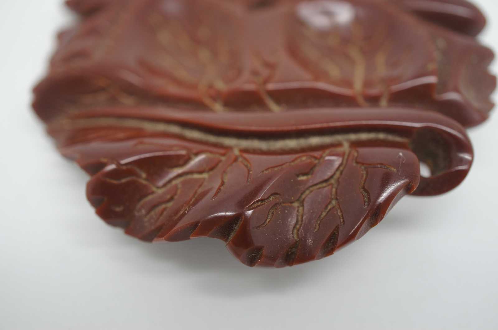 Early to mid 20th century rust brown bakelite pin, carved in the shape of veined autumn leaves.