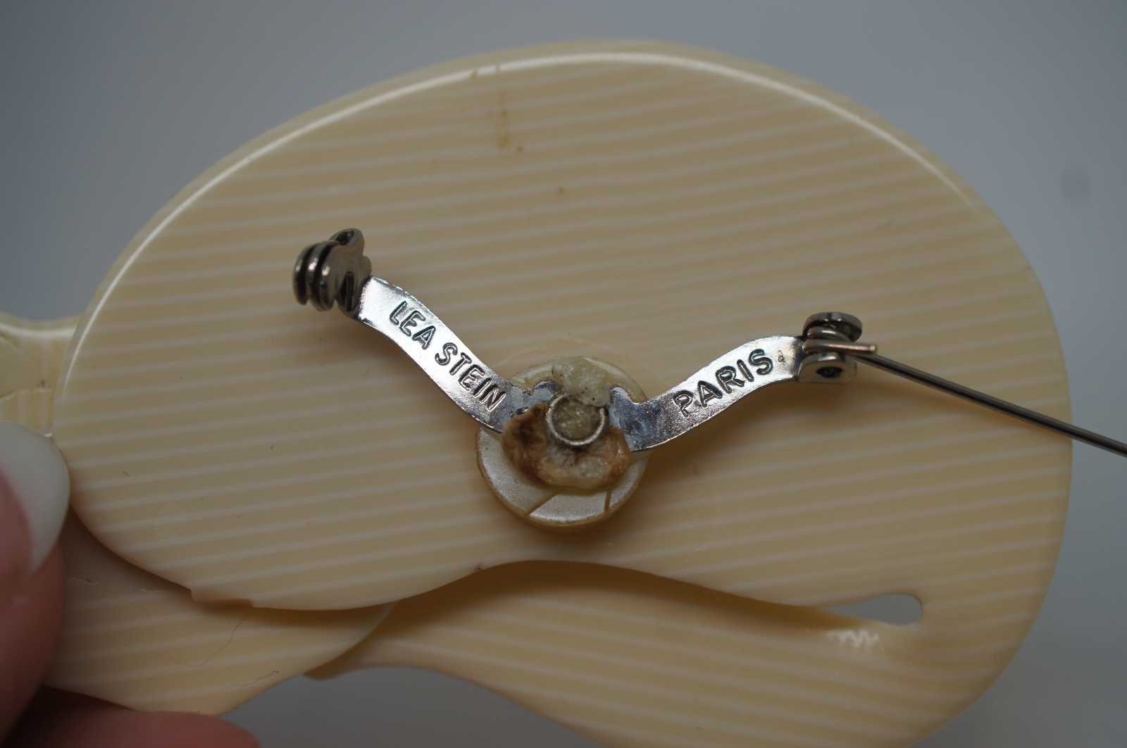 Vintage bakelite Lea Stein Gomina striped ivory/cream pin in the shape of a sleeping cat with orange and yellow mottled ears and eyes.