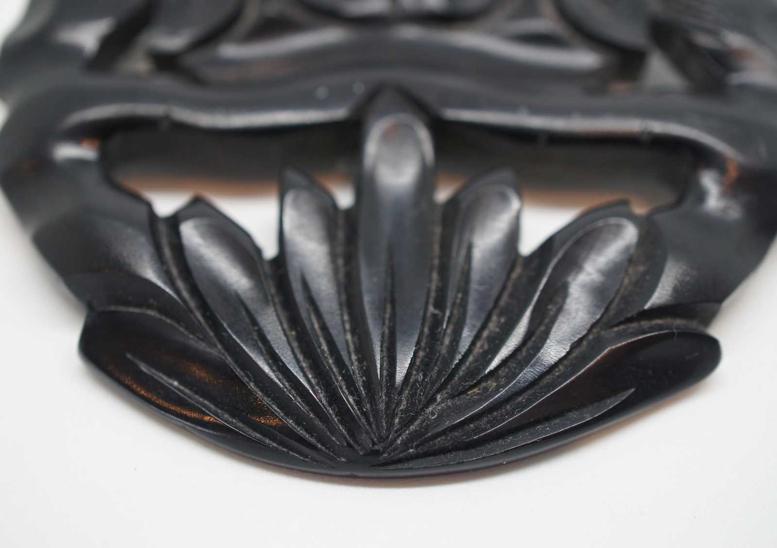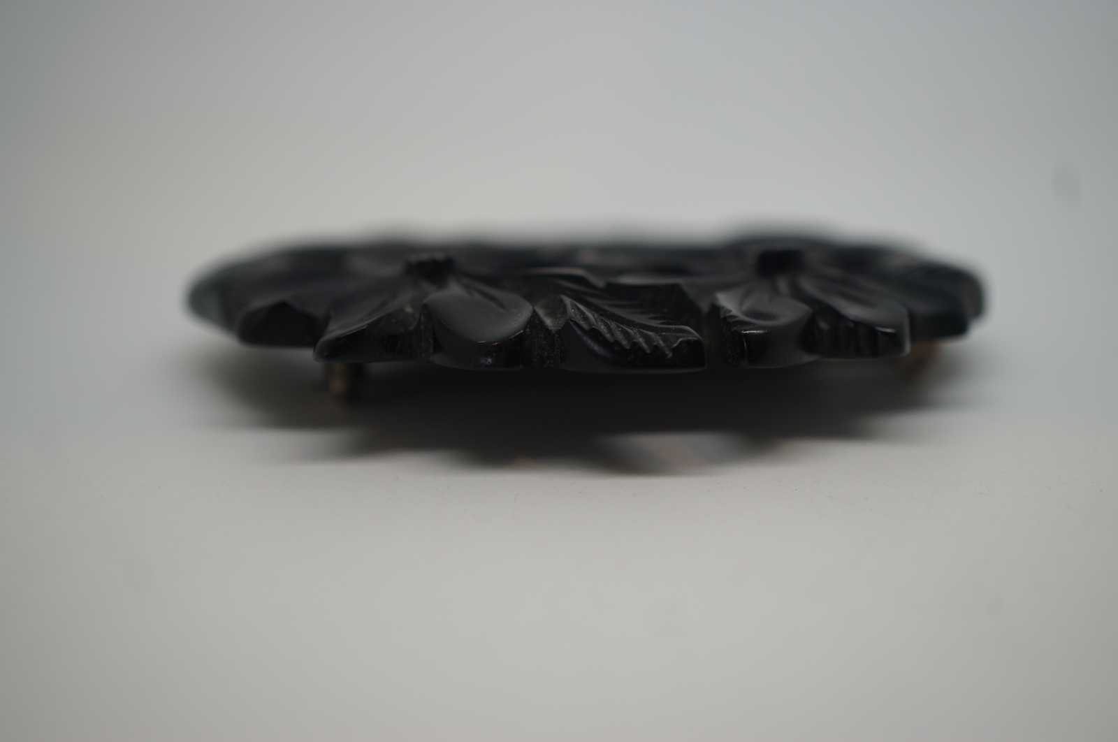 Early to mid century black floral bakelite mourning pin shaped like a basket of flowers.