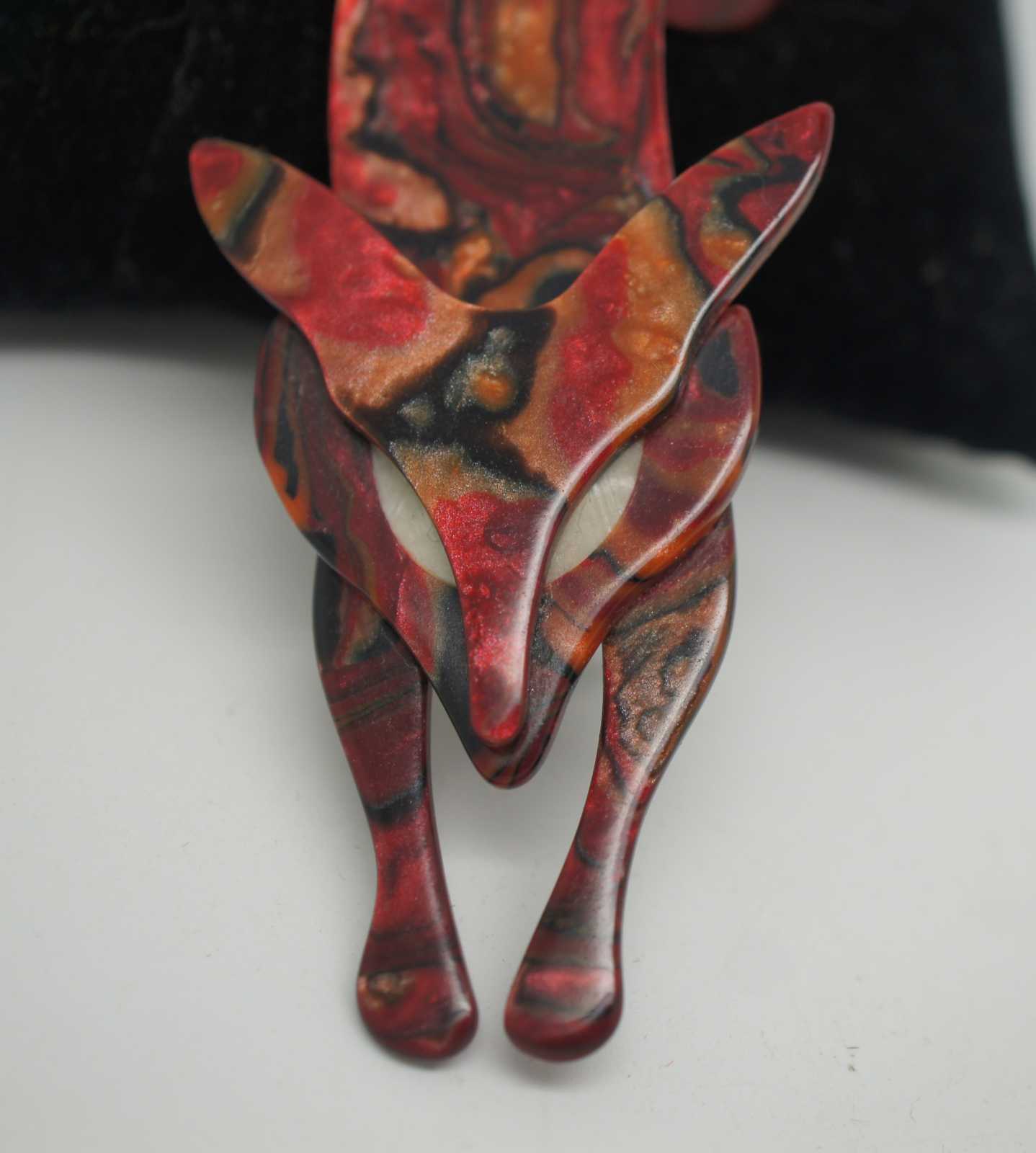 Vintage Lea Stein famous Renaud fox pin in swirling red, gold and black bakelite.