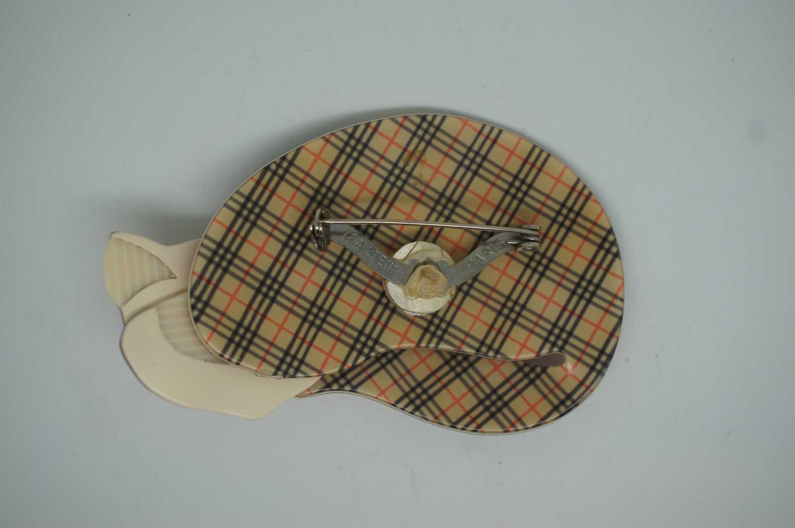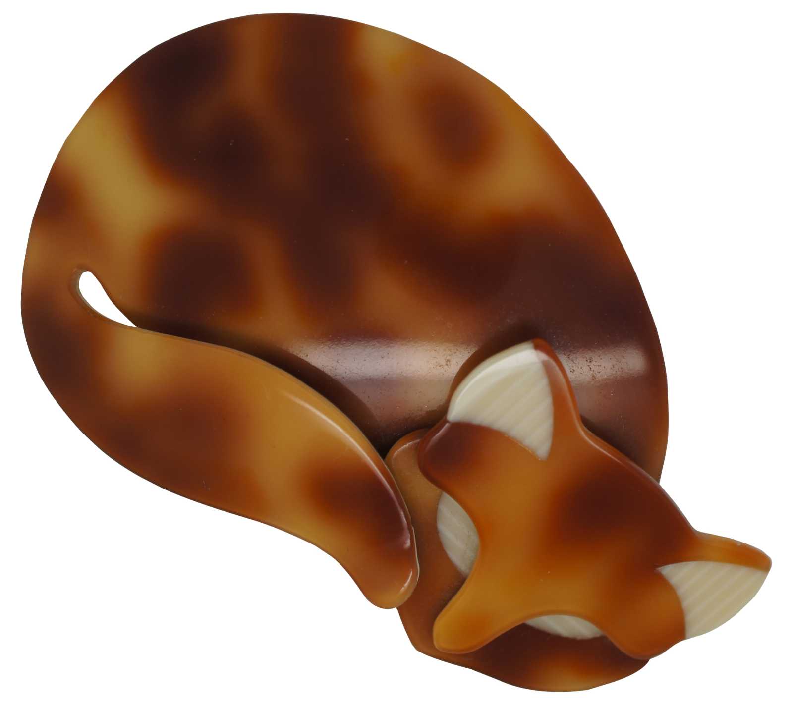 Vintage Lea Stein Gomina pin in the shape of a sleeping cat, made of orange tortoiseshell style bakelite with cream colored ears and eyes.