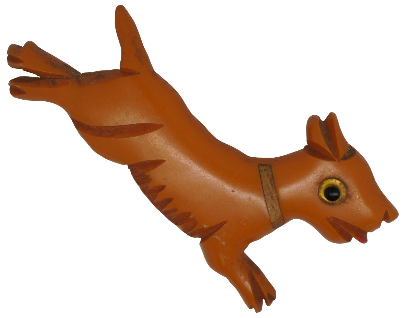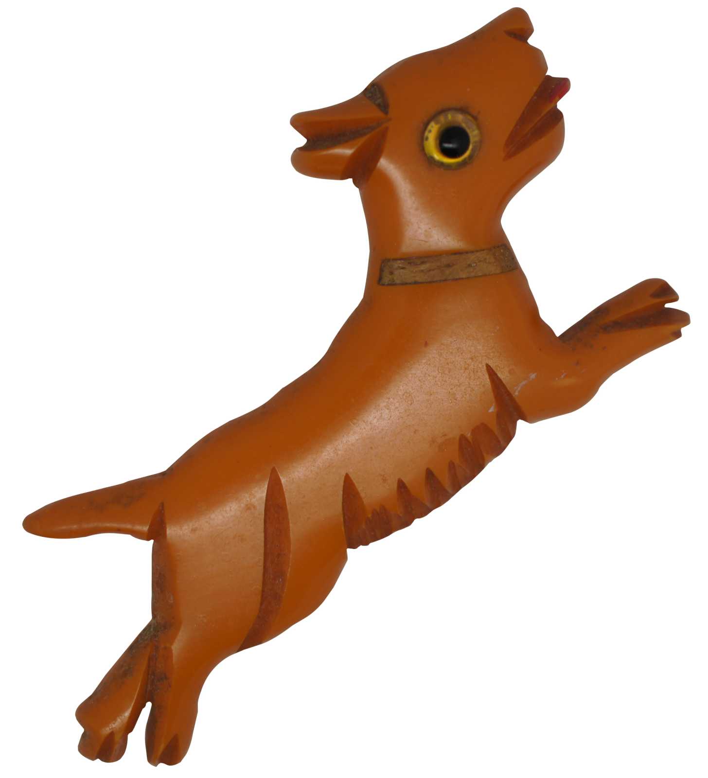 Early to mid 20th century orange bakelite pin in the shape of a running Scottish terrier with painted collar and glass eye.