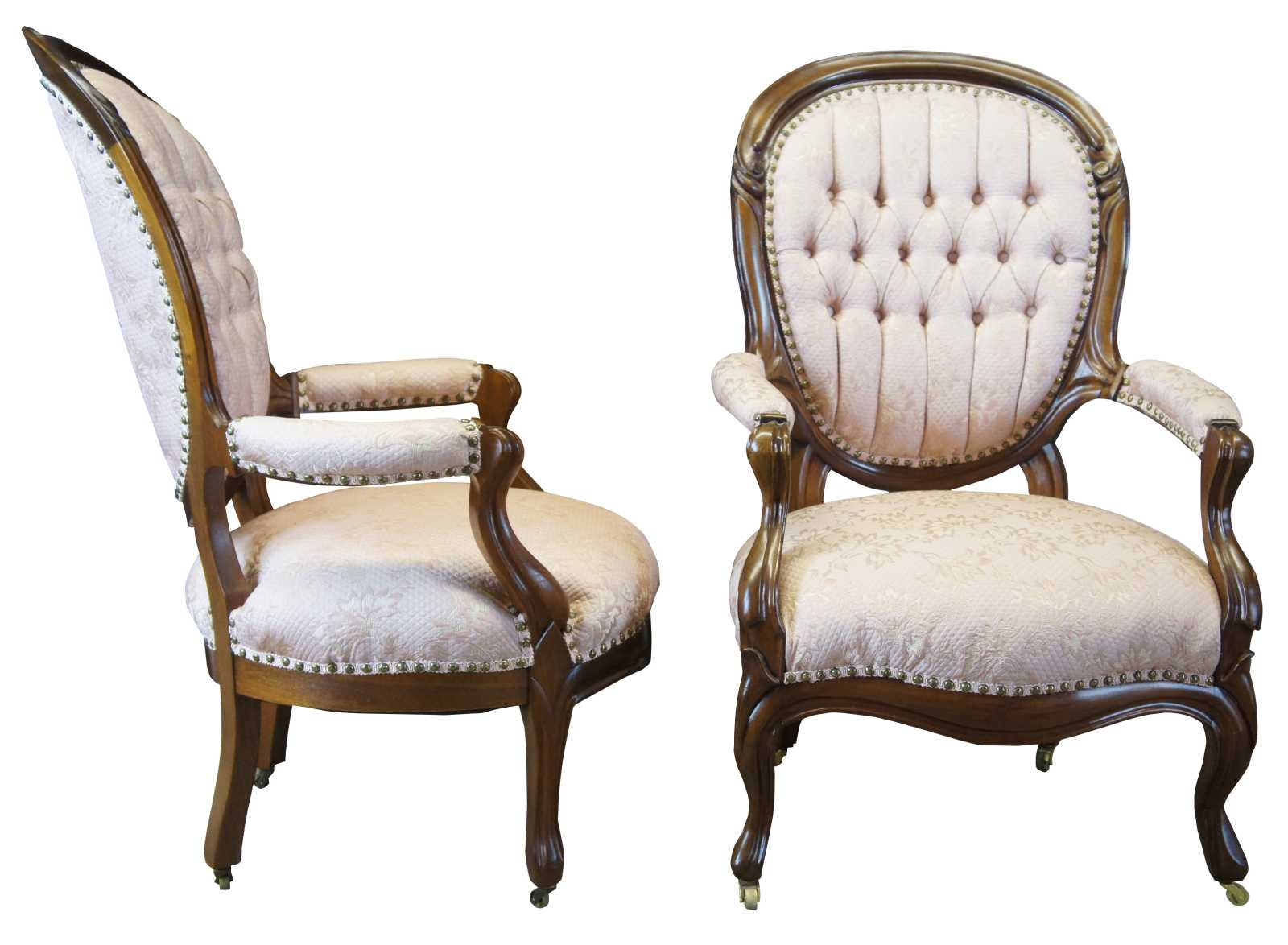Pair of two antique Victorian his and hers parlor arm chairs. Made of walnut featuring serpentine form with blush pink floral upholstery, tufted balloon backs, padded arms, nailhead trim, and brass swivel castors.