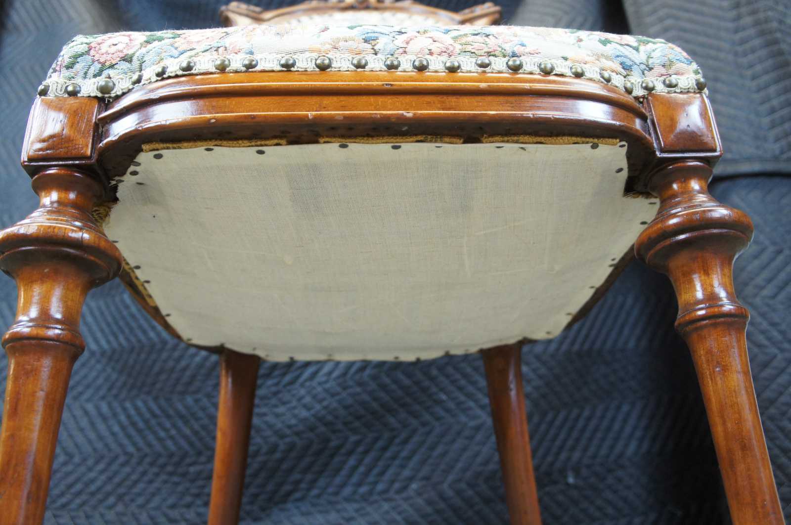 Antique Victorian Renaissance Revival walnut parlor / vanity / dining chair featuring ornate carvings, needlepoint upholstery, nailhead trim and front castors.