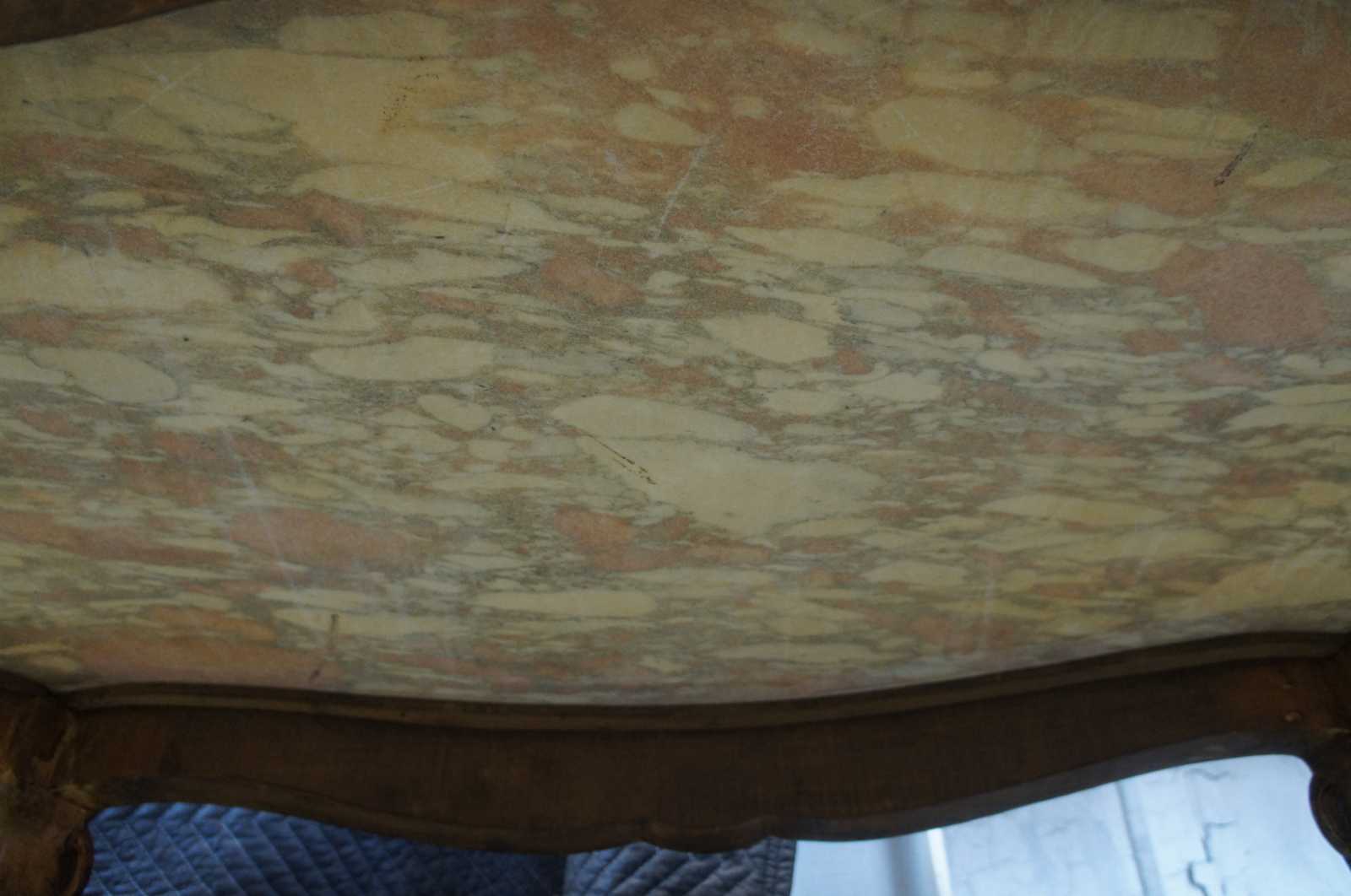 Antique French Provincial coffee table. Made of walnut and pink marble featuring oval serpentine form with scrolled and beveled accents.