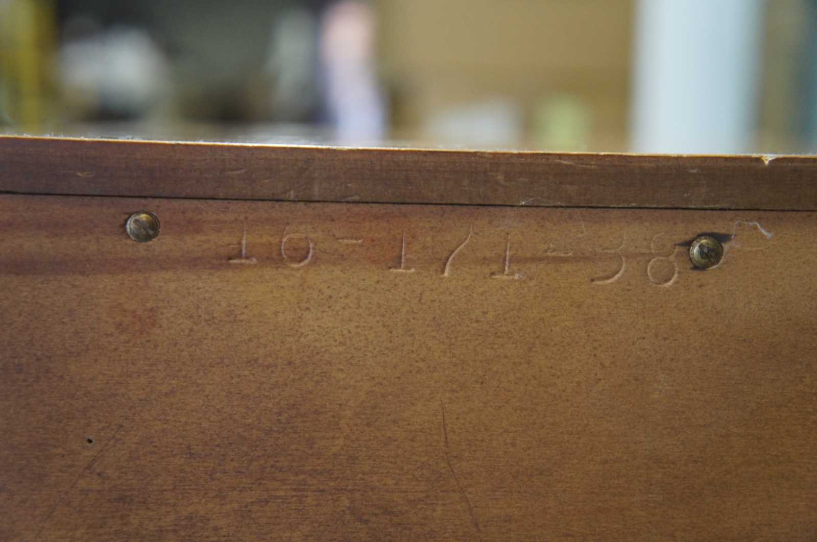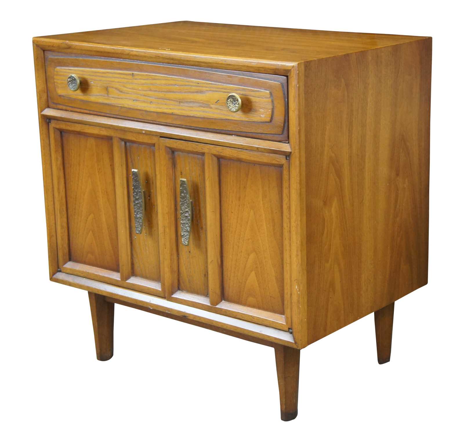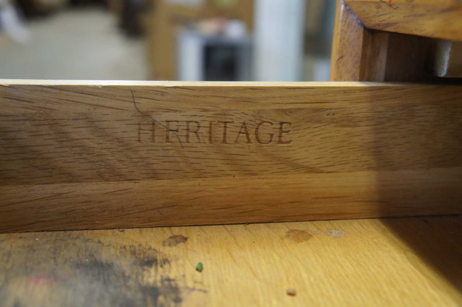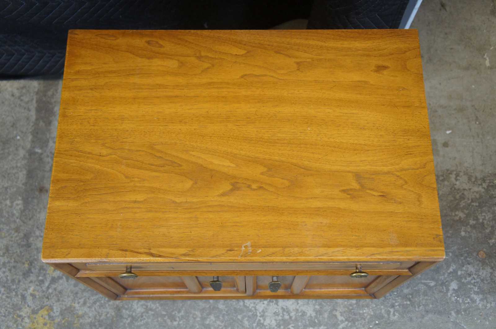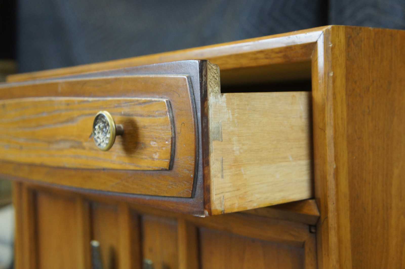 Good vintage condition, some edge wear, light finish loss, distressing, staining in drawer.