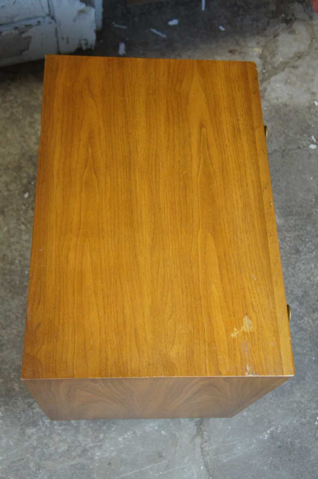 2 mid century modern Drexel Heritage side tables. Made of walnut and oak featuring an upper drawers and lower cabinet for storage 16-171-38
