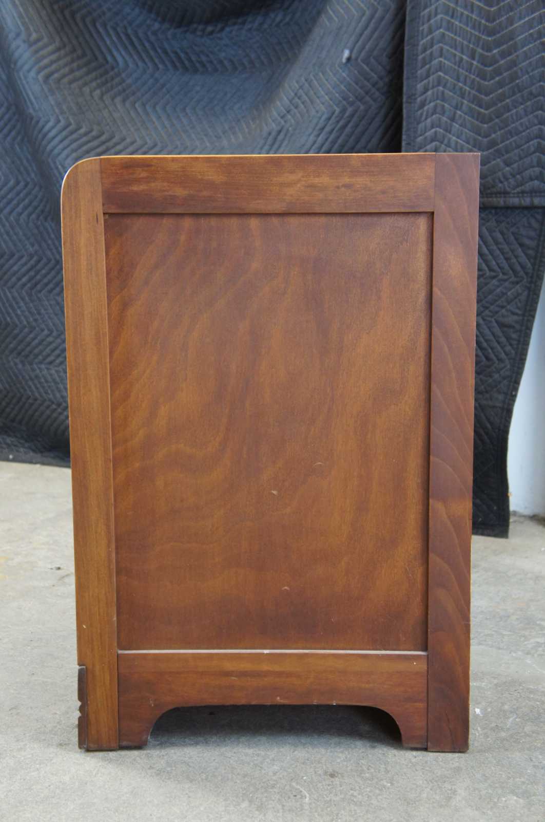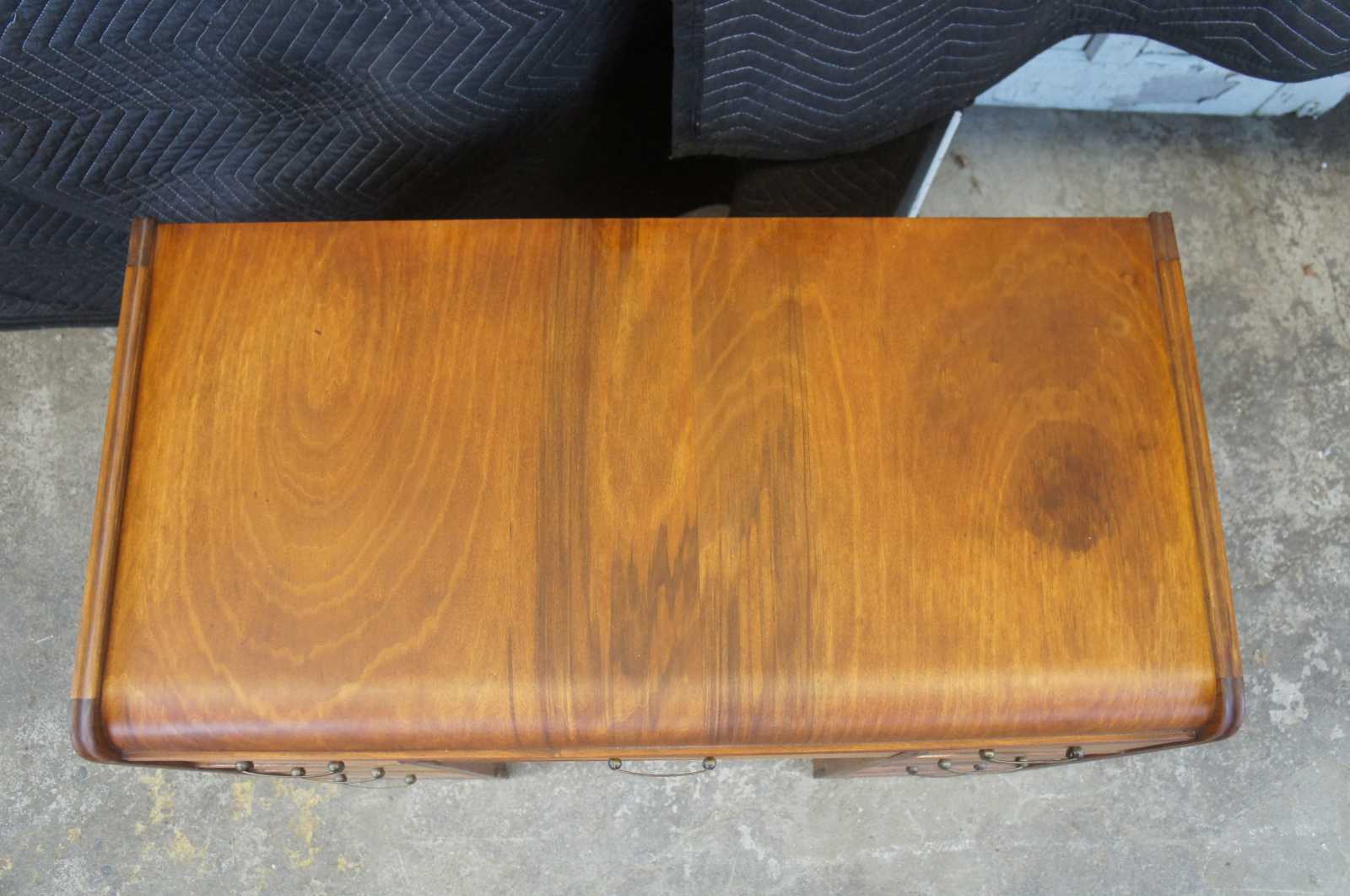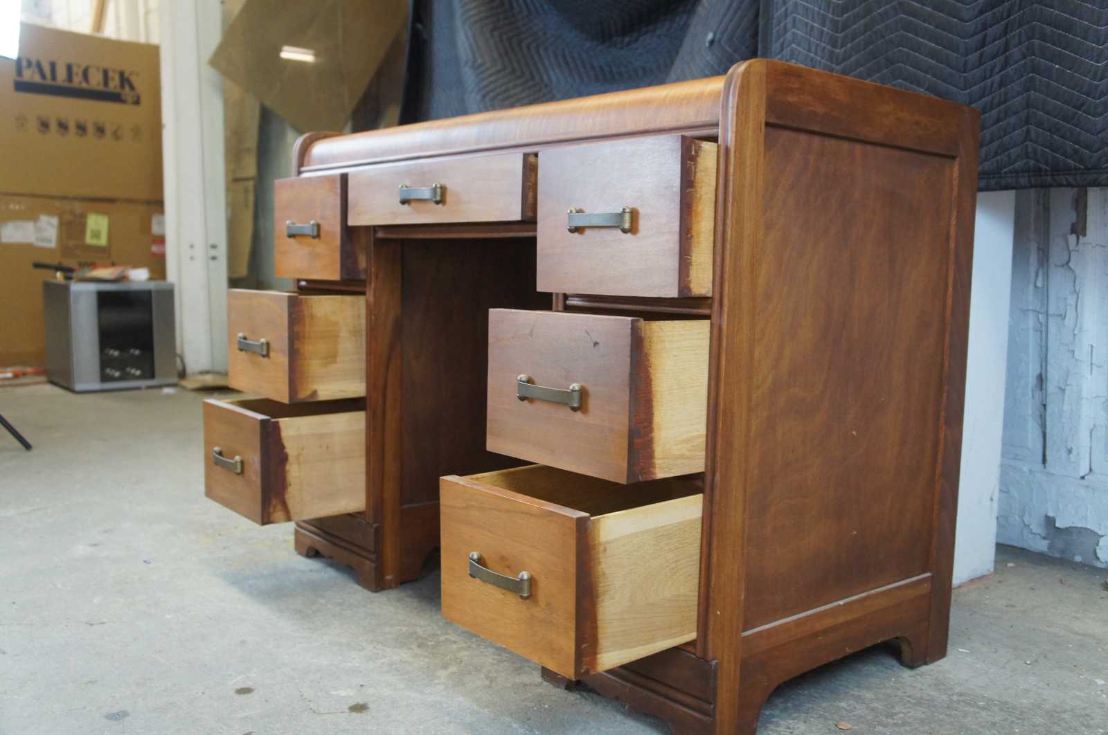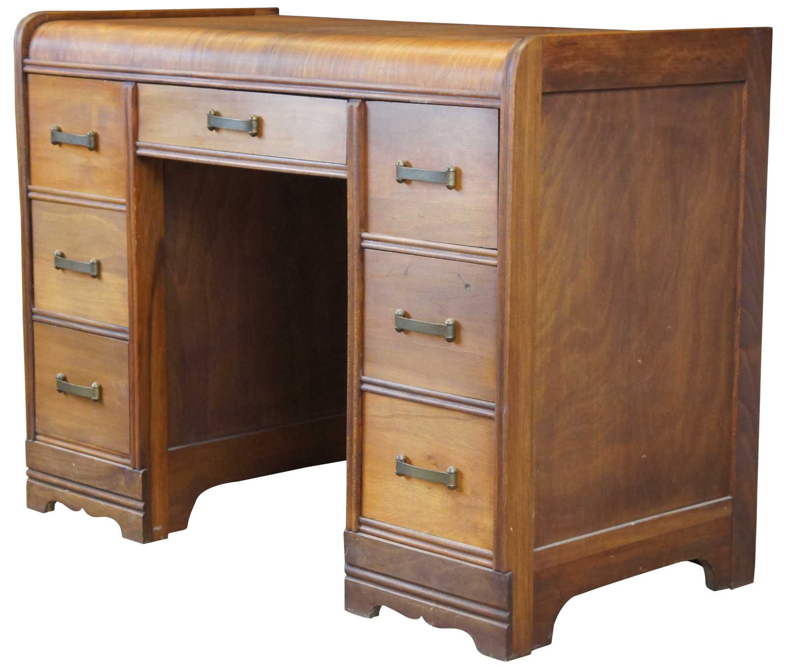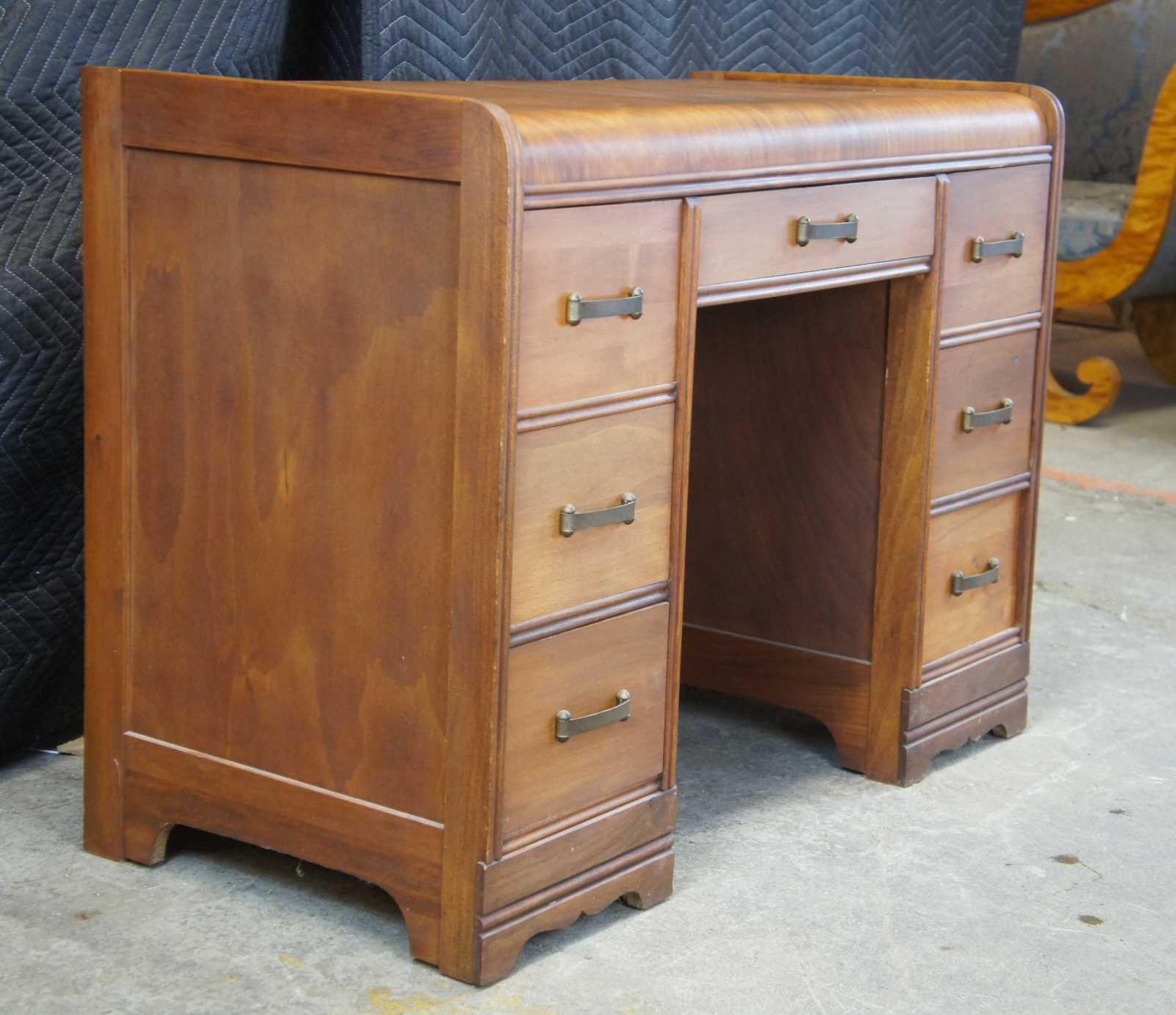Antique American Walnut Art Deco Library Desk. Features a waterfall front and seven dovetailed drawers with brass hardware.