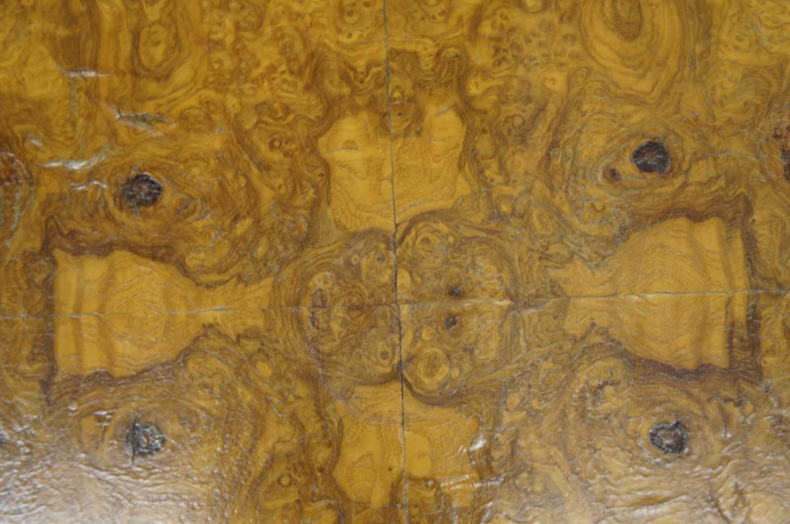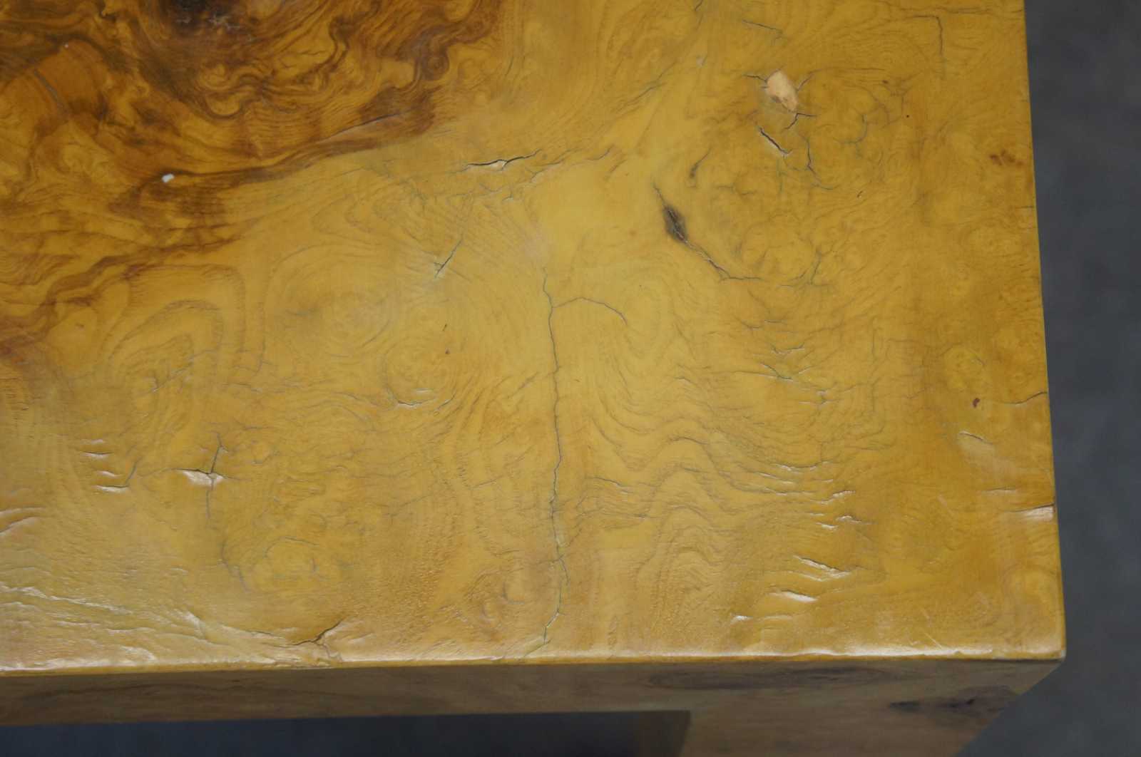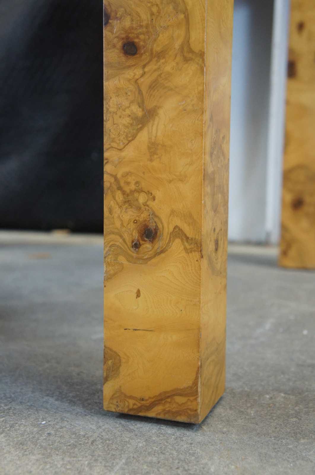 Circa 1970s Olive Ash Burl square form Parson style dining or card table. Inspired by the design elements of Milo Baughman from the 1960s. Made from pine with matchbook veneer. A handmade original custom order made by Ronald E. Wampler. Now R.E. Wampler & Son out of bellbrook, Ohio.