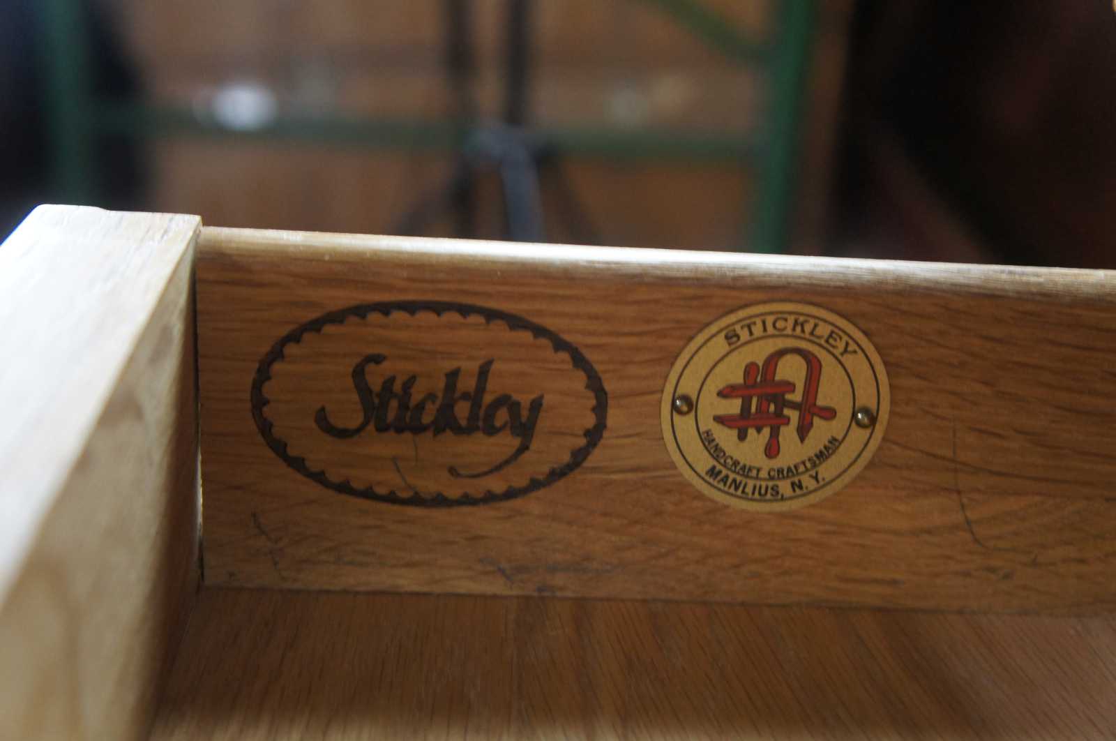 Stickley oval shopmark brand and metal ""Mission Medallion"" (Adopted in 1985 and 1989 respectively)