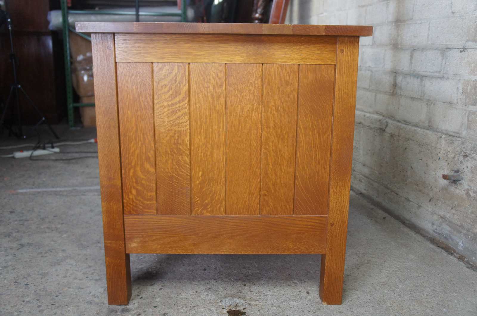 Solid very well figured quarter-sawn Oak throughout (quarter-sawing is a method of sawing oak logs to produce boards with superior strength making it less likely to crack shrink or warp. It also gives the finished boards prominent highly decorative 'medullary rays' in its grain.)