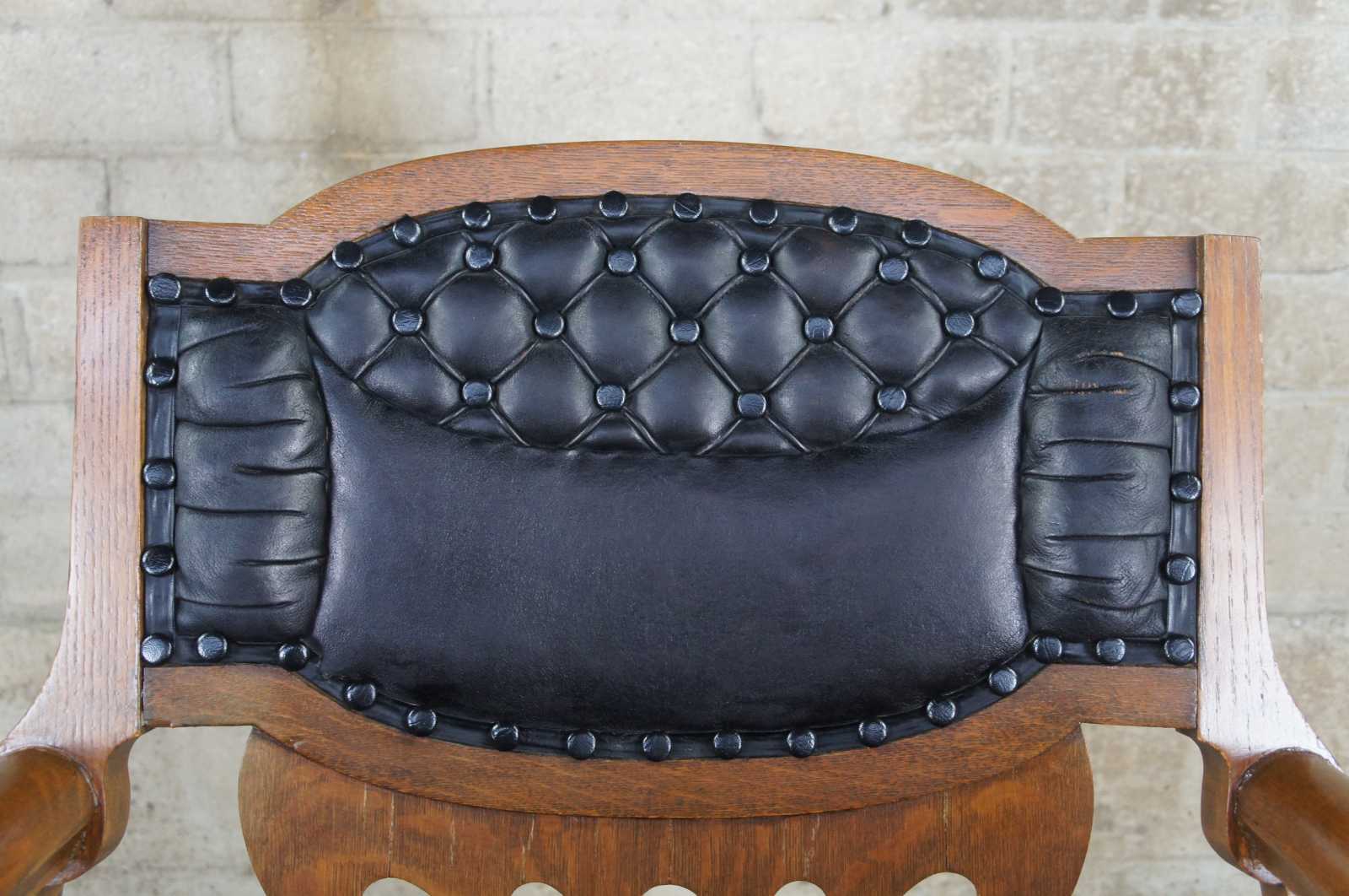Antique Victorian era quartersawn oak barrel or saddle seat rocker featuring serpentine form for slatted accents, tufted black leather with nailhead trim.