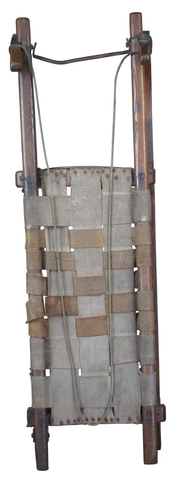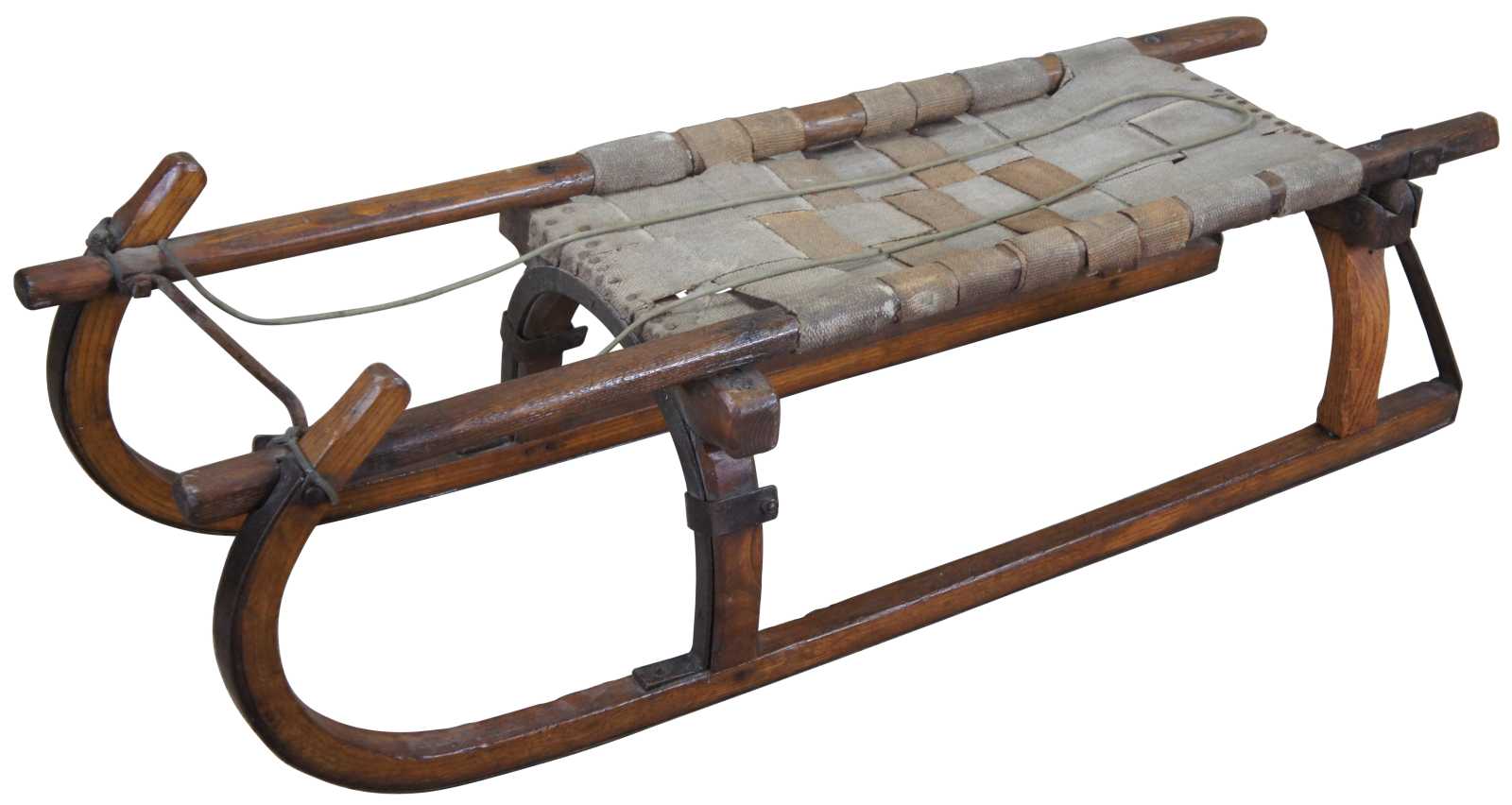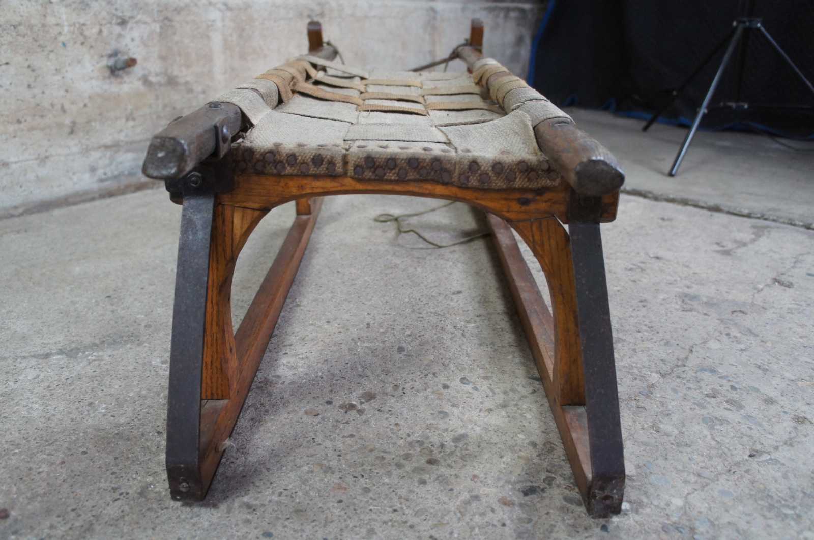 Antique Norwegian sled. Made of oak with bentwood Grindelwalder form featuring wrought iron supports with woven burlap seat.