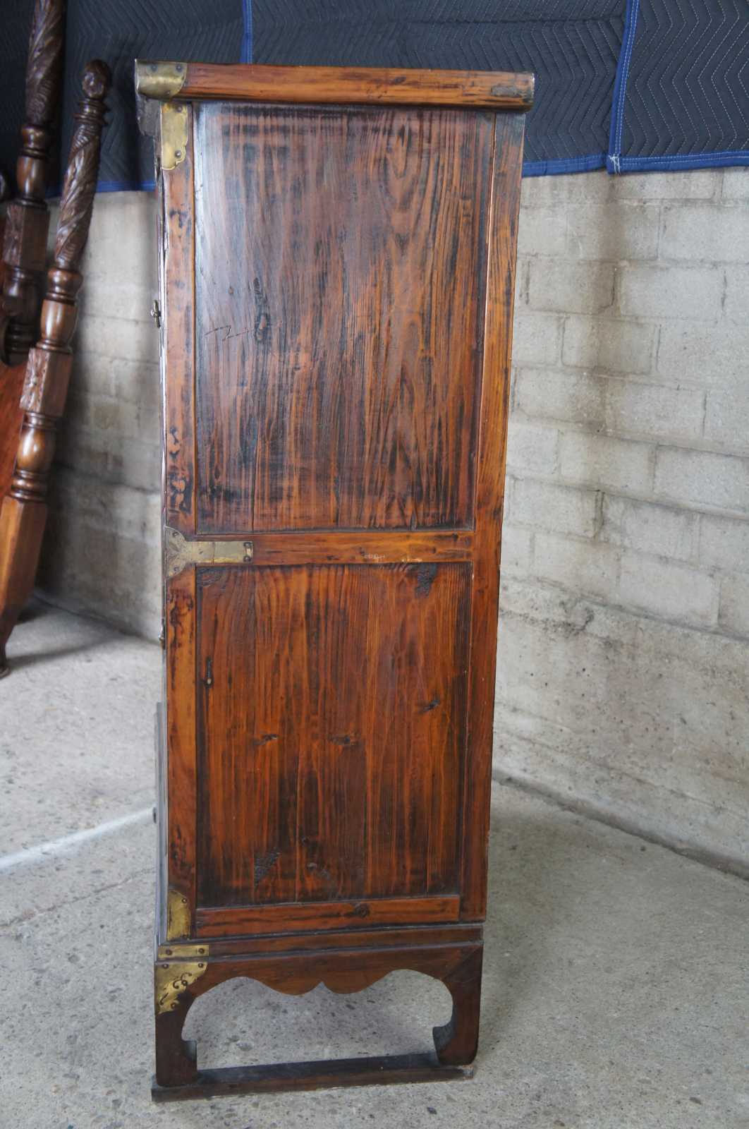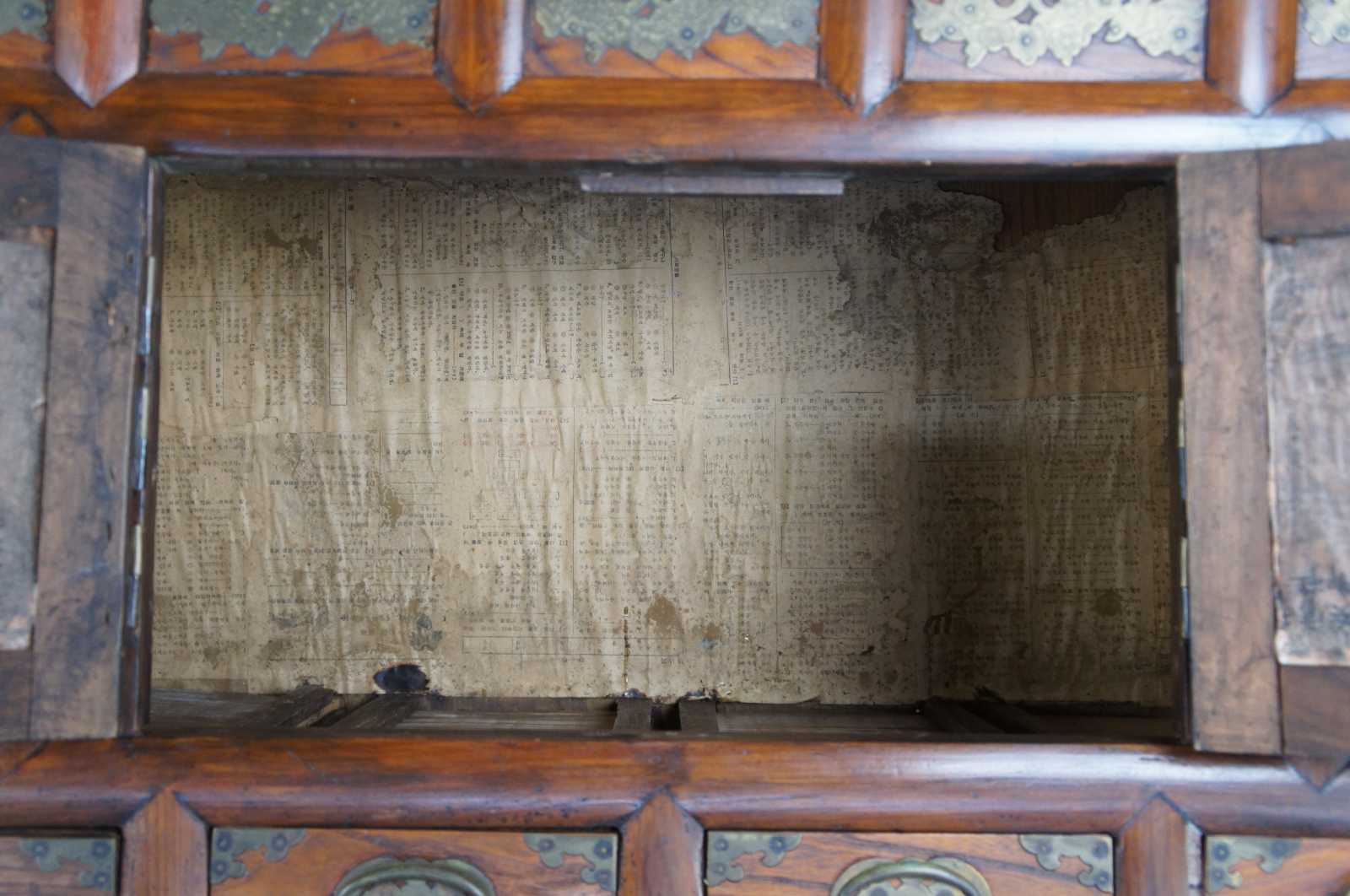 Antique Korean Bandaji chest or trunk featuring Zelkova elm frame with brass accents. The Korean name bandaji (literally meaning ""half closing"") derives from the hinged door in the front of this chest. This type of chest was one of the most essential, and most commonly found, pieces of furniture in a Korean household. Clothes, documents and valuables would be stored inside while folded blankets would be placed on top during the day (which explains why it is called a ""blanket chest"" in English). This chest, with its richly decorated fittings and extensive metalwork, was produced in the northern provinces of the Korean peninsula, mid nineteenth century; Kyong'gi Province, Joseon Dynasty (1392 - 1897).