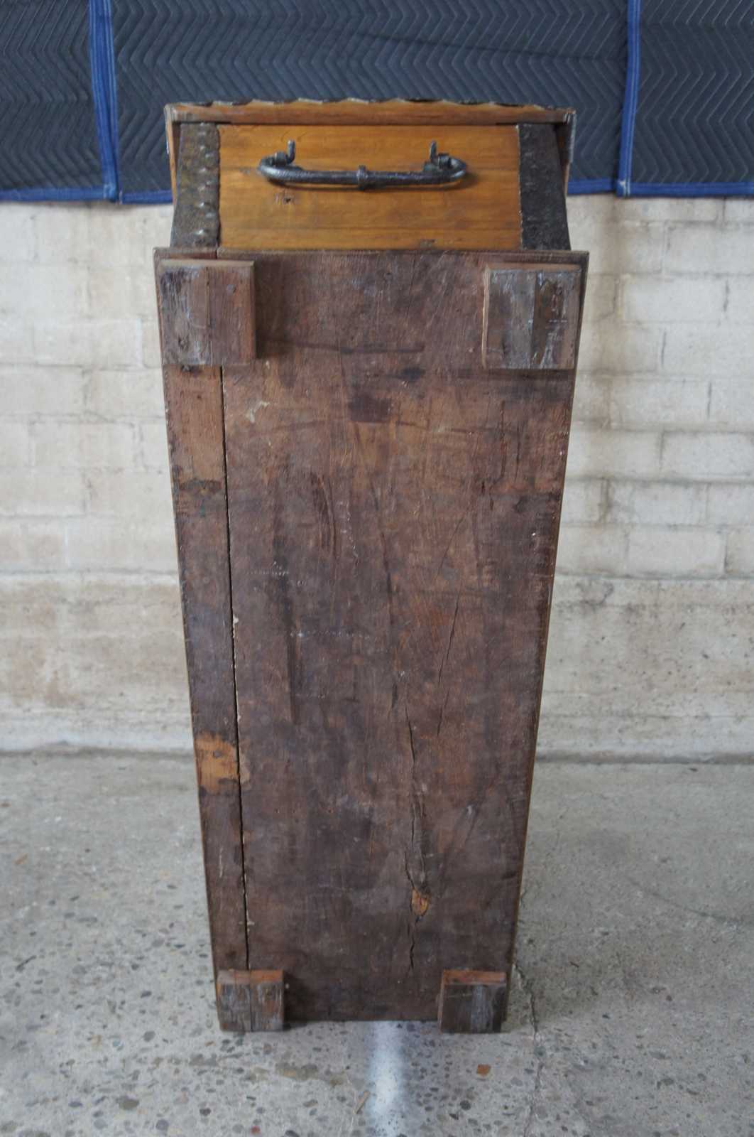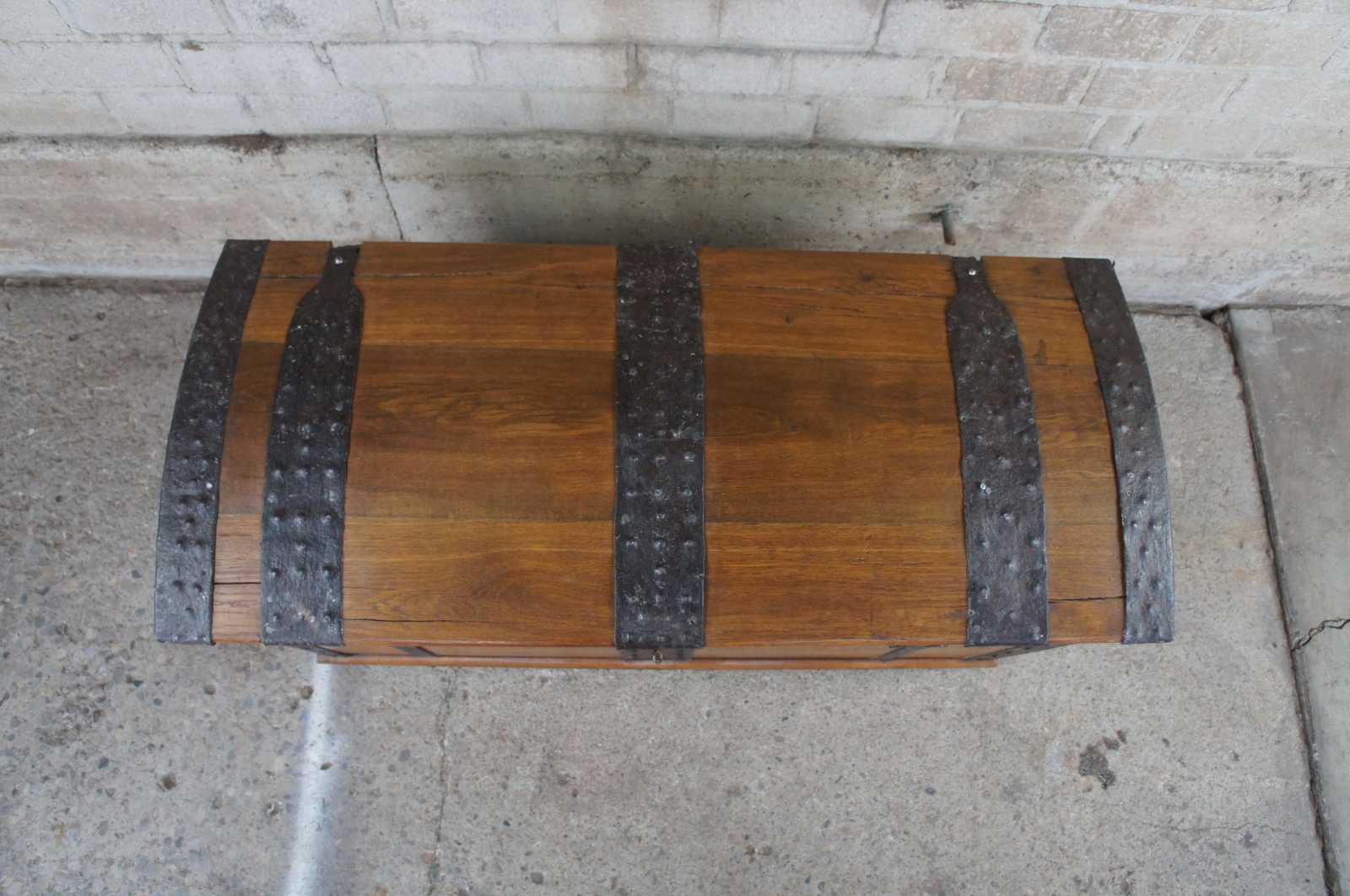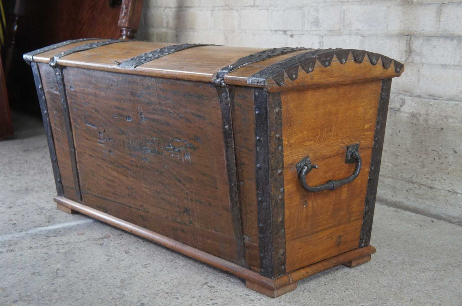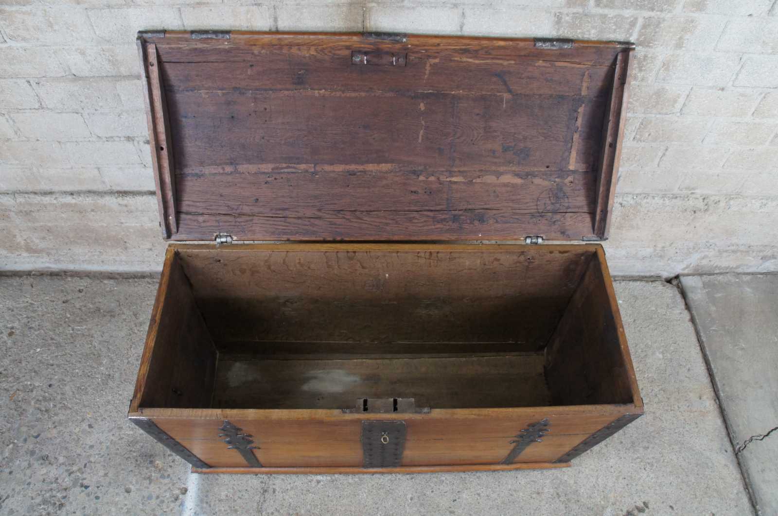 Designed to serve as a container for sea transport, sea chests were sometimes elaborately adorned with intricate ironwork as is the case with this museum quality extra large, hinged, dome top chest. The chest has high quality, detailed, decorative forged iron edging. Includes a working lock. The top of the chest shows the remnants of an old paper tag as well as unique hand stenciled three petal rosettes. Circa Late 18th to Early 19th Century Swedish/ Norwegian (Scandinavian).