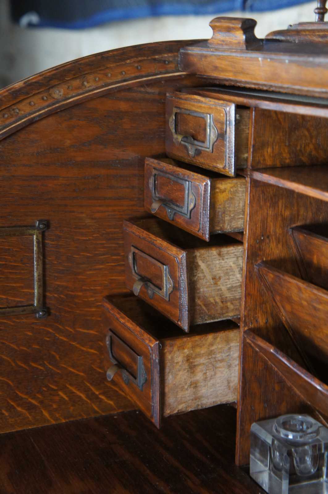 Rare antique Victorian roll top library writing desk. Made of quartersawn oak featuring a tambour door that opens to multiple cubbies / compartments and file / letter storage with two inkwells and pen holder. Also features an upper gallery with turned wood accents, two drawers, lower bookcase shelves and serpentine bracket feet. Reminiscent of a Davenport or ships desk. Pen made by Kohinoor Germany no 130. Complete with working lock and key.