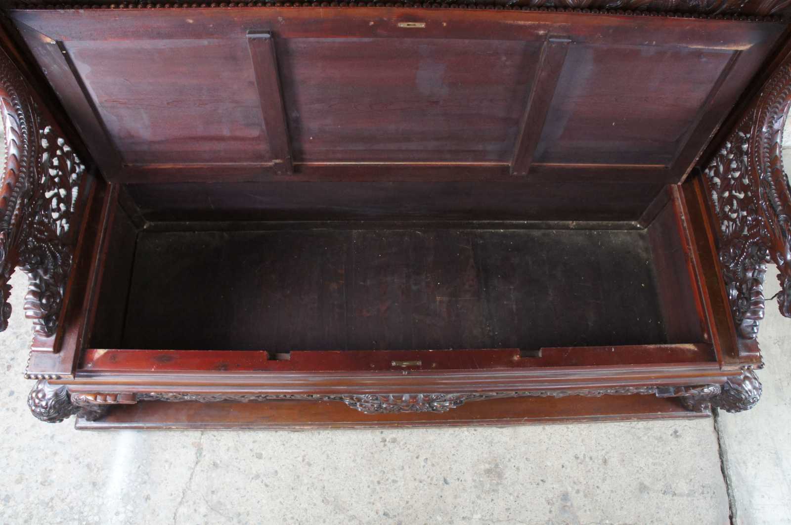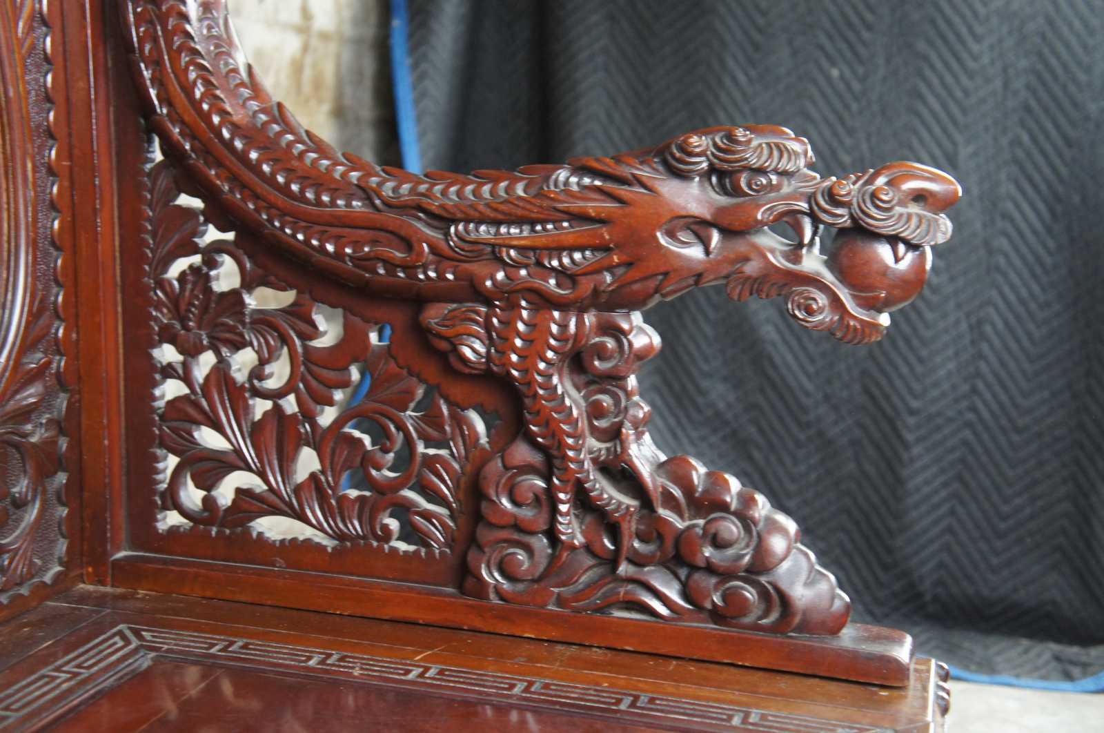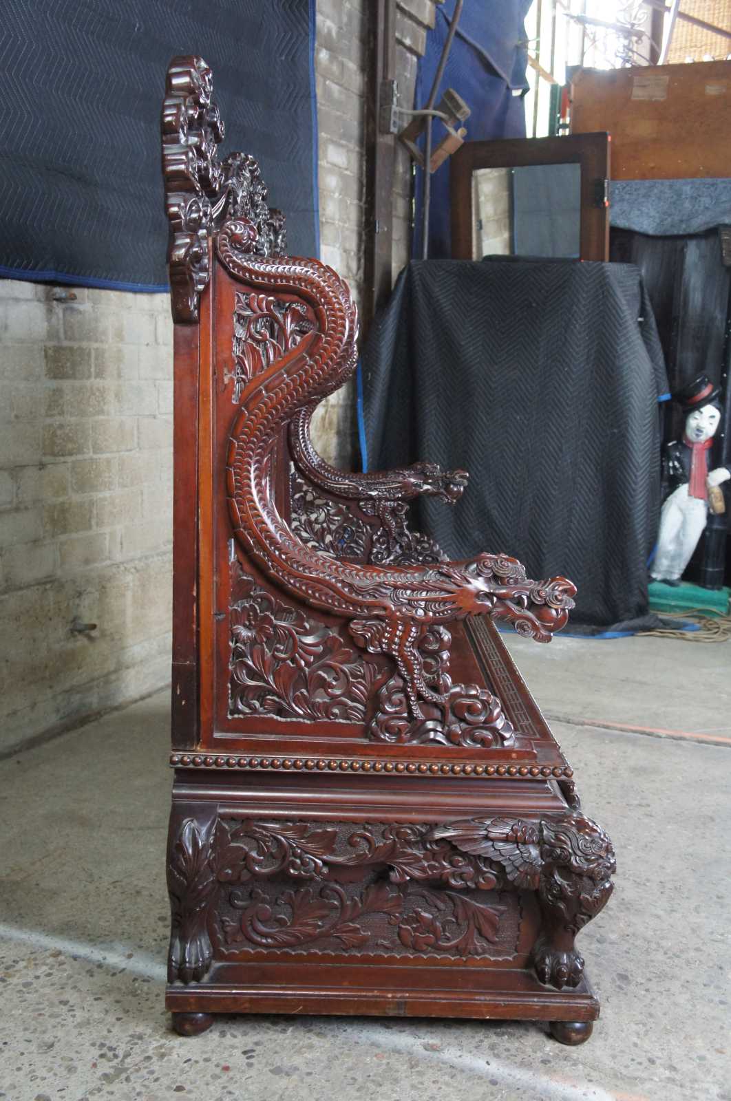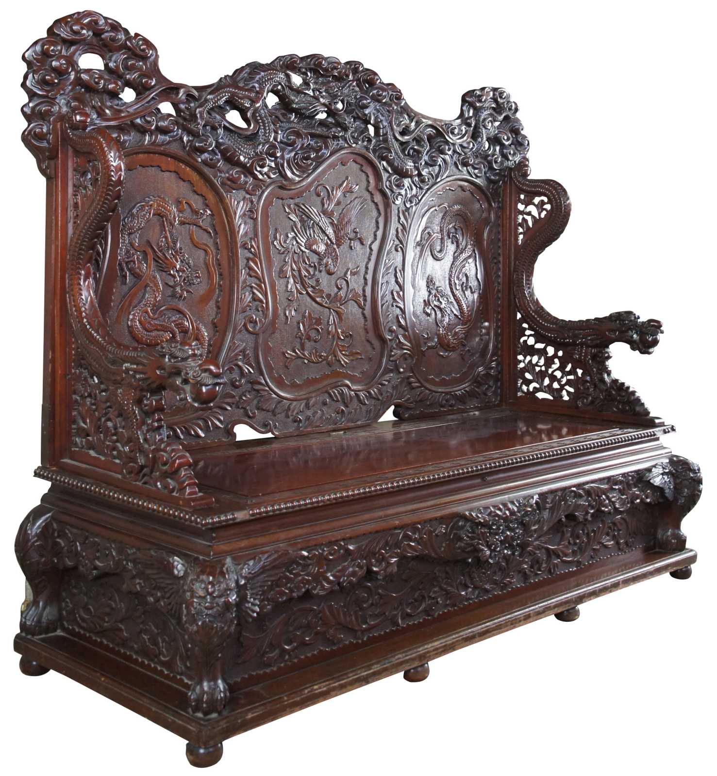 Imperial Japanese Meiji Period Dragon Bench. Features high relief carved accents and under seat storage. From top to bottom this piece is ordained with three toed dragons. The crown is pierced with a serpentine dragon sprawling through a field of clouds. The seat backing features three inset panels showing a phoenix centered between two inward facing dragons. Backing is flanked by figural arms carved in the manner of gnarling dragon with thick scales and a ball in mouth over reticulated floral designs. The rectangular form base shows a dragon face at the center and winged dragons over ball and claw foot along the corners, offset by a floral pattern in between. Base is supported by bun feet. An exquisite design that will make a statement in any setting.