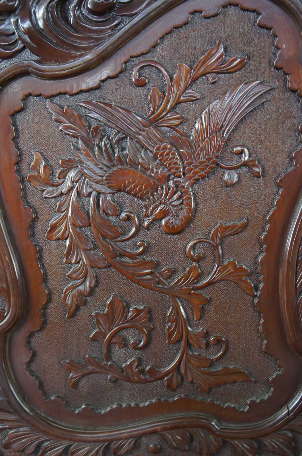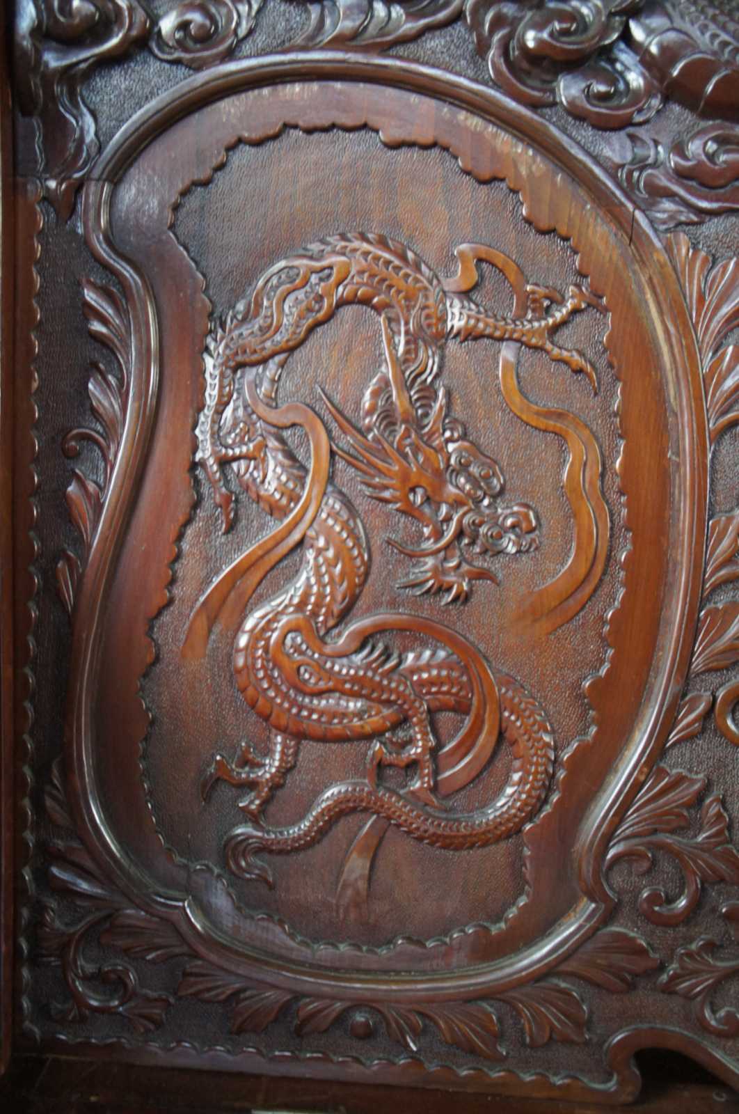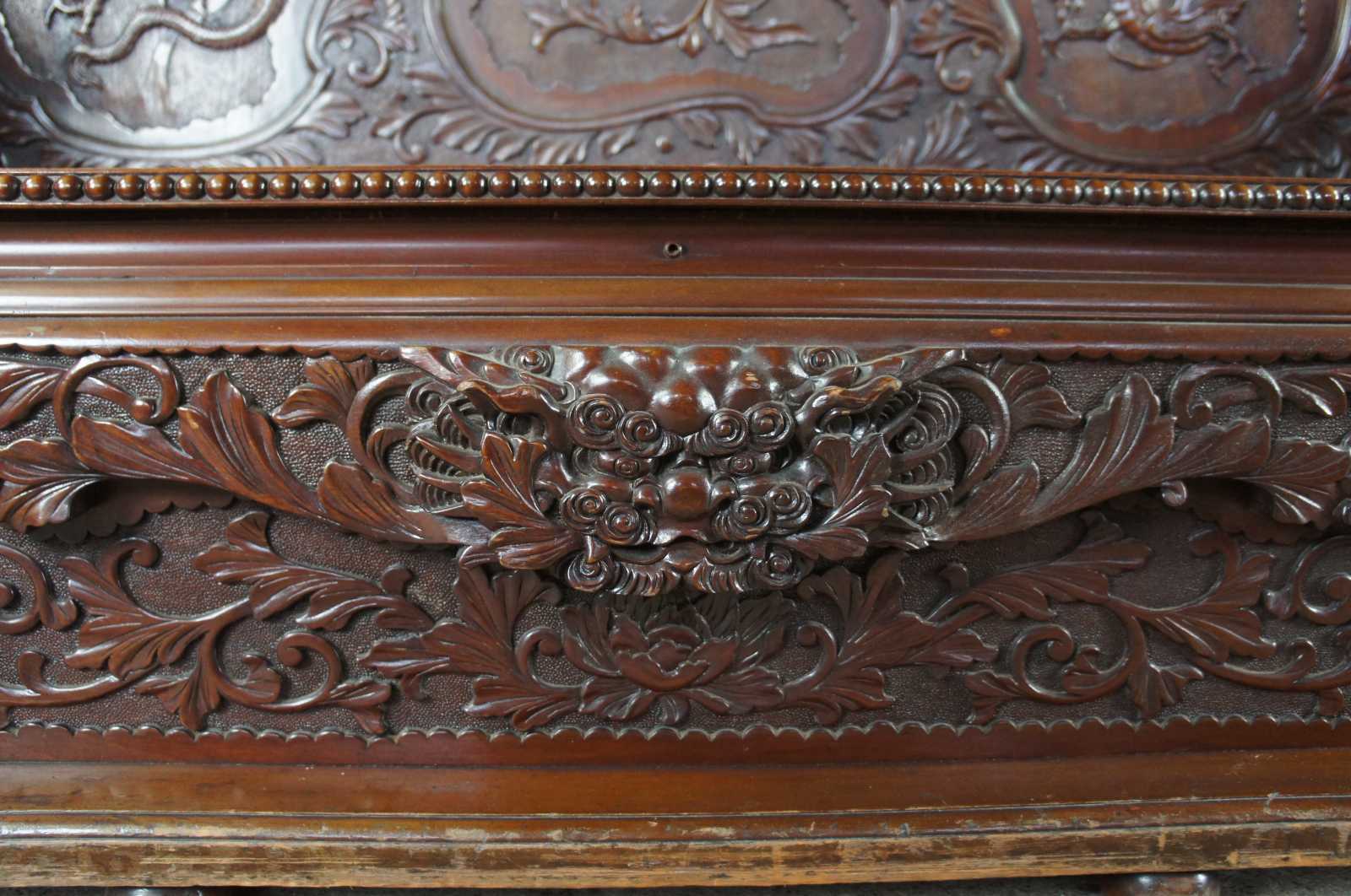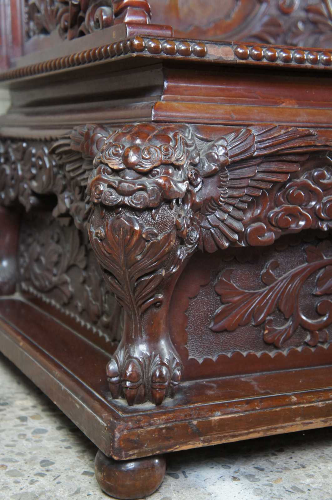 Imperial Japanese Meiji Period Dragon Bench. Features high relief carved accents and under seat storage. From top to bottom this piece is ordained with three toed dragons. The crown is pierced with a serpentine dragon sprawling through a field of clouds. The seat backing features three inset panels showing a phoenix centered between two inward facing dragons. Backing is flanked by figural arms carved in the manner of gnarling dragon with thick scales and a ball in mouth over reticulated floral designs. The rectangular form base shows a dragon face at the center and winged dragons over ball and claw foot along the corners, offset by a floral pattern in between. Base is supported by bun feet. An exquisite design that will make a statement in any setting.