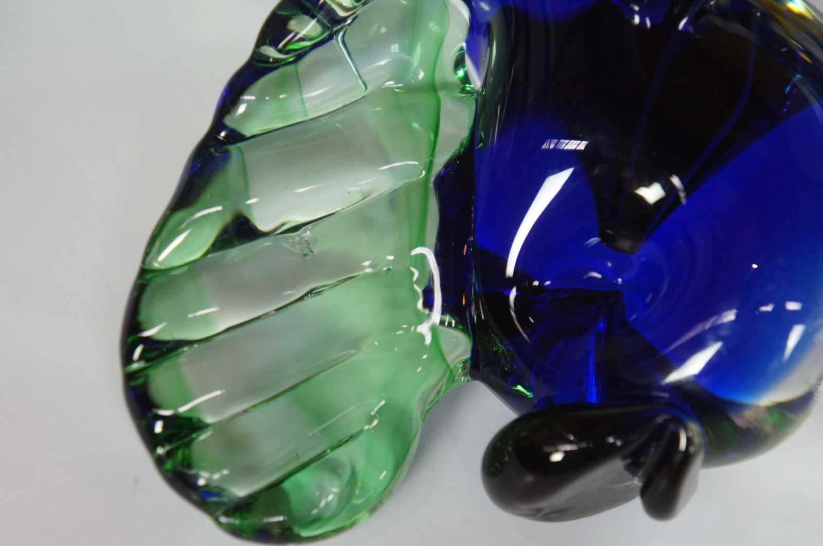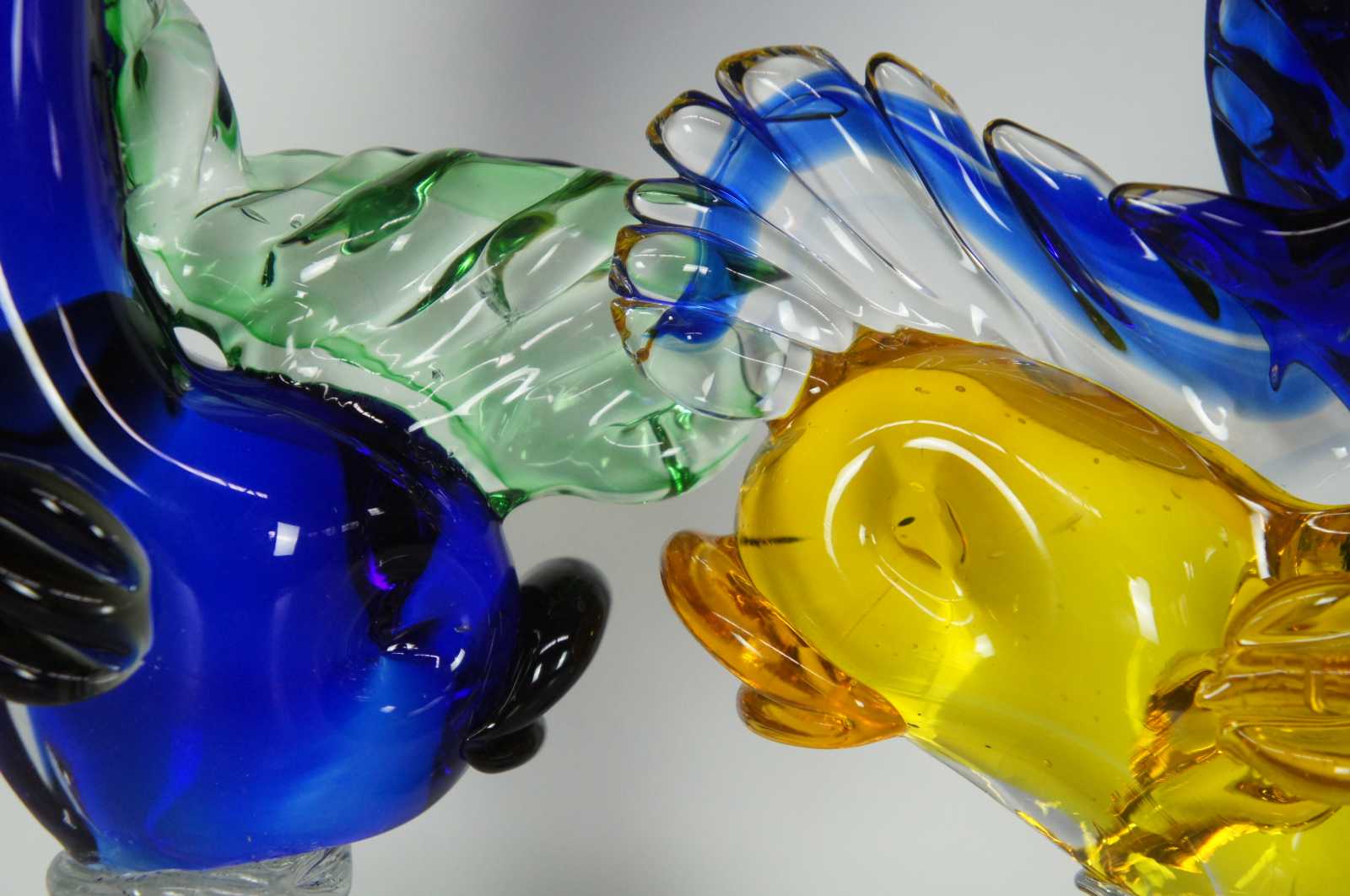 Set of three mid century hand crafted Murano Sommerso art glass sculptures in the shape of fish with pronounced dorsal fins and long swirling tails.