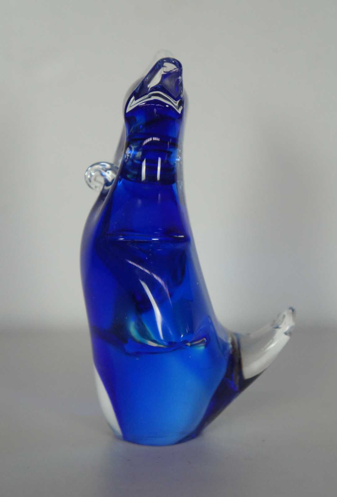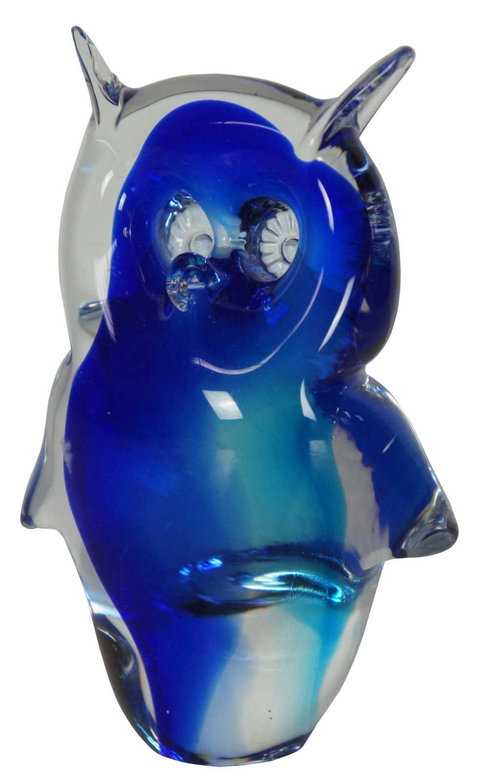Hand blown Italian art glass figurine of a small blue horned owl with curling beak and deeply set cane eyes.